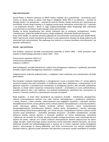 Opis nieruchomości Zamek Nowy w Płotach położony na 495/5 działce znajduje się w południowo - wschodniej części miasta, na skraju skarpy w zakolu rzeki Regi w odległości około 300 m na północny – wschód od Starego Zamku i na południowy – wschód od centrum Płotów. Zespół zamkowy jest usytuowany po wschodniej stronie drogi krajowej nr 6 będącej kontynuacją niemieckiej autostrady A11 i tworząca z nią połączenie Szczecin – Berlin w ciągu międzynarodowego szlaku drogowego E28. Lokalizacja nieruchomości w warunkach analizowanego rynku jest korzystna. Działka na której posadowiony jest zamek uzbrojona jest w przyłącze: energetyczne, wodne i kanalizacyjne. Dojazd do działki korzystny z drogi urządzonej. Otoczenie działki jest korzystne. Przez teren działki, na odcinku od bramy głównej do nieruchomości oznaczonych jako działki 495/6, 495/7 wyznaczone zostały służebności gruntowe w celu zapewnienia dostępu do drogi publicznej dla właścicieli tych nieruchomości. Nie wpływają one istotnie na zmianę charakteru nieruchomości i jej sposobu użytkowania. Zamek - opis techniczny Rok budowy: najstarsze skrzydło (renesansowe) powstało w latach 1606 – 1618, pozostała część zespołu rezydencyjnego powstała w latach 1910 – 1912. Powierzchnia użytkowa: 3507,4 m2. Powierzchnia zabudowy: 1683 m2. Kubatura: 21200 m3. Ilość kondygnacji: skrzydło południowe 2 piętra (trzy kondygnacje nadziemne + poddasze), pozostałe skrzydła 1 piętro (dwie kondygnacje nadziemne + poddasze). Podpiwniczenie: budynek podpiwniczony, z wyjątkiem części położonej przy południowym skrzydle (pod hallem). Rzut budynku: budowla trójskrzydłowa, o nieregularnym rzucie w kształcie litery „C”, korpus główny zwrócony fasadą w kierunku zachodnim, w środkowej części dwu i półtaktowy, z usytuowanym na osi głównym wejściem o ośmiobocznym westybulem w kondygnacji parteru, jako skrzydło południowe włączony w obręb całości najstarszy renesansowy budynek – prostokątny w rzucie, jednotraktowy, skrzydło północne dwu i pól traktowe, rzut budowli kształtowany swobodnie bez zachowania osi symetrii, z licznymi ryzalitami o różnorodnych formach i kształtach. Bryła budynku: w bryle silnie wyodrębnia się najstarsze skrzydło – południowe, dwupiętrowe, nakryte czterospadowym dachem oraz część nowsza, jednopiętrowa z poddaszem użytkowym, z wieżą, złożone z wielu członów, zróżnicowanych pod względem wysokości i nakrytych dachami skomplikowanej formie, korpus główny zamku nakryty dachem dwuspadowym o znacznej wysokości, ryzalit mieszczący główne wejście przykryty dachem łamanym, wieża neobarokowym dwukondygnacyjnym ośmiobocznym hełmem, osobne dachy, dwuspadowy i łamany nakrywają ryzality elewacji tylnej korpusu głównego, zaś o wiele niższym, trójspadowym dachem nakryta została narożna część południowo – wschodnia pomiędzy korpusem i skrzydłem południowym, skrzydło północne zostało nakryte dachem o stromych spadkach od strony południowej, zachodniej i północnej, od zachodu do krótszej elewacji skrzydła przylega parterowa cześć mieszcząca boczne wejście do zamku, nakryte ono zostało osobnym dwuspadowym dachem poprzecznym do dachu całego skrzydła, ryzalit bocznego wejścia zwieńczony został niewielkim dachem łamanym, od strony północnej skrzydło jest jednokondygnacyjne o wyższej niż w innych częściach zamku kondygnacji parteru, mieszczącego tu dawną bibliotekę, nad która rozmieszczono trzy nakryte trójdzielnymi daszkami lukarny, ogromna połać dachowa nad lukarnami przerwana została świetlikami w kształcie „wolich oczu”, osobnym dwuspadowym dachem nakryty jest ryzalit usytuowany w narożniku pomiędzy skrzydłem północnym a szczytową ścianą korpusu głównego. Elewacje: fasada części głównej posiada reprezentacyjny charakter, przy czym wejście znajdujące się w części środkowej nakryte jest ośmiobocznym dachem, od strony północnej przylega czworoboczna wieża zegarowa. Wejście do zamku zaakcentowane zostało łukowo sklepionym portalem. W narożniku pomiędzy wieżą a skrzydłem północnym zlokalizowane są wysokie okna oświetlające klatkę schodową. Od strony dziedzińca elewacja skrzydła południowego, na wysokości parteru, w narożniku znajduje się płyta nagrobna Vadiego von dem Osten i jego zony Anny von Massow. W północno zachodnim narożniku skrzydła północnego umieszczona jest płyta erekcyjna Nowego Zamku 1910 roku. Od strony wschodniej istotnym elementem jest wielopoziomowy taras, połączony schodami. Wnętrze: z głównego wejścia wnętrze zamku dostępne jest przez westybul na planie poprzecznie usytuowanego, nieregularnego ośmiokąta. Na prawo od westybuli położny jest hall o skomplikowanym rzucie wynikającym z kształtu sąsiednich pomieszczeń. Składa się on z przedniej, nieregularnej w rzucie części nakrytej sklepieniami o nieregularnych podziałach oraz z tylnej części prostokątnej. Z częścią przednia łączy się wyniesiony ponad nią podest wykusza oświetlony dwoma oknami frontowej elewacji Sklepienia tej części wsparte są na betonowych kolumnach o gładkich, wybrzuszonych trzonach, które dodatkowo ozdobione są motywem lwiej głowy oraz głowy barana. W narożniku przedniej części hallu znajduje się kominek. Na ścianie paleniska umocowana jest płyta przedstawiająca Dawida z głową Goliata. W górnej części hallu znajduje się wejście na korytarz, główną klatkę schodową oraz do pomieszczeń reprezentacyjnych tylnego traktu - Sali gobelinowej (neorenesansowe drzwi fornirowane w bogatej oprawie) i do buduaru „różowego” ( usytuowane w półkoliście wygiętym sklepieniu sufitu). W dolnej części hall łączy się ze starym renesansowym skrzydłem, tj. z wąskim przedsionkiem klatki schodowej oraz kwadratowym w rzucie przedsionkiem głównej sali skrzydła. Od strony pó