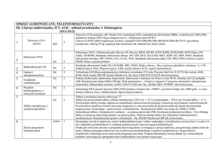 SPRZĘT AUDIOWIZUANY, TELEINFORMATYCZNY III. 3.Sprzęt audiowizualny, ICT, AGD – oddział przedszkolny w Zielonejgórze (ZG1,ZG2) 1 Telewizor LCD + uchwyt Kpl 2 Odtwarzacz DVD 2 3 4 5 6 Szt 2 Radioodtwarzacz CD Szt 2 Laptop z oprogramowaniem Szt 2 Szt 2 Szt. 2 Szt 2 zestaw 1 Urządzenie wielofunkcyjne Projektor krótkoogniskowy z uchwytem ściennym 7 Tablica interaktywna z zestawem głośników 8 Zestaw programów interaktywnych Telewizor LCD przekątna „40” format 16:9, technologia LED, częstotliwość odświeżania 200Hz, rozdzielczość 1920x1080, dodatkowe funkcje WIFI, klasa energetyczna A+, wbudowany tuner DVB-T Uchwyt LCD/PLASMA regulowany (czarny)- standard VESA 200x200,100x100,50x50,200x100,75x75 ,typ uchwyt ścienny,max. udźwig 25 kg ,regulacja kąta nachylenia tak ,materiał stal ,kolor czarny Odtwarzacz DVD - Odtwarzanie płyt: Blu-ray 3D, Blu-ray, BD-R, BD-RE, DVD+R/RW, DVD-R/RW, DVD Video, CDAudio, CD-R/RW, Standardy odtwarzania obrazu: AVC-HD, DivX, DivX HD, MKV, 3GPP, AVI, MP4, WMV, Standardy odtwarzania dźwięku: MP3, WMA, AAC, FLAC, WAV, Standardy odtwarzania zdjęć: GIF, JPEG, PNG, Cyfrowe wyjście HDMI, Menu w języku polskim Standardy odtwarzania Audio CD, CD-R/RW, MP3, WMA, Radio cyfrowe , Moc wyjściowa głośników minimum 2 x 5 W, Podbicie basów, Pilot, Wejścia/wyjścia USB, wejście liniowe AUX, wyjście słuchawkowe Technologia LED,Ekran pojemnościowy (dotykowy) przekątna 15,5 cala. Procesor Intel Cor i3-3217U lub wyższy. 6GBRAM. Dysk twardy 500 GB. System Windows 8. Np. Sony VAIO SVF1521F2E lub równoważny. Funkcje drukowania, skanowania, kopiowania, faksowania w formacie A4. Praca w sieci Wi-Fi. Interfejs usb 2,0, podajnik ADF. Rozdzielczość druku 6000x1200 dpi. Druk atramentowy – 4 kolory z zapasem 2 zestawów atramentów (akceptowane zamienniki). Maksymalne wymiary wxdxh: 410x375x180 mm. Np. „Brother MFC-J470DW” lub równoważny. Technologia DLP, jasność powyżej 2800 ANSI lumenów, kontrast min. 15000:1, żywotność lampy min. 6000 godz., w cenie montaż sufitowy wraz z okablowaniem. Opcja bezprzewodowa. Tablica o przekątnej obszaru roboczego 77” Efektywna powierzchnia tablicy (obszar interaktywny) 156,5 cm × 117,2 cm (przekątna – 195,6 cm). Format tablicy – 4 / 3. Powierzchnia tablicy twarda, odporna na uszkodzenia, dostosowana do projekcji i pisania po niej pisakami suchościeralnymi. Powierzchnia umożliwia również używanie magnesów w celu mocowania do jej powierzchni np. kartek (powierzchnia magnetyczna). Technologia – podczerwieni, wielodotykowa. Rozdzielczość tablicy nie mniej niż 32000 x 32000. Komunikacja tablicy z komputerem i zasilanie – za pomocą przewodu USB. Gwarancja producenta na tablicę– 5 lat. Obsługa tablicy za pomocą załączonego pisaka i za pomocą palca. Pisak do obsługi tablicy bez elementów elektronicznych i mechanicznych. Rozpoznawanie gestów wielodotyku. Np. SMART Board serii 400 lub równoważna. Harmonijny rozwój to najnowszy zestaw multimedialnych gier i zabaw wspierający wszechstronny rozwój dzieci w wieku 5-6 lat z oddziałów przedszkolnych w szkołach podstawowych i starszych grup przedszkolnych. Atrakcyjne ćwiczenia zawarte w programie aktywizują dzieci i oswajają je z pracą zespołową, przygotowując jednocześnie do nauki. Zadania pomagają realizować cele wychowania przedszkolnego z podstawy programowej i mogą stanowić uzupełnienie wybranego przez nauczyciela programu nauczania. Program Harmonijny rozwój składa się z różnorodnych modułów zawierających oprogramowanie multimedialne oraz pomoce tradycyjne: 1 • Mowa i pismo • Poznawanie i rozumienie • Twórczość i konstrukcje • Przyroda • Ekologia • Zmysły i ruch • Liczenie i mierzenie Wszystkie elementy zestawu wykorzystują naukę przez zabawę umożliwiającą dzieciom współdziałanie, eksperymentowanie, twórczą ekspresję i ruch, nie zaniedbując też ćwiczeń samokontroli oraz koncentracji. Zestaw dla przedszkola Płyta z programem Harmonijny Rozwój zawiera: • 21 gier i zabaw grupowych na tablice multimedialne, • 42 karty pracy do wydrukowania. Wielkowymiarowa gra „Segregacja odpadów” Gra wielkowymiarowa pozwala na zaangażowanie w zabawę całej grupy. Poprzez wspólne działanie, przeżywanie i aktywność dzieci uczą się szybciej i chętniej! Poradnik metodyczny. 42 karty pracy z licencją na kopiowanie. Zestaw programów interaktywnych zestaw 1 Task Magic program do tworzenia interaktywnych lekcji, ćwiczeń, quizów. Pakiet szablonów pozwalających przygotować interaktywne lekcje Ćwiczenia ruchowe „Klaszczę, tupię podskakuję” przeznaczony do tablic interaktywnych 2
