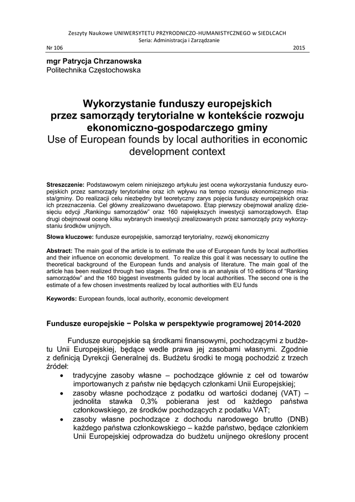 Zeszyty Naukowe UNIWERSYTETU PRZYRODNICZO-HUMANISTYCZNEGO w SIEDLCACH Seria: Administracja i Zarządzanie Nr 106 2015 mgr Patrycja Chrzanowska Politechnika Częstochowska Wykorzystanie funduszy europejskich przez samorządy terytorialne w kontekście rozwoju ekonomiczno-gospodarczego gminy Use of European founds by local authorities in economic development context Streszczenie: Podstawowym celem niniejszego artykułu jest ocena wykorzystania funduszy europejskich przez samorządy terytorialne oraz ich wpływu na tempo rozwoju ekonomicznego miasta/gminy. Do realizacji celu niezbędny był teoretyczny zarys pojęcia funduszy europejskich oraz ich przeznaczenia. Cel główny zrealizowano dwuetapowo. Etap pierwszy obejmował analizę dziesięciu edycji „Rankingu samorządów” oraz 160 największych inwestycji samorządowych. Etap drugi obejmował ocenę kilku wybranych inwestycji zrealizowanych przez samorządy przy wykorzystaniu środków unijnych. Słowa kluczowe: fundusze europejskie, samorząd terytorialny, rozwój ekonomiczny Abstract: The main goal of the article is to estimate the use of European funds by local authorities and their influence on economic development. To realize this goal it was necessary to outline the theoretical background of the European funds and analysis of literature. The main goal of the article has been realized through two stages. The first one is an analysis of 10 editions of “Ranking samorządów” and the 160 biggest investments guided by local authorities. The second one is the estimate of a few chosen investments realized by local authorities with EU funds Keywords: European founds, local authority, economic development Fundusze europejskie − Polska w perspektywie programowej 2014-2020 Fundusze europejskie są środkami finansowymi, pochodzącymi z budżetu Unii Europejskiej, będące wedle prawa jej zasobami własnymi. Zgodnie z definicją Dyrekcji Generalnej ds. Budżetu środki te mogą pochodzić z trzech źródeł: tradycyjne zasoby własne – pochodzące głównie z ceł od towarów importowanych z państw nie będących członkami Unii Europejskiej; zasoby własne pochodzące z podatku od wartości dodanej (VAT) – jednolita stawka 0,3% pobierana jest od każdego państwa członkowskiego, ze środków pochodzących z podatku VAT; zasoby własne pochodzące z dochodu narodowego brutto (DNB) każdego państwa członkowskiego – każde państwo, będące członkiem Unii Europejskiej odprowadza do budżetu unijnego określony procent 24 P. Chrzanowska DNB; obecnie jest to największe źródło dochodów budżetu Unii Europejskiej1. Z funduszami europejskimi związane są ściśle określone zasady finansowe. Odnoszą się one przede wszystkim do sposobu, w jaki są one wykorzystywane. Do najważniejszych zaliczają się: zasada współfinansowania oraz zasada oceny2. Zasada finansowania oznacza, że środki z unijnego budżetu nie mogą zastępować środków krajowych, a jedynie uzupełniać je. Każde państwo członkowskie ma obowiązek przeznaczyć w danym okresie planowania taką ilość środków, która będzie równa wysokości wydatków poniesionych w poprzednim okresie. Poziom wydatków określany jest na podstawie decyzji Komisji (w ramach Narodowej Strategii Spójności) z uwzględnieniem warunków ekonomicznych danego państwa członkowskiego oraz wydatków strukturalnych poniesionych w poprzedniej perspektywie programowej3. Ponadto Komisja przeprowadza trzykrotną weryfikację zasady współfinansowania: ocenę ex ante – przeprowadzaną przed rozpoczęciem realizacji NSS; ocenę w połowie okresu programowania oraz ocenę ex post – po zakończeniu realizacji NSS. Zasadą dodatkowości nie jest objęty Fundusz Spójności – przepisy mające do niego zastosowanie określone są w zasadzie warunkowości. Fundusze europejskie można podzielić na Fundusz Spójności oraz fundusze strukturalne, do których zalicza się: Europejski Fundusz Społeczny (EFS) Europejski Fundusz Rozwoju Regionalnego (EFRR). Fundusz Spójności nie należy do grupy funduszy strukturalnych i jest instrumentem finansowo-ekonomicznym, wdrażanym na poziomie państw, a nie regionów. Jego podstawowym celem jest redukcja dysproporcji pomiędzy słabiej rozwiniętymi krajami Unii Europejskiej przede wszystkim poprzez wspieranie rozwoju infrastruktury transportowej oraz ochrony środowiska. Beneficjentem może zostać taki kraj członkowski Unii Europejskiej, którego dochód narodowy brutto (DNB) w przeliczeniu na mieszkańca nie przekracza 90% średniego poziomu w Unii Europejskiej4. W poprzedniej perspektywie programowej (2007 – 2013) wskaźnik ten wynosił 75% 5. Obecnie, tj. w latach 2014-2020 beneficjentami Fundusz Spójności będą takie państwa, jak: Bułgaria, Chorwacja, Cypr, Estonia, Grecja, Czechy, Malta, Łotwa, Litwa, Portugalia, Polska, Słowacja, Rumunia, Słowenia oraz Węgry. Istnieją też takie kraje Unii Europejskiej, w których tylko wybrane regiony otrzymają środki z unijnego budżetu. Do takowych należą między innymi wschodnie Niemcy. Europejski Fundusz Rozwoju Regionalnego jest instrumentem mającym na celu wzmocnienie spójności społeczno-gospodarczej Unii Europejskiej 1 European Commission: Financial Programming and Budget, 05.02.2014, http://ec.europa.eu/budget/mff/resources/index_en.cfm [odczyt: 12.04.2014] 2 E. Kornberger-Sokołowska, J. Zdanukiewicz, R. Cieślak, Jednostki samorządu terytorialnego jako beneficjenci środków europejskich, Oficyna a Wolters Kluwer business, Warszawa 2012, s. 90. 3 E. Kornberger-Sokołowska, J. Zdanukiewicz, R. Cieślak, Jednostki samorządu terytorialnego…, op. cit., s. 90. 4 http://funduszeeuropejskie.gov.pl [odczyt: 15.05.2014] 5 E. Kornberger-Sokołowska, J. Zdanukiewicz, R. Cieślak, Jednostki samorządu terytorialnego…, op. cit., s. 87. Seria: Administracja i Zarządzanie (33) 2015 ZN nr 106 Wykorzystanie funduszy europejskich przez samorządy terytorialne… 25 poprzez 