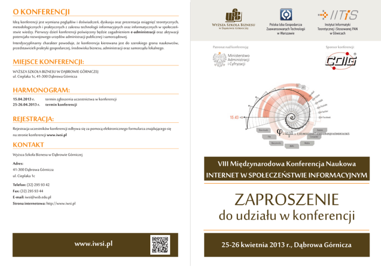 O KONFERENCJI Ideą konferencji jest wymiana poglądów i doświadczeń, dyskusja oraz prezentacja osiągnięć teoretycznych, metodologicznych i praktycznych z zakresu technologii informacyjnych oraz informatycznych w społeczeństwie wiedzy. Pierwszy dzień konferencji poświęcony będzie zagadnieniom e-administracji oraz aktywacji potencjału rozwojowego urzędów administracji publicznej i samorządowej. Interdyscyplinarny charakter powoduje, że konferencja kierowana jest do szerokiego grona naukowców, przedstawicieli praktyki gospodarczej, środowiska biznesu, administracji oraz samorządu lokalnego. Polska Izba Gospodarcza Zaawansowanych Technologii w Warszawie Patronat nad konferencją: Instytut Informatyki Teoretycznej i Stosowanej PAN w Gliwicach Sponsor konferencji: MIEJSCE KONFERENCJI: WYŻSZA SZKOŁA BIZNESU W DĄBROWIE GÓRNICZEJ ul. Cieplaka 1c, 41-300 Dąbrowa Górnicza HARMONOGRAM: 15.04.2013 r. termin zgłoszenia uczestnictwa w konferencji 25-26.04.2013 r. termin konferencji REJESTRACJA: Rejestracja uczestników konferencji odbywa się za pomocą elektronicznego formularza znajdującego się na stronie konferencji www.iwsi.pl KONTAKT Wyższa Szkoła Biznesu w Dąbrowie Górniczej VIII Międzynarodowa Konferencja Naukowa INTERNET W SPOŁECZEŃSTWIE INFORMACYJNYM Adres: 41-300 Dąbrowa Górnicza ul. Cieplaka 1c Telefon: (32) 295 93 42 Fax: (32) 295 93 44 E-mail: [email protected] Strona internetowa: http://www.iwsi.pl www.iwsi.pl ZAPROSZENIE do udziału w konferencji 25-26 kwietnia 2013 r., Dąbrowa Górnicza PROGRAM KONFERENCJI Internet w Społeczeństwie Informacyjnym Dzień II - 26.04.2013 (piątek) PROGRAM KONFERENCJI 9:00 - 9:30 Rejestracja (III piętro przy Audytorium C) 9:30 - 9:45 Rozpoczęcie i powitanie (Audytorium C) - prof. dr hab. inż. Ryszard Pregiel 9:15 - 12:20 Internet w Społeczeństwie Informacyjnym Dzień I - 25.04.2013 (czwartek) 10:00 - 10:45 Rejestracja uczestników (Audytorium Maximum) 10:45 - 11:00 Otwarcie konferencji, powitanie gości - JM Rektor Wyższej Szkoły Biznesu prof. Zdzisława Dacko-Pikiewicz 11:00 - 11:30 „E-administracja jako instrument doskonalenia warunków prowadzenia działalności gospodarczej” - Sebastian Christow, dyrektor Departamentu Społeczeństwa Informacyjnego Ministerstwa Gospodarki 11:30 - 12:00 „Europejska Agenda Cyfrowa w planach polskich instytucji rządowych na lata 2014-2020” - Włodzimierz Marciński, wicedyrektor Departamentu Społeczeństwa Informacyjnego Ministerstwa Administracji i Cyfryzacji 12:00 - 12:30 „Decyzja administracyjna w postaci elektronicznej- fikcja czy rzeczywistość?„ - dr Michał Gramatyka, ENEA 12:30 - 13:00 Przerwa kawowa 13:00 - 13:30 „Systemy zarządzania gminą w chmurze„ - Tadeusz Gembalczyk, COIG S.A. 13:30 - 14:00 “ePUAP i elektroniczne usługi administracji publicznej“ - Igor Bednarski, Centrum Projektów Informatycznych, Kierownik Projektu EPUAP 2 14:00 - 14:30 „Dekalog chmuroluba” - Urszula Góral, Dyrektor Departamentu Edukacji Społecznej Współpracy Międzynarodowej GIODO 14:30 - 15:15 15:15 - 15:30 10:30 – 10:50 Sesja ogólna - Architektura i Bezpieczeństwo Systemów Komputerowych prowadzenie: prof. dr hab. inż. Jerzy Klamka (Audytorium C) „Kryptografia w zastosowaniu do podpisu cyfrowego i identyfikacji użytkownika w intersieci” - prof. dr hab. inż. Andrzej Grzywak, prof. dr hab inż. Jerzy Klamka, dr inż. Paweł Buchwald, dr inż. Piotr Pikiewicz, dr inż. Maciej Rostański, dr inż. Marcin Sobota (Wyższa Szkoła Biznesu w Dąbrowie Górniczej) „Business processes management in an intelligent organization on the example of WSEI” - dr Danuta Kajrunajtys, dr Marek Szarucki (Wyższa Szkoła Ekonomii i Informatyki w Krakowie) „Some aspects of information security and business continuity in public administration” - Andrzej Białas (Instytut Technik Innowacyjnych EMAG) "Large Personal Data Sets Exploration" - Takac L., Zabovsky M. (Zilinska univerzita v Ziline) „AQM algorithms for aggressive networks streams” - Adam Domański, Joanna Domańska, Jerzy Klamka (Politechnika Śląska) Przerwa kawowa „The classification of text documents in Polish language by using Latent Semantic Analysis for extracted information” - dr hab. Bożena Śmiałkowska, mgr inż. Marcin Gibert (Zachodniopomorski Uniwersytet Technologiczny w Szczecinie) „Active queues management algorithms with the use of fluid flow approximation in CUDA environment” - Adam Domański, Joanna Domańska, Tadeusz Czachórski (IITiS PAN w Gliwicach) „Przyspieszenie obliczeń numerycznych w symulacjach dynamiki molekularnej na procesorach graficznych CUDA” - dr hab. Aleksander Dawid (Wyższa Szkoła Biznesu w Dąbrowie Górniczej) „Risk management in the computer aided business continuity and information security management system” - mgr inż. Jacek Bagiński (Instytut Technik Innowacyjnych EMAG) 12:20 - 12:40 Przerwa kawowa 12:40 - 13:40 Lunch (klub AMIGO) Panel dyskusyjny - „Krytyka informatycznego rozumu: algorytmy i granice w społeczeństwie sieci” W jakim stopniu struktura naszych umysłów kształtowana jest przez twórców algorytmów? Na ile nowoczesne techniki cyfrowe narzucają nam sposoby poznawania świata, a nawet przedmioty, które jesteśmy w stanie poznać? 13:40 - 14:20 Przerwa obiadowa Zakończenie I-go dnia Konferencji 14:20 - 17:20 Sesja 2A - sala 321 Komputerowe Systemy Zarządzania i Sterowania prowadzenie: dr inż. Piotr Pikiewicz Rejestracja: www.iwsi.pl ok. 15:45 17:30 Przerwa kawowa Zakończenie Konferencji Sesja 2B - sala 324 Zastosowania Internetu i Systemów Komputerowych prowadzenie: dr inż. Maciej Rostański