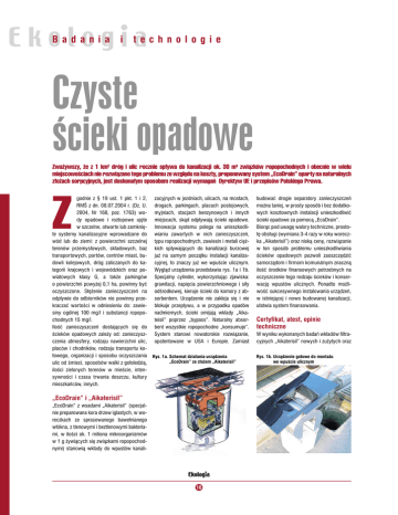 B a da n i a i t e c h n o l o g i e Czyste ścieki opadowe Zważywszy, że z 1 km2 dróg i ulic rocznie spływa do kanalizacji ok. 30 m3 związków ropopochodnych i obecnie w wielu miejscowościach nie rozwiązano tego problemu ze względu na koszty, proponowany system „EcoDrain” oparty na naturalnych złożach sorpcyjnych, jest doskonałym sposobem realizacji wymagań Dyrektyw UE i przepisów Polskiego Prawa. Z godnie z § 19 ust. 1 pkt. 1 i 2, RMŚ z dn. 08.07.2004 r. (Dz. U. 2004, Nr 168, poz. 1763) wody opadowe i roztopowe ujęte w szczelne, otwarte lub zamknięte systemy kanalizacyjne wprowadzane do wód lub do ziemi: z powierzchni szczelnej terenów przemysłowych, składowych, baz transportowych, portów, centrów miast, budowli kolejowych, dróg zaliczanych do kategorii krajowych i wojewódzkich oraz powiatowych klasy G, a także parkingów o powierzchni powyżej 0,1 ha, powinny być oczyszczone. Stężenie zanieczyszczeń na odpływie do odbiorników nie powinny przekraczać wartości w odniesieniu do: zawiesiny ogólnej 100 mg/l i substancji ropopochodnych 15 mg/l. Ilość zanieczyszczeń dostających się do ścieków opadowych zależy od: zanieczyszczenia atmosfery, rodzaju nawierzchni ulic, placów i chodników, rodzaju transportu kołowego, organizacji i sposobu oczyszczania ulic od śmieci, sposobów walki z gołoledzią, ilości zielonych terenów w mieście, intensywności i czasu trwania deszczu, kultury mieszkańców, innych. zacyjnych w jezdniach, ulicach, na mostach, drogach, parkingach, placach postojowych, myjniach, stacjach benzynowych i innych miejscach, skąd odpływają ścieki opadowe. Innowacja systemu polega na unieszkodliwianiu zawartych w nich zanieczyszczeń, typu ropopochodnych, zawiesin i metali ciężkich spływających do kanalizacji burzowej już na samym początku instalacji kanalizacyjnej, to znaczy już we wpuście ulicznym. Wygląd urządzenia przedstawia rys. 1a i 1b. Specjalny cylinder, wykorzystując zjawiska: grawitacji, napięcia powierzchniowego i siły odśrodkowej, kieruje ścieki do komory z absorbentem. Urządzenie nie zakleja się i nie blokuje przepływu, a w przypadku opadów nadmiernych, ścieki omijają wkłady „Aikateisil” poprzez „bypass”. Naturalny absorbent wszystkie ropopochodne „konsumuje”. System stanowi nowatorskie rozwiązanie, opatentowane w USA i Europie. Zamiast Rys. 1a. Schemat działania urządzenia „EcoDrain” ze złożem „Aikaterisil” „EcoDrain” i „Aikaterisil” „EcoDrain” z wsadami „Aikaterisil” (specjalnie preparowana kora drzew iglastych, w woreczkach ze sprasowanego bawełnianego włókna, z tlenowymi i beztlenowymi bakteriami, w ilości ok. 1 miliona mikroorganizmów w 1 g żywiących się związkami ropopochodnymi) stanowią wkłady do wpustów kanali- 16 budować drogie separatory zanieczyszczeń można taniej, w prosty sposób i bez dodatkowych kosztownych instalacji unieszkodliwić ścieki opadowe za pomocą „EcoDrain”. Biorąc pod uwagę walory techniczne, prostotę obsługi (wymiana 3-4 razy w roku woreczka „Aikaterisil”) oraz niską cenę, rozwiązanie w ten sposób problemu unieszkodliwiania ścieków opadowych pozwoli zaoszczędzić samorządom i firmom komunalnym znaczną ilość środków finansowych potrzebnych na oczyszczenie tego rodzaju ścieków i konserwację wpustów ulicznych. Ponadto możliwość sukcesywnego instalowania urządzeń, w istniejącej i nowo budowanej kanalizacji, ułatwia system finansowania. Certyfikat, atest, opinie techniczne W wyniku wykonanych badań wkładów filtracyjnych „Aikaterisil” nowych i zużytych oraz Rys. 1b. Urządzenie gotowe do montażu we wpuście ulicznym Wskaźnik pH Jednostka 1 2 3 4 5 6 7 Najwyższe dopuszczalne wartości*) 7,4 8,0 6,6 6,7 7,9 7,1 8,0 6,5 – 8,5 ChZT 3 mgO2/dm 53,4 39,2 47,0 213,2 44,6 63,2 43,8 125 BZT5 mgO2/dm3 n.w. n.w. 4 36 n.w. 10 n.w. 25 mg/dm3 n.w. n.w. n.w. <0,5 n.w. n.w. <0,5 15 Cynk 3 mgZn/dm 0,067 0,055 0,128 0,167 0,043 0,214 0,085 2 Nikiel mgNi/dm3 0,029 0,027 0,074 0,086 0,111 0,023 0,027 0,5 Chrom ogólny mgCr/dm3 0,010 0,000 0,013 0,019 0,021 0,000 0,000 0,5 Miedź mgCu/dm3 0,068 0,083 0,059 0,050 0,034 0,118 0,095 0,5 Kadm mgCd/dm3 0,000 0,000 0,000 0,000 0,018 0,000 0,000 0,4(0,2)** Wanad mgV/dm3 0,000 0,102 n.w. 0,039 0,065 0,000 n.w. 2 Rtęć mgHg/dm3 <0,0003 <0,0003 <0,0003 <0,0003 <0,0003 <0,0003 <0,0003 0,06(0,03)** Ropopochodne – Woda deszczowa Tabela 1. Jakość wód deszczowych pobranych u wylotu kolektorów zbiorczych z ulic: Słonecznej, Klonowej, Bukowej i Morelowej próbek wód deszczowych, z dwóch zlewni w Płocku, po przejściu przez system „EcoDrain”, uzyskano Certyfikat Zgodności z warunkami zawartymi w RMŚ. Część wyników badań przedstawiono w tabeli 1. W Państwowym Zakładzie Higieny otrzymano Atest Higieniczny dopuszczający stosowanie w Polsce sorbentu ze złożem „Aikaterisil”. Ponadto uzyskano pozytywne opinie Instytutu Ochrony Środowiska i Instytutu Badawczego Dróg i Mostów, których istotą jest stwierdzenie, że urządzenia „EcoDrain” nie są trwale związane z jezdnią i nie podlegają przepisom ustawy „Prawo Budowlane” oraz nie wpływają na bezpieczeństwo ruchu drogowego, stanowiąc wyposażenie dodatkowe systemu kanalizacji. W związku z tym, w celu instalacji i montażu systemu „EcoDrain”, nie ma potrzeby uzyskiwania pozwoleń na budowę. pył, piasek, zawiesina ogólna, drobne zanieczyszczenia organiczne i nieorganiczne są zatrzymywane w kieszeniach pojemnika, przed przepływem przez złoże „Aikaterisil”. System stanowi doskonałą alternatywę dla urządzeń tradycyjnych, w szczególności tam, gdzie z różnych powodów (tereny zalewowe, ukształtowanie terenu lub cenne walory krajobrazowe) nie można wybudować podczyszczalni ścieków deszczowych zarówno dla nowo projektowanej kanalizacji, jak i już istniejącej oraz tam, gdzie procent powierzchni szczelnej wymagającej oczyszczenia zgodnie z