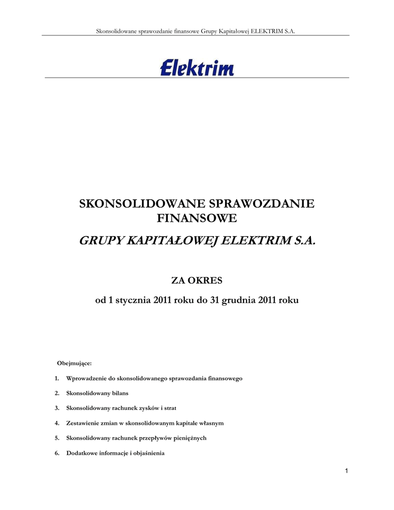 Skonsolidowane sprawozdanie finansowe Grupy Kapitałowej ELEKTRIM S.A. SKONSOLIDOWANE SPRAWOZDANIE FINANSOWE GRUPY KAPITAŁOWEJ ELEKTRIM S.A. ZA OKRES od 1 stycznia 2011 roku do 31 grudnia 2011 roku Obejmujące: 1. Wprowadzenie do skonsolidowanego sprawozdania finansowego 2. Skonsolidowany bilans 3. Skonsolidowany rachunek zysków i strat 4. Zestawienie zmian w skonsolidowanym kapitale własnym 5. Skonsolidowany rachunek przepływów pieniężnych 6. Dodatkowe informacje i objaśnienia 1 Skonsolidowane sprawozdanie finansowe Grupy Kapitałowej ELEKTRIM S.A. WPROWADZENIE DO SKONSOLIDOWANEGO SPRAWOZDANIA FINANSOWEGO 1. Podstawowe informacje na temat jednostki dominującej – Elektrim S.A. („Spółka“, „jednostka dominująca”) Adres siedziby: ul. Pańska 77/79 00-834 Warszawa REGON: 000144058 NIP: 526-020-77-46. Jednostka dominująca jest wpisana do Krajowego Rejestru Sądowego Sądu Rejonowego w Warszawie, XIX Wydział Gospodarczy Krajowego Rejestru Sądowego pod numerem KRS: 0000039329. Przedmiotem działalności Spółki w roku obrotowym zakończonym 31 grudnia 2011 roku były: - działalność holdingów, - wynajem nieruchomości. Od 1 stycznia 2010 r. Spółka pozostawała w upadłości. W związku z uprawomocnieniem się z dniem 31 grudnia 2010 roku postanowienia Sądu Rejonowego dla m. st. Warszawy z dnia 17 grudnia 2010 r. o umorzeniu postępowania upadłościowego, od dnia 1 stycznia 2011 roku jednostka dominująca funkcjonuje pod nazwą Elektrim S.A. Skonsolidowane sprawozdanie finansowe zostało sporządzone zgodnie z przepisami ustawy o rachunkowości, tj. zgodnie z takimi zasadami, z jakimi były sporządzane jednostkowe sprawozdania finansowe spółek tworzących Grupę Kapitałową. 2 Skonsolidowane sprawozdanie finansowe Grupy Kapitałowej ELEKTRIM S.A. 2. Skład Grupy Elektrim S.A. 2.1. Jednostki zależne Nazwa i siedziba jednostki Przedmiot działalności Udział w kapitale podstawowym (%) 31.12.2011 Profil energetyczny 1 Zespół Elektrowni PątnówAdamów-Konin S.A. Konin Wytwarzanie i dystrybucja energii elektrycznej oraz produkcja oraz dystrybucja 10,02%* 2 Elektrim-Volt S.A. Warszawa Wytwarzanie i dystrybucja energii elektrycznej i ciepła 99,95% 3 Energia Nova S.A. Warszawa Handel biomasą 99,94% Profil energetyczno – nieruchomościowy 4 Elektrim Megadex S.A. Warszawa Działalność produkcyjna w zakresie aparatury i urządzeń przemysłowych, świadczenie usług spedycyjno – transportowych, generalne wykonawstwo obiektów 5 Megadex Serwis Sp. z o.o. Warszawa Wynajem powierzchni biurowej, handel biomasą 99,71% 6 Megadex Development Sp. z o. o. Warszawa Handel biomasą 99,71% 98,70% Profil nieruchomościowy 7 Apena S.A. Warszawa Zarządzanie nieruchomościami 99,94% 8 Enelka Taahhut Im. ve Tic. Ltd. Stambuł Turcja Działalność deweloperska w Turcji 99,94% 9 Emkon Enerji Ins. Taah. San. ve Tic. Ltd. Stambuł Turcja Działalność deweloperska w Turcji 99,89% 10 Port Praski Sp. z o.o. Warszawa Budownictwo, zagospodarowanie, wynajem i handel nieruchomościami 99,94% 11 Laris Investments Sp. z o. o. Warszawa Budownictwo, zagospodarowanie, wynajem i handel nieruchomościami 99,94% 3 Skonsolidowane sprawozdanie finansowe Grupy Kapitałowej ELEKTRIM S.A. 12 Laris Property Management Sp. z o. o. Warszawa Zarządzanie nieruchomościami 99,94% 13 JK Project Sp. z o.o. Warszawa Budownictwo, zagospodarowanie, wynajem i handel nieruchomościami 99,94% 14 Aero Investment Sp. z o. o. Warszawa Wynajem i dzierżawa pomieszczeń dla środków transportu lotniczego 99,94% 15 WCH WTC-Gdynia-Expo Sp. z o. o. Gdynia Wynajem i zarządzanie nieruchomościami 59,68%** Działalność holdingowa i finansowa 16 Embud Sp. z o.o. Warszawa Działalność holdingowa 99,89% 17 Finance Service Sp. z o. o. Warszawa Działalność holdingowa 99,94% 18 Anokymma Ltd. Nikozja, Cypr Działalność holdingowa 100,00% 19 Darimax Ltd. Nikozja Cypr Działalność holdingowa 100,00% 20 Argumenol Investment Company Ltd. Nikozja Cypr Działalność holdingowa 100,00% * 7 czerwca 2011r. w księdze akcyjnej Zespołu Elektrowni Pątnów-Adamów-Konin („ZE PAK”) zostało odnotowane przeniesienie 3 365 715 akcji ZE PAK z lat ubiegłych na rzecz jednostki powiązanej Polsat Media B.V. W wyniku tej transakcji, udział Grupy w kapitale zakładowym ZE PAK na 31 grudnia 2010 roku zmniejszył się z 47,42% do 8,79%. ** Grupa posiada 65,35% praw głosu w WCH WTC-Gdynia-Expo Sp. z o.o. oraz tyle samo procent udziałów dla określania prawa do dywidendy. W pozostałych przypadkach udział procentowy Grupy w kapitale podstawowym poszczególnych spółek odpowiada jej procentowemu udziałowi w prawach głosu. 2.2. Jednostki stowarzyszone Profil energetyczno-budowlany 1 Pollytag S.A. Handel kruszywem, budownictwo 45,83% Gdańsk 4 Skonsolidowane sprawozdanie finansowe Grupy Kapitałowej ELEKTRIM S.A. 2.3. Jednostki zależne niekonsolidowane Udział w kapitale podstawowym (%) Nazwa i siedziba jednostki Status na 31.12.2011 31.12.2011 1 IDM Warsaw Sp. z o. o. W likwidacji 100,00% W likwidacji 100,00% Do postawienia w stan likwidacji 100,00% Do postawienia w stan likwidacji 100,00% Do postawienia w stan likwidacji 100,00% W upadłości likwidacyjnej 100,00% Warszawa 2 Pańska Klub Sp. z o. o. Warszawa 3 Easy Net S.A. Warszawa 4 Elektrim Online Sp. z o. o. Warszawa 5 AGS New Media Sp. z o. o. Warszawa 6 Elektrim Finance B.V. Amsterdam Na podstawie art. 57 i art. 58 ust. 1 ustawy o rachunkowości jednostka dominująca odstąpiła od obejmowania skonsolidowanym sprawozdaniem finansowym wymienionych w punkcie 2.3 jednostek, ze względu na występujące ograniczenia w sprawowaniu kontroli (upadłość/likwidacja). Sprawozdania finansowe jednostek objętych skonsolidowanym sprawozdaniem finansowym zawierają dane łączne, jeżeli w skład jednostek powiązanych wchodzą wewnętrzne jednostki organizacyjne sporządzające samodzielne sprawozdania finansowe. 3. Okresy, za które prezentowane jest skonsolidowane sprawozd