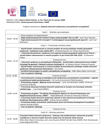 MIEJSCE I CZAS: Gdynia (Hotel Hotton, ul. Św. Piotra 8), 25 czerwca 2008 ORGANIZATORZY: Stowarzyszenie Klon/Jawor, UNDP Program seminarium „Badania ekonomii społecznej w perspektywie europejskiej” Część I - Wykłady wprowadzające 10.00 – 10.50 - Słowo wstępne od organizatorów - Skąd zainteresowanie ES W Polsce? Czemu warto ją badać i kto to robi? - prof. Jerzy Hausner - Skąd zainteresowanie ES w Europie? O zmieniających się perspektywach opisu ES – prof. Karl Birkholzer Część II - Prezentacje wyników badań 10.50 – 13.10 13.10 - 14.00 14.00 -16.40 - Wyniki badań realizowanych w ramach projektu W stronę polskiego modelu gospodarki społecznej – budujemy nowy Lisków (ISP ) - dr Marek Rymsza i dr Tomasz Kaźmierczak - „Potencjał ekonomiczny i społeczny oraz wybrane funkcje gospodarki społecznej w Polsce” – wyniki badań realizowanych w ramach projektu Tu jest Praca (ISP PAN, GUS) – dr Sławomir Nałęcz Przerwa 15 min - „Ekonomia społeczna w perspektywie Małopolski - wyniki badań realizowanych przez Zakład Socjologii Gospodarki i Edukacji Instytutu Socjologii UJ - dr Barbara Worek i Seweryn Krupnik; - Wyniki badań realizowanych w ramach projektu W poszukiwaniu polskiego modelu ekonomii społecznej (Stowarzyszenie Klon/Jawor) – Jan Herbst - Koreferat komentujący te wyniki z perspektywy europejskiej – Mike Aiken (Open University) - Czas na pytania i dyskusję Przerwa na lunch - Uwarunkowania rozwoju przedsiębiorczości społecznej w perspektywie europejskiej – sugestie na podstawie badań porównawczych - Tim Curtis (University of Northampton) - Prezentacja projektu „Maping social economy“ – prof. Karl Birkhölzer (EMES, Technical University of Berlin) - Prezentacja dotycząca kondycji ekonomii społecznej w Europie oraz koncepcji rachunku satelitarnego – Lisa Frobel (CIRIEC) Przerwa 15 min - Prezentacja projektu “The Berlin Development Agency for Social Enterprises and Neighbourhood Economy / BEST” - Heike Birkholzer (Technical University of Berlin) - Prezentacja badań ekonomii społecznej i planów w tym obszarze prowadzonych w Europie Środkowo-Wschodniej przez UNDP - Andrey Ivanow (UNDP) - Prezentacja badań rumuńskich realizowanych przez Civil Society Development Foundation – Valentin Burada (CSDF) - Czas na pytania i dyskusję Przerwa 15 min Część III – Dyskusja panelowa 16.45 - 18.00 Przyszłość badań ekonomii społecznej – dyskusja nad możliwościami i obszarami przyszłej współpracy w obszarze badań ekonomii społecznej. W dyskusji udział wezmą: Mike Aiken (Open University), prof. Jerzy Hausner (MSAP UE), Ben Slay (UNDP), Piotr Stronkowski, Kuba Wygnański (FISE).