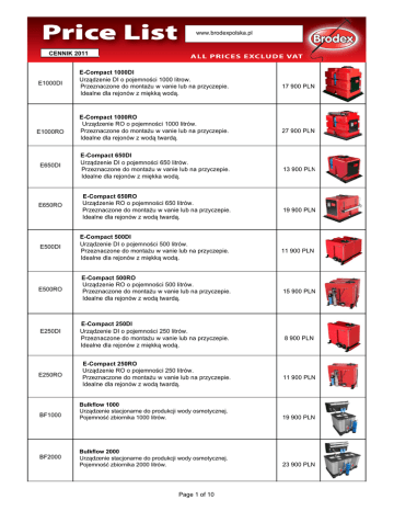 www.brodexpolska.pl CENNIK 2011 E1000DI E1000RO E-Compact 1000DI Urządzenie DI o pojemności 1000 litrow. Przeznaczone do montażu w vanie lub na przyczepie. Idealne dla rejonów z miękką wodą. E-Compact 1000RO Urządzenie RO o pojemności 1000 litrów. Przeznaczone do montażu w vanie lub na przyczepie. Idealne dla rejonów z wodą twardą. E650DI E-Compact 650DI Urządzenie DI o pojemności 650 litrów. Przeznaczone do montażu w vanie lub na przyczepie. Idealne dla rejonów z miękka wodą. E650RO E-Compact 650RO Urządzenie RO o pojemności 650 litrów. Przeznaczone do montażu w vanie lub na przyczepie. Idealne dla rejonów z wodą twardą. E500DI E-Compact 500DI Urządzenie DI o pojemności 500 litrów. Przeznaczone do montażu w vanie lub na przyczepie. Idealne dla rejonów z miękką wodą. E500RO E-Compact 500RO Urządzenie RO o pojemności 500 litrów. Przeznaczone do montażu w vanie lub na przyczepie. Idealne dla rejonów z wodą twardą. E250DI E250RO BF1000 BF2000 E-Compact 250DI Urządzenie DI o pojemności 250 litrów. Przeznaczone do montażu w vanie lub na przyczepie. Idealne dla rejonów z miękką wodą. E-Compact 250RO Urządzenie RO o pojemności 250 litrów. Przeznaczone do montażu w vanie lub na przyczepie. Idealne dla rejonów z wodą twardą. 17 900 PLN 27 900 PLN 13 900 PLN 19 900 PLN 11 900 PLN 15 900 PLN 8 900 PLN 11 900 PLN Bulkflow 1000 Urządzenie stacjonarne do produkcji wody osmotycznej. Pojemność zbiornika 1000 litrów. 19 900 PLN Bulkflow 2000 Urządzenie stacjonarne do produkcji wody osmotycznej. Pojemność zbiornika 2000 litrów. 23 900 PLN Page 1 of 10 Accessories ETP-50 5008 £0.00 Ecotrolley Plus Urządzenie o pojemności 50 litrów. Zalecane do doczyszczania trudnodostepnych powierzchni. Posiada niezależne źródło zasilania. FLOORCOTE – opakowanie poj. 4 litry. Powłoka antykorozyjna i antypoślizgowa zalecana do pokrycia powierzchni vana/przyczepy przed montażem systemu. 3 590 PLN 680 PLN FLOORCOTE BRODEX APPLICATION 5008A usługa nakładania powłoki antykorozyjnej w minivanie FLOORCOTE BRODEX APPLICATION 5008B 3004 2080C 5009C 5001 5005 5002 usługa nakładania powłoki antykorozyjnej w vanie lub przyczepie ustalana indywidualnie ustalana indywidualnie Element zabezpieczający mocowanie węża 79 PLN Uchwyty mocujące kije teleskopowe w vanie ustalana indywidualnie Panel zewnętrzny Umożliwia zamknięcie drzwi pojazdu i wykonywanie pracy. Wózek do węża. Wykonany z odpornej stali. Funkcjonalny i bardzo trwały. Wózek do węża + wąż 50 metrów Wykonany z odpornej stali. Funkcjonalny i bardzo trwały. Wąż TRICOFLEX przeznaczony do pracy z systemem WFP Brodex. TDS Meter (Total Dissolved Solids) . Urządzenie do mierzenia jakości czystości wody w zbiorniku. Page 2 of 10 1000 PLN 890 PLN 1590 PLN 270 PLN Hose Accessories £0.00 8020 Female HP fitting, brass - 6mm Złączka (wąż-panel zewnętrzny). 8021 Female HP fitting, brass - 8mm Złączka (wąż-panel zewnetrzny). 49 PLN 8022 Female HP fitting, brass - 1/2 inch Złączka (wąż-panel zewnętrzny). 49 PLN 8075 Female HP fitting, brass - 3/8 inch Złączka (wąż-panel zewnetrzny). 49 PLN Alloy Hozelock Pole Hose connector – male. Złączka (kij teleskopowy-wąż). 59 PLN 1010C 2206 8017 49 PLN Hozelock Female 1/2 inch trolley hose fitting, brass – Stop end. Złączka. HP Male to Female splitter – brass Rozdzielnik. Inline 1/2 inch hose tap, brass Złączka (wąż-wąż) z kranem. 49 PLN 129 PLN 110 PLN 8016 Male 1/2 inch hosetail tap insert, brass 29 PLN 8013 Male HP Tap replacement insert, brass 29 PLN Page 3 of 10 Złączka – kran. Do łączenia węża z panelu zewnetrznego z wężem roboczym. 110 PLN Hozelock Female 1/2 inch trolley hose fitting – brass 49 PLN 50 metre Anti-Kink Brodex Hose 1/2 inch Profesjonalny, bardzo trwały wąż ½ cala. 390 PLN 50 metre Anti-Kink Tricoflex Hose 1/2 inch 490 PLN Microbore Hose Bardzo cieńki, 100 metrowy wąż roboczy 8mm grubości. Odporny na uszkodzenia wynikające z intensywnego użytkowania. 650 PLN 2207 5003C 5003 4999 Pole Hose Bardzo cieńki (6mm) ale jednocześnie trwały wąż do szczotek teleskopowych (dług. 100 m). 300 PLN Machine Spares £0.00 2051 10 inch Carbon pre-filter BRODEX BMS certyfikat Filtr do wody (filtracja wstępna) z wkładem węglowym - 10 cali. 100 PLN 2014 10 inch Particle pre-filter BRODEX BMS certyfikat 100 PLN 5013 3G klucz do mocowania filtra. ustalana 8089 indywidualnie 2007C 20” Membrana RO BRODEX BMS certyfikat (odwrócona osmoza). Page 4 of 10 1990 PLN 2006C 40” Membrana RO BRODEX BMS certyfikat (odwrócona osmoza). 2190 PLN Stalowa (stal nierdzewna) kaseta membrany: Housing - 20" 890 PLN 2009C Stalowa (stal nierdzewna) kaseta membrany: Housing - 40" 1290 PLN 2010 Filtr DI deminarlizacji wody - 22 cale BRODEX BMS certyfikat wraz z wkładem 890 PLN 2012 Filtr DI deminarlizacji wody - 35 cali BRODEX BMS certyfikat wraz z wkładem 1290 PLN 2008C 2301 E-Compact overflow kit. (do systemów RO & DI 250 lub 500) E-Compact overflow kit. (do systemów RO & DI 650 lub 1000) 2300 8019 Złączka do panelu zewnetrznego typ. Front- female 8005 Złączka do panelu zewnętrznego typ. Rear- 12 mm Wkład do filtracji DI – żywica polimerowa doskonale demineralizująca każdy rodzaj wody25 litrów. BRODEX BMS APPROVED 5004 Various Push Fit Fittings Page 5 of 10 590 PLN 2121 Stalowy uchwyt do Filtra DI Pompa wody - 100 PSI, 12v 2004 2004C 990 PLN Pompa wody BRODEX BMS UK 100 PSI, 12v. (o uniwersalnym przeznaczeniu) Pole Spares 1010C 1061 5012D 2084C 5012A 5006A 1047 990 PLN £0.00 Alloy Hozelock Pole Hose connector – male. Aluminiowa złączka do kija teleskopowego (łączy go z wężem). Trigger Kit Ręczny sterownik uruchamiający lub zatrzymujący przepływ wody do szczotki teleskopowej. Pozwala znacznie zmniejszyć zużycie wody. 10'' Brodex Lightweight brush head. Szczotka Brodex szerokość 10 cali. 500 PLN 200 PLN 16'' Brodex Lightweight brush head. Szczotka Brodex szerokość 16 cal
