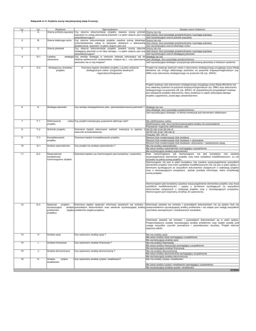 Załącznik nr 4: Kryteria oceny merytorycznej (etap II oceny). Lp. 1 Lp. A. 2 B. 3 C. 4 D.1 5 D.2 Kryterium Opis kryterium Ocena potrzeb populacji Czy obecna dokumentacja projektu zawiera ocenę potrzeb populacji na usługi planowanej placówki i w jakim stopniu jest ona satysfakcjonująca? Ocena lokalnego rynku Czy obecna dokumentacja projektu zawiera ocenę lokalnego rynku/dostawców usług w obszarze zbieżnym z planowaną działalnością placówki i w jakim stopniu jest ona Ocena placówki Czy obecna dokumentacja projektu zawiera ocenę obecnie działającej placówki (o ile taka istnieje), i w jakim stopniu jest ona satysfakcjonująca? Lokalna strategia Czy istnieje strategia w ochronie zdrowia odnosząca się do zdrowotna lokalnej społeczności (wojewódzka, miejsca itp.), i czy planowana placówka ma w niej miejsce? Strategiczny charakter projektu Oceniany będzie charakter projektu z punktu widzenia strategicznych celów i programów lokalnych/ regionalnych/krajowych. Zasady oceny kryterium Oceny nie ma Jest ocena, lecz pozostaje powierzchowna i wymaga poprawy Jest wyczerpująca ocena potrzeb populacji Oceny nie ma Jest ocena, lecz pozostaje powierzchowna i wymaga poprawy Jest wyczerpująca ocena lokalnego rynku Oceny nie ma Jest ocena, lecz pozostaje powierzchowna i wymaga poprawy Jest wyczerpująca ocena działającej placówki Strategii nie ma Jest strategia, lecz pozostaje powierzchowna Jest wyczerpująca strategia i pozycjonuje planowaną placówkę w lokalnym systemie Projekt nie realizuje żadnych celów z dokumentu strategicznego przyjętego przez Radę Ministrów lub innego właściwego podmiotu na poziomie krajowym/regionalnym (np. SRK) oraz dokumentu strategicznego na poziomie UE (np. SWW). Projekt realizuje cele dokumentu strategicznego przyjętego przez Radę Ministrów lub inny właściwy podmiot na poziomie krajowym/regionalnym (np. SRK) oraz dokumentu strategicznego na poziomie UE (np. SWW). W uzasadnionych przypadkach możliwe jest wskazanie projektu dokumentu, który został już w części dotyczącej danego projektu uzgodniony, przed jego zatwierdzeniem. 6 E. Strategia placówki 7 F.1 Definiowanie projektu 8 F.2 9 F.3 10 G.1 11 G.2. Czy istnieje strategia/biznes plan, placówki/planowanej placówki ? Strategii nie ma Jest strategia, lecz pozostaje powierzchowna Jest wyczerpująca strategia i w której inwestycja jest elementem składowym celów Czy projekt inwestycyjny poprawnie definiuje cele? Nie zdefiniowano celów Zdefiniowano cele, lecz konieczne/przydatne byłoby ich przemyślenie Poprawnie i logicznie zdefiniowano cele Wartość projektu Oceniana będzie planowana wartość inwestycji w oparciu o Od 25 mln zł do 50 mln zł szacunki wnioskodawców. Od 50 mln zł do 100 mln zł Powyżej 100 mln zł Kompleksowość Oceniana będzie kompleksowość projektu. Remont i/lub modernizacja i/lub dostawa projektu. Remont i/lub modernizacja i/lub dostawa + utrzymanie Remont i/lub modernizacja i/lub dostawa+ utrzymanie + świadczenie usług Analiza wykonalności Czy projekt ma analizę wykonalności ? Nie ma analizy wykonalności Ma zarys analizy wykonalności wymagający uzupełnienia Ma wyczerpującą analizę wykonalności Racjonalność i Oceniane będzie czy harmonogram jest kompletny i racjonalny. Brak harmonogramu lub harmonogram nie jest kompletny (nie zawiera kompletność wyszczególnienia elementów projektu oraz kwot wydatków kwalifikowanych), co nie harmonogramu działań. pozwala na pełną ocenę projektu. Harmonogram nie jest w pełni kompletny (nie zawiera wyszczególnienia wszystkich elementów projektu oraz kwot wydatków kwalifikowanych) lub nie jest w pełni spójny z terminami wynikającymi ze wszystkich dokumentów związanych z realizacją projektu oraz z obowiązującymi przepisami, jednak posiada informacje, które umożliwiają ocenę projektu Harmonogram jest kompletny (zawiera wyszczególnienie elementów projektu oraz kwot wydatków kwalifikowanych) i spójny z terminami wynikającymi ze wszystkich dokumentów związanych z realizacją projektu oraz z obowiązujących przepisów. Harmonogram jest racjonalny (możliwy do wykonania). 12 G.3. Spójność projektu i Oceniana będzie spójność informacji zawartych we wniosku i Informacje zawarte we wniosku i pozostałych dokumentach nie są spójne i/lub nie wyczerpująca analiza pozostałych dokumentach oraz zawarcie wyczerpującej analizy przeprowadzono wyczerpującej analizy problemów i nie wzięto pod uwagę wszystkich czynników zewnętrznych i oczekiwanych rezultatów. problemów (logika problemów (logika projektu). projektu). Informacje zawarte we wniosku i pozostałych dokumentach są w pełni spójne. Przeprowadzona została wyczerpująca analiza problemów oraz wzięte zostały pod uwagę wszystkie czynniki zewnętrzne i przewidywane rezultaty. Projekt stanowi logiczną całość. 13 H. Analiza opcji Czy wykonano analizę opcji ? 14 I. Analiza finansowa Czy wykonano analizę finansową ? 15 J. Analiza ekonomiczna Czy wykonano analizę ekonomiczną ? 16 K. Analiza ryzyka wrażliwości i Czy wykonano analizę ryzyka i wrażliwości? Nie ma analizy opcji Ma zarys analizy opcji wymagający uzupełnienia Ma wyczerpującą analizę opcji Nie ma analizy finansowej Ma zarys analizy finansowej wymagający uzupełnienia Ma wyczerpującą analizę finansową Nie ma analizy ekonomicznej Ma zarys analizy ekonomicznej wymagający uzupełnienia Ma wyczerpującą analizę ekonomiczną Nie ma analizy ryzyka i wrażliwości Ma zarys analizy ryzyka i wrażliwości wymagający uzupełnienia Ma wyczerpującą analizę ryzyka i wrażliwości OCENA