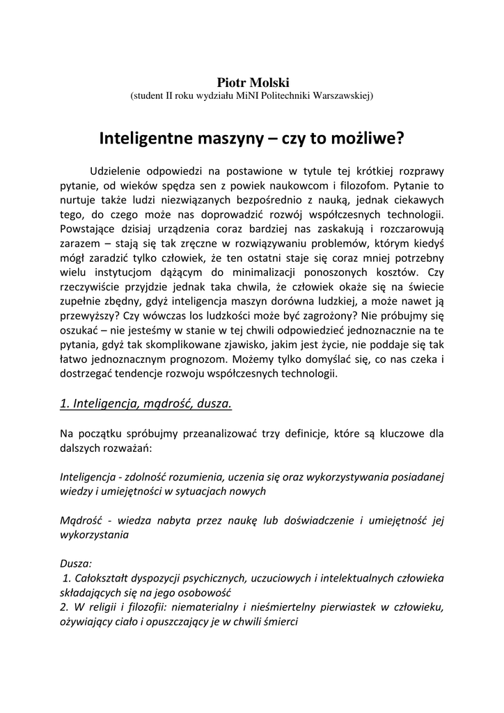 Piotr Molski (student II roku wydziału MiNI Politechniki Warszawskiej) Inteligentne maszyny – czy to możliwe? Udzielenie odpowiedzi na postawione w tytule tej krótkiej rozprawy pytanie, od wieków spędza sen z powiek naukowcom i filozofom. Pytanie to nurtuje także ludzi niezwiązanych bezpośrednio z nauką, jednak ciekawych tego, do czego może nas doprowadzić rozwój współczesnych technologii. Powstające dzisiaj urządzenia coraz bardziej nas zaskakują i rozczarowują zarazem – stają się tak zręczne w rozwiązywaniu problemów, którym kiedyś mógł zaradzić tylko człowiek, że ten ostatni staje się coraz mniej potrzebny wielu instytucjom dążącym do minimalizacji ponoszonych kosztów. Czy rzeczywiście przyjdzie jednak taka chwila, że człowiek okaże się na świecie zupełnie zbędny, gdyż inteligencja maszyn dorówna ludzkiej, a może nawet ją przewyższy? Czy wówczas los ludzkości może być zagrożony? Nie próbujmy się oszukać – nie jesteśmy w stanie w tej chwili odpowiedzieć jednoznacznie na te pytania, gdyż tak skomplikowane zjawisko, jakim jest życie, nie poddaje się tak łatwo jednoznacznym prognozom. Możemy tylko domyślać się, co nas czeka i dostrzegać tendencje rozwoju współczesnych technologii. 1. Inteligencja, mądrość, dusza. Na początku spróbujmy przeanalizować trzy definicje, które są kluczowe dla dalszych rozważań: Inteligencja - zdolność rozumienia, uczenia się oraz wykorzystywania posiadanej wiedzy i umiejętności w sytuacjach nowych Mądrość - wiedza nabyta przez naukę lub doświadczenie i umiejętność jej wykorzystania Dusza: 1. Całokształt dyspozycji psychicznych, uczuciowych i intelektualnych człowieka składających się na jego osobowość 2. W religii i filozofii: niematerialny i nieśmiertelny pierwiastek w człowieku, ożywiający ciało i opuszczający je w chwili śmierci (wszystkie definicje pochodzą ze słownika języka polskiego, dostępnego on-line na stronie www.pwn.pl) Pierwsza część zaprezentowanej definicji inteligencji -„zdolność rozumienia” jest niezwykle trudna do analizowania, bo czy można jednoznacznie stwierdzić, że ktoś lub coś ma zdolność rozumienia? Nie możemy przecież opierać się na czyimś zapewnieniu, że tak właśnie jest. Sposobem na weryfikację tego faktu jest druga część definicji – „zdolność uczenia się i wykorzystywania posiadanej wiedzy i umiejętności w sytuacjach nowych”. Jeżeli bowiem zdobycie jakiegoś wycinka wiedzy pozwala nam na rozwiązanie problemu, który do tej pory wydawał nam się niemożliwy do rozwiązania, to z pewnością możemy stwierdzić, że zrozumieliśmy to, czego się dowiedzieliśmy. Zastanówmy się jednak, czy definicja, którą mamy jest kompletna i czy nie podlegają jej również niektóre zwierzęta, co stanowiłoby o ich inteligencji. Z pewnością tak jest, ale przecież nie twierdzimy, że człowiek jest jedyną istotą inteligentną (gdyby tak było to rozprawa ta nie miałaby sensu, bo odpowiedź na postawione na początku pytanie byłaby jednoznaczna). Inteligencja nie jest mierzalna w sposób binarny tzn. „albo się ją ma albo nie”, dlatego też należy przyznać, że zwierzęta są do pewnego stopnia inteligentne. Nas interesuje jednak odpowiedni, bliski ludzkiemu poziom inteligencji, ponieważ dociekając czy maszyna może tę definicję spełnić, będziemy bliscy odpowiedzi na pytanie o to, czy maszyna może być tak inteligentna jak człowiek. Definicję tę powinniśmy więc uzupełnić o fragment, który pozwalałby jednoznacznie odróżnić inteligencję ludzką od zwierzęcej. Wydaje się, że odpowiednim fragmentem byłby fragment mówiący o „świadomości istnienia i zdawania sobie sprawy z posiadanej inteligencji”. Nie mamy co prawda pewności, czy i tych warunków nie spełnia inteligencja zwierzęca, jednak przynajmniej do tej pory zwierzęta nie dostarczyły nam jednoznacznych dowodów na to, że tak miałoby być. Uzupełniona definicja wydaje się być wystarczająca. Jej wnikliwe przeanalizowanie pozwala dojść do wniosku, że przedstawia ona zależność rekurencyjną – jesteśmy inteligentni, jeżeli zdajemy sobie sprawę, że jesteśmy inteligentni, a możemy zdawać sobie z tego sprawę tylko wtedy, gdy jesteśmy inteligentni… itd. Tego typu rozważania wydają się być obecnie zarezerwowane tylko dla człowieka. Definicja mądrości jest dużo prostsza i nie wymaga szerszego komentowania – mówi ona o umiejętności gromadzenia faktów i ich późniejszego wykorzystania. Dużo bardziej skomplikowana jest ostatnia definicja, podana w dwóch odsłonach – definicja duszy. Wersja religijno-filozoficzna wydaje się trudna do wykorzystania w jakichkolwiek rozważaniach dotyczących istot innych niż człowiek (w tym maszyn), ponieważ została stworzona właśnie z myślą o człowieku i próba dopasowania jej do jakiejkolwiek innej istoty nie ma sensu. Pierwsza wersja definicji duszy trzyma się z kolei blisko tych cech, których próżno szukać u maszyn – posiadania uczuć, osobowości, psychiki. Nie wiemy czy maszyna może te cechy posiadać, lecz nie to jest przedmiotem naszych rozważań. Podsumowując to, co dotyczy duszy, stwierdzamy, że maszyna nie może jej posiadać, ponieważ dusza z założenia jest czymś, co istnieje tylko w człowieku, a próba poszukiwania jej u innych istot byłaby zaprzeczeniem samej definicji duszy. Słowo „człowiek” pojawia się w obydwu wersjach i jest wystarczającym argumentem na to, że posiadanie duszy zarezerwowane jest dla człowieka. Definicją duszy nie będziemy się więc dalej zajmowali. Nie musi to mieć jednak żadnego wpływu na nasze dalsze rozważania dotyczące inteligencji maszyn – zgodnie z powyższymi definicjami nieposiadanie duszy nie musi być przeszkodą w możliwości inteligentnego myślenia. 2. Inteligentne maszyny Zaopatrzeni w odpowiednie definicje możemy przystąpić do zas