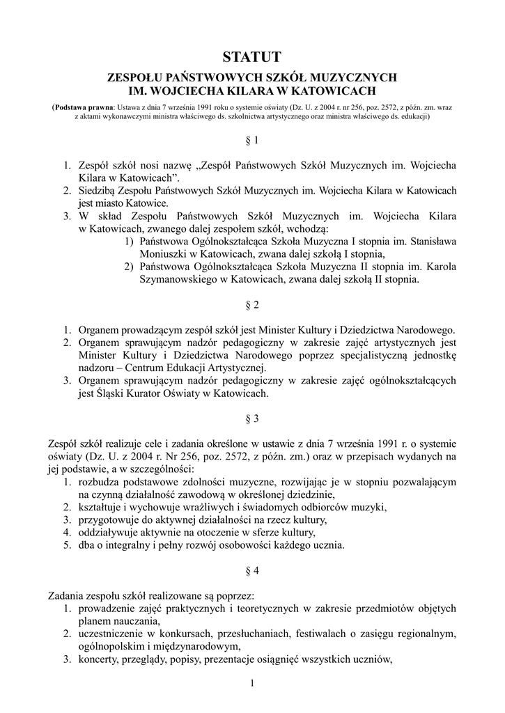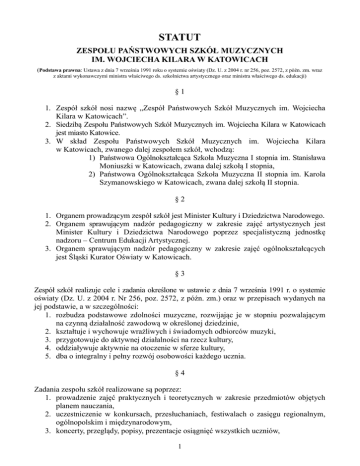 STATUT ZESPOŁU PAŃSTWOWYCH SZKÓŁ MUZYCZNYCH IM. WOJCIECHA KILARA W KATOWICACH (Podstawa prawna: Ustawa z dnia 7 września 1991 roku o systemie oświaty (Dz. U. z 2004 r. nr 256, poz. 2572, z późn. zm. wraz z aktami wykonawczymi ministra właściwego ds. szkolnictwa artystycznego oraz ministra właściwego ds. edukacji) §1 1. Zespół szkół nosi nazwę „Zespół Państwowych Szkół Muzycznych im. Wojciecha Kilara w Katowicach”. 2. Siedzibą Zespołu Państwowych Szkół Muzycznych im. Wojciecha Kilara w Katowicach jest miasto Katowice. 3. W skład Zespołu Państwowych Szkół Muzycznych im. Wojciecha Kilara w Katowicach, zwanego dalej zespołem szkół, wchodzą: 1) Państwowa Ogólnokształcąca Szkoła Muzyczna I stopnia im. Stanisława Moniuszki w Katowicach, zwana dalej szkołą I stopnia, 2) Państwowa Ogólnokształcąca Szkoła Muzyczna II stopnia im. Karola Szymanowskiego w Katowicach, zwana dalej szkołą II stopnia. §2 1. Organem prowadzącym zespół szkół jest Minister Kultury i Dziedzictwa Narodowego. 2. Organem sprawującym nadzór pedagogiczny w zakresie zajęć artystycznych jest Minister Kultury i Dziedzictwa Narodowego poprzez specjalistyczną jednostkę nadzoru – Centrum Edukacji Artystycznej. 3. Organem sprawującym nadzór pedagogiczny w zakresie zajęć ogólnokształcących jest Śląski Kurator Oświaty w Katowicach. §3 Zespół szkół realizuje cele i zadania określone w ustawie z dnia 7 września 1991 r. o systemie oświaty (Dz. U. z 2004 r. Nr 256, poz. 2572, z późn. zm.) oraz w przepisach wydanych na jej podstawie, a w szczególności: 1. rozbudza podstawowe zdolności muzyczne, rozwijając je w stopniu pozwalającym na czynną działalność zawodową w określonej dziedzinie, 2. kształtuje i wychowuje wrażliwych i świadomych odbiorców muzyki, 3. przygotowuje do aktywnej działalności na rzecz kultury, 4. oddziaływuje aktywnie na otoczenie w sferze kultury, 5. dba o integralny i pełny rozwój osobowości każdego ucznia. §4 Zadania zespołu szkół realizowane są poprzez: 1. prowadzenie zajęć praktycznych i teoretycznych w zakresie przedmiotów objętych planem nauczania, 2. uczestniczenie w konkursach, przesłuchaniach, festiwalach o zasięgu regionalnym, ogólnopolskim i międzynarodowym, 3. koncerty, przeglądy, popisy, prezentacje osiągnięć wszystkich uczniów, 1 4. współpracę z placówkami kulturalnymi i artystycznymi na terenie całego kraju i poza jego granicami, 5. współdziałanie z samorządem lokalnym w rozwijaniu działalności kulturalnej, zgodnie z postanowieniem § 5 niniejszego statutu. §5 Zespół szkół współdziała z samorządami terytorialnymi w zależności od potrzeb środowiska lokalnego w zakresie działalności dydaktyczno-wychowawczej i artystycznej poprzez promowanie i prezentację uzdolnionych dzieci i młodzieży w formie koncertów, popisów, konkursów, a także typowanie do nagród i stypendiów. §6 1. Okres nauki w szkole I stopnia wynosi 6 lat i obejmuje zajęcia edukacyjne ogólnokształcące i artystyczne. 2. Szkoła I stopnia kształci w zakresie następujących specjalności: fortepian, akordeon, skrzypce, wiolonczela, kontrabas, flet, obój, klarnet, saksofon, fagot, trąbka, waltornia, puzon, perkusja, gitara klasyczna, harfa. §7 1. Okres nauki w szkole II stopnia wynosi 6 lat i obejmuje zajęcia edukacyjne ogólnokształcące i artystyczne. 2. W szkole II stopnia prowadzone są wydziały: 1) instrumentalny, w zakresie następujących specjalności: fortepian, organy, skrzypce, altówka, wiolonczela, kontrabas, flet, obój, klarnet, saksofon, fagot, trąbka, waltornia, puzon, tuba, perkusja, akordeon, gitara klasyczna, harfa, 2) rytmiki. 3. W szkole II stopnia mogą być prowadzone w ramach wydziału instrumentalnego następujące specjalności: viola da gamba, flet traverso, klawesyn. 4. Absolwenci szkoły II stopnia otrzymują tytuły: 1) muzyk – instrumentalista, z określeniem specjalizacji w zakresie specjalności wymienionych w ust. 2 pkt. 1, po ukończeniu wydziału instrumentalnego, 2) muzyk – nauczyciel rytmiki, po ukończeniu wydziału rytmiki. §8 1. W Zespole Państwowych Szkół Muzycznych im. Wojciecha Kilara mogą funkcjonować stowarzyszenia i fundacje, działające na rzecz szkół wchodzących w jego w skład. 2. W szkole II stopnia działa Stowarzyszenie Absolwentów i Sympatyków Liceum Muzycznego w Katowicach. 3. Szczegółowy zakres działania stowarzyszeń i fundacji określa ich statut. 2 §9 Ocenianie, klasyfikowanie i promowanie uczniów oraz przeprowadzanie sprawdzianów i egzaminów w zespole szkół reguluje Wewnątrzszkolny System Oceniania, Klasyfikowania i Promowania Uczniów w Zespole Państwowych Szkół Muzycznych im. Wojciecha Kilara w Katowicach, zwany dalej WSO, będący integralną częścią niniejszego statutu. § 10 1. Organami zespołu szkół są: 1) Dyrektor, 2) Rada Pedagogiczna szkoły I stopnia 3) Rada Pedagogiczna szkoły II stopnia 4) Rada Szkoły, 5) Rada Rodziców, 6) Samorząd Uczniowski szkoły I stopnia 7) Samorząd Uczniowski szkoły II stopnia.” 2. Zespołem szkół kieruje dyrektor, który jest jego przedstawicielem na zewnątrz, przełożonym służbowym wszystkich pracowników szkoły, przewodniczącym Rady Pedagogicznej. Dyrektor sprawuje opiekę nad dziećmi i młodzieżą uczącą się w szkole. Dyrektor w szczególności: 1) kieruje działalnością zespołu szkół, 2) sprawuje nadzór pedagogiczny, 3) sprawuje opiekę nad uczniami, 4) realizuje uchwały Rady Szkoły i Rady Pedagogicznej, podjęte w ramach ich kompetencji stanowiących, 5) dysponuje środkami określonymi w planie finansowym szkoły i ponosi odpowiedzialność za ich prawidłowe wykorzystanie, 6) wykonuje czynności prawne w zakresie prawa pracy w stosunku do pracowników, 7) współdziała ze szkołami wyższymi w organizacji praktyk pedagogicznych, 8) odpowiada za właściwą organizację i przebieg egzaminów przeprowadzanych w szkol