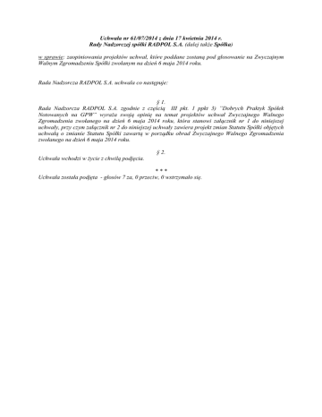 Uchwała nr 61/07/2014 z dnia 17 kwietnia 2014 r. Rady Nadzorczej spółki RADPOL S.A. (dalej także Spółka) w sprawie: zaopiniowania projektów uchwał, które poddane zostaną pod głosowanie na Zwyczajnym Walnym Zgromadzeniu Spółki zwołanym na dzień 6 maja 2014 roku. Rada Nadzorcza RADPOL S.A. uchwala co następuje: § 1. Rada Nadzorcza RADPOL S.A. zgodnie z częścią III pkt. 1 ppkt 3) ”Dobrych Praktyk Spółek Notowanych na GPW” wyraża swoją opinię na temat projektów uchwał Zwyczajnego Walnego Zgromadzenia zwołanego na dzień 6 maja 2014 roku, która stanowi załącznik nr 1 do niniejszej uchwały, przy czym załącznik nr 2 do niniejszej uchwały zawiera projekt zmian Statutu Spółki objętych uchwałą o zmianie Statutu Spółki zawartą w porządku obrad Zwyczajnego Walnego Zgromadzenia zwołanego na dzień 6 maja 2014 roku. § 2. Uchwała wchodzi w życie z chwilą podjęcia. *** Uchwała została podjęta - głosów 7 za, 0 przeciw, 0 wstrzymało się. ZAŁĄCZNIK NR 1 DO UCHWAŁY NR 61/07/2014 Warszawa, dnia 17 kwietnia 2014 OPINIA RADY NADZORCZEJ RADPOL S.A. w sprawie projektów uchwał Zwyczajnego Walnego Zgromadzenia zwołanego na dzień 6 maja 2014 roku. Rada Nadzorcza RADPOL S.A. (dalej także Spółka) na swoim posiedzeniu w dniu 17 kwietnia 2014 roku rozpatrzyła przedstawione przez Zarząd Spółki propozycje uchwał Zwyczajnego Walnego Zgromadzenia zwołanego na dzień 6 maja 2014 roku i wyraziła swoją opinię na ich temat. Rada Nadzorcza poniżej przedstawia swoje opinie odnośnie przyjęcia poszczególnych uchwał, przy czym Rada Nadzorcza nie opiniowała uchwał mających charakter porządkowy lub proceduralny (tj. uchwał w przedmiocie wyboru Przewodniczącego Walnego Zgromadzenia, w sprawie wyboru Komisji Skrutacyjnej oraz w sprawie przyjęcia porządku obrad): a) Uchwała w sprawie zatwierdzenia sprawozdania Zarządu z działalności Spółki w 2013 roku ______ Opiniujemy przyjęcie bez zmian _________________ b) Uchwała w sprawie zatwierdzenia sprawozdania Zarządu z działalności grupy kapitałowej Spółki w 2013 roku ______ Opiniujemy przyjęcie bez zmian _________________ c) Uchwała w sprawie zatwierdzenia sprawozdania finansowego Spółki za 2013 rok _______ Opiniujemy przyjęcie bez zmian ________________ d) Uchwała w sprawie zatwierdzenia skonsolidowanego sprawozdania finansowego grupy kapitałowej Spółki za 2013 rok _______ Opiniujemy przyjęcie bez zmian ________________ e) Uchwała w sprawie podziału zysku za rok obrotowy 2013 _______ Opiniujemy przyjęcie bez zmian ________________ f) Uchwały w sprawie udzielenia absolutorium Członkom Zarządu Spółki z wykonywania przez nich obowiązków w 2013 roku _______ Opiniujemy przyjęcie bez zmian ________________ g) Uchwały w sprawie zmian Statutu Spółki _______ Opiniujemy przyjęcie bez zmian ________________ Rada Nadzorcza powstrzymuje się od zaopiniowania uchwał w przedmiocie: 1. zatwierdzenia sprawozdania Rady Nadzorczej RADPOL S.A.; 2. udzielenia absolutorium Członkom Rady Nadzorczej Spółki z wykonywania przez nich obowiązków w 2013 roku z uwagi na to, iż uchwały te dotyczą bezpośrednio poszczególnych członków Rady Nadzorczej oraz działalności Rady Nadzorczej jako organu Spółki. ZAŁĄCZNIK NR 2 DO UCHWAŁY NR 61/07/2014 PROJEKT ZMIAN STATUTU SPÓŁKI I. Uchylić artykuł 12 ustęp 2 statutu Spółki o treści: Art. 12.2. Rozporządzanie przez Spółkę prawem lub zaciągnięcie zobowiązania do świadczenia o wartości przekraczającej 1.000.000 (jeden milion) złotych lub 1.000.000 (jeden milion) złotych w okresie dowolnych kolejnych dwunastu miesięcy jeżeli rozporządzenie prawem lub świadczenie następuje na rzecz tego samego podmiotu lub podmiotów z grupy kapitałowej w rozumieniu ustawy o rachunkowości wymaga zgody Rady Nadzorczej, z zastrzeżeniem, że nie jest wymagana zgoda Rady Nadzorczej na dokonanie czynności określonych powyżej, w przypadku jeżeli zostały one przewidziane w zatwierdzonym przez Radę Nadzorczą budżecie Spółki. II. Artykułowi 17 ustęp 2 statutu Spółki o dotychczasowej treści: „2. Oprócz spraw wskazanych w ustawie, w innych postanowieniach niniejszego statutu lub w uchwałach Walnego Zgromadzenia do kompetencji Rady Nadzorczej należy: 1) wybór biegłego rewidenta przeprowadzającego badanie sprawozdania finansowego Spółki, 2) uchwalanie tekstu jednolitego statutu Spółki, chyba że tekst jednolity Statutu zostanie uchwalony przez Walne Zgromadzenie, 3) Wyrażenie zgody na tworzenie oddziałów Spółki oraz przystępowaniu przez Spółkę do spółek lub innych podmiotów, 4) Wyrażanie zgody na rozporządzanie przez Spółkę prawem lub zaciągnięcie zobowiązania do świadczenia o wartości przekraczającej 1.000.000 (jeden milion) złotych lub 1.000.000 (jeden milion) złotych w okresie dowolnych kolejnych dwunastu miesięcy jeżeli rozporządzenie prawem lub świadczenie następuje na rzecz tego samego podmiotu lub podmiotów z grupy kapitałowej w rozumieniu ustawy o rachunkowości, z zastrzeżeniem, że nie jest wymagana zgoda Rady Nadzorczej na dokonanie czynności określonych powyżej, w przypadku jeżeli zostały one przewidziane w zatwierdzonym przez Radę Nadzorczą budżecie Spółki, 5) Wyrażenie zgody na tworzenie przez Zarząd Spółki funduszy zaliczanych w ciężar kosztów działalności Spółki. 6) Zatwierdzenie przyjętego przez Zarząd Spółki budżetu Spółki.” Proponuje się nadać następującą treść: „2. Oprócz spraw wskazanych w ustawie, w innych postanowieniach niniejszego statutu lub w uchwałach Walnego Zgromadzenia do kompetencji Rady Nadzorczej należy: 1) ustalanie wysokości i zasad wynagradzania członków Zarządu, 2) wyrażenie zgody na wypłatę przez Spółkę zaliczki na poczet przewidywanej dywidendy, 3) reprezentowanie Spółki w umowach i sporach z członkami Zarządu, 4) zawieszanie, z ważnych powodów, w czynnościach poszczególnych lub ws