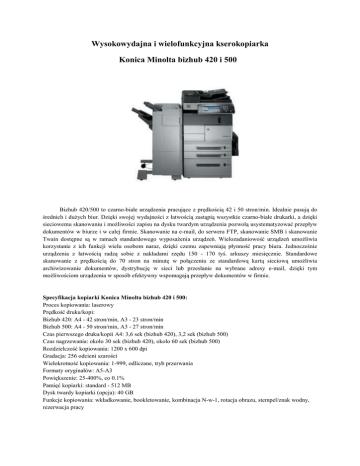Wysokowydajna i wielofunkcyjna kserokopiarka Konica Minolta bizhub 420 i 500 Bizhub 420/500 to czarno-białe urządzenia pracujące z prędkością 42 i 50 stron/min. Idealnie pasują do średnich i dużych biur. Dzięki swojej wydajności z łatwością zastąpią wszystkie czarno-białe drukarki, a dzięki sieciowemu skanowaniu i możliwości zapisu na dysku twardym urządzenia pozwolą usystematyzować przepływ dokumentów w biurze i w całej firmie. Skanowanie na e-mail, do serwera FTP, skanowanie SMB i skanowanie Twain dostępne są w ramach standardowego wyposażenia urządzeń. Wielozadaniowość urządzeń umożliwia korzystanie z ich funkcji wielu osobom naraz, dzięki czemu zapewniają płynność pracy biura. Jednocześnie urządzenia z łatwością radzą sobie z nakładami rzędu 150 - 170 tyś. arkuszy miesięcznie. Standardowe skanowanie z prędkością do 70 stron na minutę w połączeniu ze standardową kartą sieciową umożliwia archiwizowanie dokumentów, dystrybucję w sieci lub przesłanie na wybrane adresy e-mail, dzięki tym możliwościom urządzenia w sposób efektywny wspomagają przepływ dokumentów w firmie. Specyfikacja kopiarki Konica Minolta bizhub 420 i 500: Proces kopiowania: laserowy Prędkość druku/kopi: Bizhub 420: A4 - 42 stron/min, A3 - 23 stron/min Bizhub 500: A4 - 50 stron/min, A3 - 27 stron/min Czas pierwszego druku/kopii A4: 3,6 sek (bizhub 420), 3,2 sek (bizhub 500) Czas nagrzewania: około 30 sek (bizhub 420), około 60 sek (bizhub 500) Rozdzielczość kopiowania: 1200 x 600 dpi Gradacja: 256 odcieni szarości Wielokrotność kopiowania: 1-999, odliczane, tryb przerwania Formaty oryginałów: A5-A3 Powiększenie: 25-400%, co 0.1% Pamięć kopiarki: standard - 512 MB Dysk twardy kopiarki (opcja): 40 GB Funkcje kopiowania: wkładkowanie, bookletowanie, kombinacja N-w-1, rotacja obrazu, stempel/znak wodny, rezerwacja pracy Specyfikacja drukarki (opcja): Rozdzielczość druku: max. 2400 x 600 dpi (interpolowana) Kontroler: MPC8245, 400 MHz Język opisu strony: PCL 5e/ 6, PostScript 3 Systemy operacyjne: Windows 98/ME/NT4.0/2000/XP/2003 Server, Macintosh 9.x/10.x Interface: 10-Base-T/100-Base-TX Etdernet (standard), USB 2.0 (opcja), IEEE 1284 (opcja) Pamięć drukarki: 192 MB Dysk twardy (opcja): 40 GB (współdzielona z kopiarką) Specyfikacja skanera (opcja): Typ: dwuprzebiegowy Skanowanie: do 75 stron/min (A4) Rozdzielczość skanowania: max. 600 x 600 dpi Tryby skanowania: TWAIN scan, Scan-to-eMail, Scan-to-FTP, Scan-to-SMB, Scan-to-Box/HDD* (* z dyskiem twardym) Formaty plików: TIFF, PDF, skanowanie Wspierane LDAP Specyfikacja faksu (opcja): Standard: Super G3 Rozdzielczość: max. 600 x 600 dpi Kompresja: MH, MR, MMR, JBIG Faks modem: do 33,6 Kbps Pamięć: 576 MB (współdzielona z kopiarką i drukarką) Funkcje: Polling, transmisja z pamięci, wysyłanie do wielu, PC fax Specyfikacja systemu: Dwustronny podajnik oryginałów (standard): do 100 oryginałów Rozmiar papieru: A6-A3 Gramatura papieru: 60 – 200 g/m2 (z wszystkich kaset), 50-200 g/m2 (z podajnika bocznego) Bank papieru (standard): 1150 stron, max. 5650 stron Tace odbiorcze: do 3000 stron Duplex (standard): A5-A3, 60 – 105 g/m2 Tryby wykańczania (opcja): offset, grupowanie, sortowanie, zszywanie, dziurkowanie (2/4 dziurki), skład w z/na pół-/w 3, booklet Pobór mocy: 1560 Watt (system) Wymiary systemu (wys. x dł. x głęb. mm): 677 x 708 x 895 (z podajnikiem) Waga systemu: około. 91,2 kg (z podajnikiem) Funkcje systemu: Opcje dostępu - 1000 kont użytkownika, Active directory (użytkownik + hasło) Definiowane opcje dostępu użytkowników Software PageScope NetCare, PageScope NetSetup, PageScope Data Administrator, PageScope Workware Podajnik dokumentów dwustronnych: pojemność 80 dokumentów, prędkość podawania - 70 dokumentów/min Simplex: 35-128 g/m2 i 37 dokumenty/min Duplex: 50 ~ 128 g/m2 Finiszer FS-510: pojemność wyjściowa - 1200 arkuszy, pojemność zszywania - 50 arkuszy, tryby wykańczania: zszywanie na rogu, dwupozycyjne i zszywanie na grzbiecie, składanie na pół, składanie na trzy, grupowanie, sortowanie, tworzenie bookletów. Finiszer FS-511: pojemność wyjściowa – 3000 arkuszy, pojemność zszywania - 50 arkuszy, tryby wykańczania: zszywanie na rogu, dwupozycyjne, grupowanie, sortowanie Zestaw do dziurkowania PK-501 (opcja do finiszerów FS-510, FS-511) wykonuje 4 otwory w standardzie europejskim, papier 60-160 g/m2 Dysk twardy HD-505 - umożliwia wykorzystanie funkcji overlay i serwera dokumentów Kaseta dużej pojemności LU-201 – pojemność 2.000 ark., format A4 w poprzek, gramatura 60-105 g/m2 Kontroler druku IC-204 – kontroler druku PCL 5e/6 i PostScript Eksploatacja : Wydajność tonera - 32200 stron Wydajność modułu bęben - 250000 stron