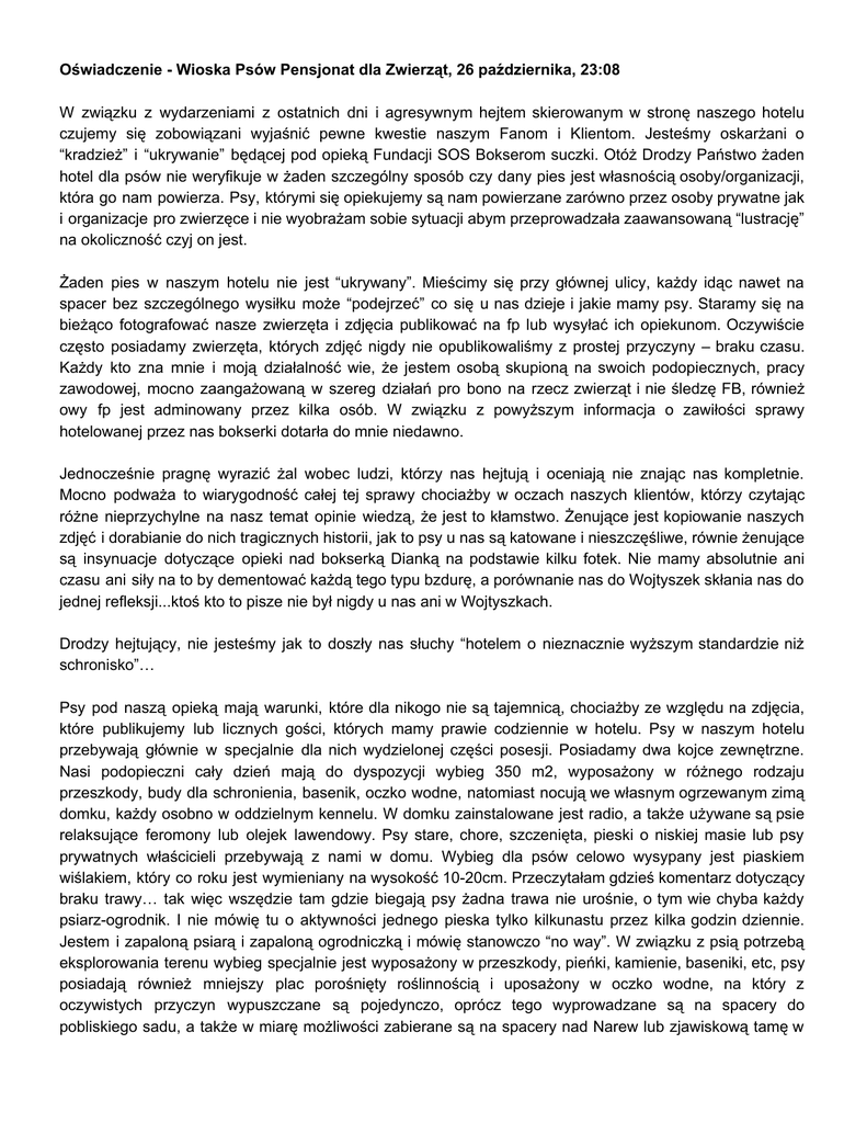 Oświadczenie Wioska Psów Pensjonat dla Zwierząt, 26 października, 23:08 W związku z wydarzeniami z ostatnich dni i agresywnym hejtem skierowanym w stronę naszego hotelu czujemy się zobowiązani wyjaśnić pewne kwestie naszym Fanom i Klientom. Jesteśmy oskarżani o “kradzież” i “ukrywanie” będącej pod opieką Fundacji SOS Bokserom suczki. Otóż Drodzy Państwo żaden hotel dla psów nie weryfikuje w żaden szczególny sposób czy dany pies jest własnością osoby/organizacji, która go nam powierza. Psy, którymi się opiekujemy są nam powierzane zarówno przez osoby prywatne jak i organizacje pro zwierzęce i nie wyobrażam sobie sytuacji abym przeprowadzała zaawansowaną “lustrację” na okoliczność czyj on jest. Żaden pies w naszym hotelu nie jest “ukrywany”. Mieścimy się przy głównej ulicy, każdy idąc nawet na spacer bez szczególnego wysiłku może “podejrzeć” co się u nas dzieje i jakie mamy psy. Staramy się na bieżąco fotografować nasze zwierzęta i zdjęcia publikować na fp lub wysyłać ich opiekunom. Oczywiście często posiadamy zwierzęta, których zdjęć nigdy nie opublikowaliśmy z prostej przyczyny – braku czasu. Każdy kto zna mnie i moją działalność wie, że jestem osobą skupioną na swoich podopiecznych, pracy zawodowej, mocno zaangażowaną w szereg działań pro bono na rzecz zwierząt i nie śledzę FB, również owy fp jest adminowany przez kilka osób. W związku z powyższym informacja o zawiłości sprawy hotelowanej przez nas bokserki dotarła do mnie niedawno. Jednocześnie pragnę wyrazić żal wobec ludzi, którzy nas hejtują i oceniają nie znając nas kompletnie. Mocno podważa to wiarygodność całej tej sprawy chociażby w oczach naszych klientów, którzy czytając różne nieprzychylne na nasz temat opinie wiedzą, że jest to kłamstwo. Żenujące jest kopiowanie naszych zdjęć i dorabianie do nich tragicznych historii, jak to psy u nas są katowane i nieszczęśliwe, równie żenujące są insynuacje dotyczące opieki nad bokserką Dianką na podstawie kilku fotek. Nie mamy absolutnie ani czasu ani siły na to by dementować każdą tego typu bzdurę, a porównanie nas do Wojtyszek skłania nas do jednej refleksji...ktoś kto to pisze nie był nigdy u nas ani w Wojtyszkach. Drodzy hejtujący, nie jesteśmy jak to doszły nas słuchy “hotelem o nieznacznie wyższym standardzie niż schronisko”… Psy pod naszą opieką mają warunki, które dla nikogo nie są tajemnicą, chociażby ze względu na zdjęcia, które publikujemy lub licznych gości, których mamy prawie codziennie w hotelu. Psy w naszym hotelu przebywają głównie w specjalnie dla nich wydzielonej części posesji. Posiadamy dwa kojce zewnętrzne. Nasi podopieczni cały dzień mają do dyspozycji wybieg 350 m2, wyposażony w różnego rodzaju przeszkody, budy dla schronienia, basenik, oczko wodne, natomiast nocują we własnym ogrzewanym zimą domku, każdy osobno w oddzielnym kennelu. W domku zainstalowane jest radio, a także używane są psie relaksujące feromony lub olejek lawendowy. Psy stare, chore, szczenięta, pieski o niskiej masie lub psy prywatnych właścicieli przebywają z nami w domu. Wybieg dla psów celowo wysypany jest piaskiem wiślakiem, który co roku jest wymieniany na wysokość 1020cm. Przeczytałam gdzieś komentarz dotyczący braku trawy… tak więc wszędzie tam gdzie biegają psy żadna trawa nie urośnie, o tym wie chyba każdy psiarzogrodnik. I nie mówię tu o aktywności jednego pieska tylko kilkunastu przez kilka godzin dziennie. Jestem i zapaloną psiarą i zapaloną ogrodniczką i mówię stanowczo “no way”. W związku z psią potrzebą eksplorowania terenu wybieg specjalnie jest wyposażony w przeszkody, pieńki, kamienie, baseniki, etc, psy posiadają również mniejszy plac porośnięty roślinnością i uposażony w oczko wodne, na który z oczywistych przyczyn wypuszczane są pojedynczo, oprócz tego wyprowadzane są na spacery do pobliskiego sadu, a także w miarę możliwości zabierane są na spacery nad Narew lub zjawiskową tamę w Dębe. Gdy popada deszcz, zwłaszcza intensywnie na wybiegu powstają kałuże co również nie jest chyba wybitnym zjawiskiem ;) Karmione są oddzielnie lub razem w zależności od potrzeb, oprócz tego zawsze, codziennie mają wysypywaną w różnych miejscach suchą karmę. Nie jest to wynikiem naszej niechlujności, a celową pracą węchową jaką zlecamy psom, dzięki temu dbamy o realizacje fundamentalnych psich potrzeb i relaksację. Prócz tego staramy się aby nasi podopieczni codziennie dostawali różne gryzaki aby wypełniać potrzebę żucia. Wszelkie nasze metody są wypracowane dzięki wieloletniej pracy z psami, a podstawy merytoryczne czerpiemy od niezawodnej behawiorystki. Opiekujemy się ok. 20 psami jednocześnie. Do opieki zaangażowane są 23 osoby. W kwestii ogromnego hejtu wobec Fundacji SOS Bokserom pozostajemy niezmienni, nie wolno popierać takiej postawy społeczeństwa, która bezpośrednio zmierza do samosądu. To nie Średniowiecze. Od rozstrzygnięcia, która ze stron miała rację jest Sąd, a nie Ja, grupa Internautów, czy tym bardziej Właściciel czy Fundacja. Ja zarówno jako lekarz jak i hotel mam jedno zadanie: opiekować się najlepiej jak potrafię swoimi podopiecznymi. Zawsze to robiłam i niezmiennie będę robić póki starczy mi sił. Nigdy nie dociekam jaka jest historia psa, za wyjątkiem gdy ma to dla mnie znaczenie diagnostyczne. Zwłaszcza psy chore, a tak było w przypadku Diany mogą liczyć u nas na szczególną opiekę, o czym wiedzą nasi klienci, którzy często powierzają nam właśnie psy szczególnej troski. Moim celem jest zapewnienie im opieki i leczenia. Co do sprawy bokserki Diany informujemy, że nie będziemy odpowiadać na wysyłane do nas na priv wiadomości. Informacje o powierzonym nam psie pod opiekę zawsze udostępniamy jedynie osobie zlecającej. Zasadę tą stosujemy od p
