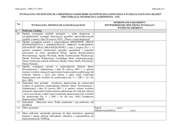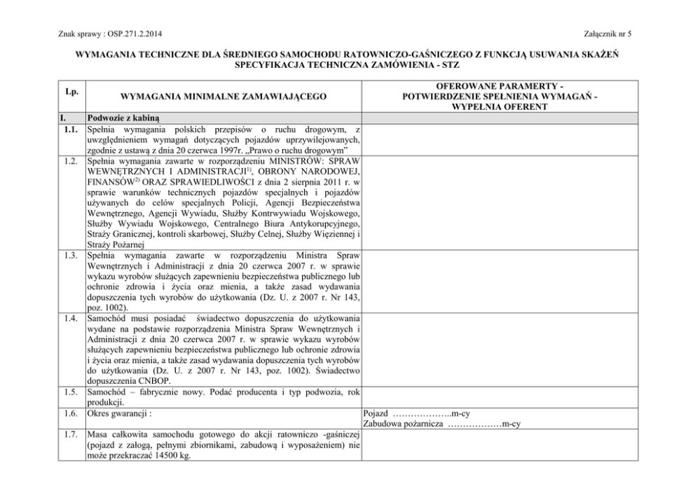 Znak sprawy : OSP.271.2.2014 Załącznik nr 5 WYMAGANIA TECHNICZNE DLA ŚREDNIEGO SAMOCHODU RATOWNICZO-GAŚNICZEGO Z FUNKCJĄ USUWANIA SKAŻEŃ SPECYFIKACJA TECHNICZNA ZAMÓWIENIA - STZ Lp. I. 1.1. 1.2. 1.3. 1.4. 1.5. 1.6. 1.7. WYMAGANIA MINIMALNE ZAMAWIAJĄCEGO OFEROWANE PARAMERTY POTWIERDZENIE SPEŁNIENIA WYMAGAŃ WYPEŁNIA OFERENT Podwozie z kabiną Spełnia wymagania polskich przepisów o ruchu drogowym, z uwzględnieniem wymagań dotyczących pojazdów uprzywilejowanych, zgodnie z ustawą z dnia 20 czerwca 1997r. „Prawo o ruchu drogowym” Spełnia wymagania zawarte w rozporządzeniu MINISTRÓW: SPRAW WEWNĘTRZNYCH I ADMINISTRACJI1), OBRONY NARODOWEJ, FINANSÓW2) ORAZ SPRAWIEDLIWOŚCI z dnia 2 sierpnia 2011 r. w sprawie warunków technicznych pojazdów specjalnych i pojazdów używanych do celów specjalnych Policji, Agencji Bezpieczeństwa Wewnętrznego, Agencji Wywiadu, Służby Kontrwywiadu Wojskowego, Służby Wywiadu Wojskowego, Centralnego Biura Antykorupcyjnego, Straży Granicznej, kontroli skarbowej, Służby Celnej, Służby Więziennej i Straży Pożarnej Spełnia wymagania zawarte w rozporządzeniu Ministra Spraw Wewnętrznych i Administracji z dnia 20 czerwca 2007 r. w sprawie wykazu wyrobów służących zapewnieniu bezpieczeństwa publicznego lub ochronie zdrowia i życia oraz mienia, a także zasad wydawania dopuszczenia tych wyrobów do użytkowania (Dz. U. z 2007 r. Nr 143, poz. 1002). Samochód musi posiadać świadectwo dopuszczenia do użytkowania wydane na podstawie rozporządzenia Ministra Spraw Wewnętrznych i Administracji z dnia 20 czerwca 2007 r. w sprawie wykazu wyrobów służących zapewnieniu bezpieczeństwa publicznego lub ochronie zdrowia i życia oraz mienia, a także zasad wydawania dopuszczenia tych wyrobów do użytkowania (Dz. U. z 2007 r. Nr 143, poz. 1002). Świadectwo dopuszczenia CNBOP. Samochód – fabrycznie nowy. Podać producenta i typ podwozia, rok produkcji. Okres gwarancji : Pojazd ………………..m-cy Zabudowa pożarnicza ………………m-cy Masa całkowita samochodu gotowego do akcji ratowniczo -gaśniczej (pojazd z załogą, pełnymi zbiornikami, zabudową i wyposażeniem) nie może przekraczać 14500 kg. Znak sprawy : OSP.271.2.2014 Lp. 1.8. 1.9. 1.10. 1.11. 1.12. 1.13. 1.14. 1.15. WYMAGANIA MINIMALNE ZAMAWIAJĄCEGO Pojazd wyposażony w urządzenie sygnalizacyjno – ostrzegawcze akustyczne i świetlne. Światła pulsacyjne niebieskie na dachu kabiny min. 2 szt, głośnik min. 100 W, - dodatkowe 2 lampy sygnalizacyjne niebieskie z przodu pojazdu, - dodatkowa lampa sygnalizacyjna niebieska z tyłu pojazdu. W przedziale autopompy musi być zainstalowany dodatkowy głośnik współpracujący z radiotelefonem przewoźnym. Podwozie pojazdu z silnikiem o zapłonie samoczynnym, spełniającym wymogi odnośnie czystości spalin zgodnie z obowiązującymi w tym zakresie przepisami, nie mniej niż EURO-5. Silnik o mocy minimum 280 KM. Napęd 4x4 z możliwością odłączenia napędu jednej osi, skrzynia redukcyjna do jazdy w terenie, blokady mechanizmów różnicowych min.: - międzyosiowego - osi tylnej - osi przedniej Kabina czterodrzwiowa, jednomodułowa, zapewniająca dostęp do silnika, w układzie miejsc 1+1+4 (siedzenia przodem do kierunku jazdy). Kabina musi być wyposażona w: - Indywidualne oświetlenie nad siedzeniem dowódcy, - Ogrzewanie niezależne od pracy silnika, - Uchwyt do trzymania w tylnej części kabiny, - Schowek pod siedziskami w tylnej części kabiny, - Instalację do podłączenia ładowarek latarek i radiostacji przenośnych, - Reflektor ręczny (szperacz) do oświetlenia numerów budynków, - Radio samochodowe. Fotele wyposażone w pasy bezpieczeństwa, siedzenia pokryte materiałem łatwo zmywalnym, odpornym na rozdarcie i ścieranie, fotele wyposażone w zagłówki, fotel dla kierowcy z regulacją wysokości, odległości i pochylenia oparcia. Instalacja elektryczna jednoprzewodowa, z biegunem ujemnym na masie lub dwuprzewodowa w przypadku zabudowy z tworzywa sztucznego. Moc alternatora i pojemność akumulatorów musi zabezpieczać pełne zapotrzebowanie na energie elektryczną przy maksymalnym obciążeniu. Instalacja elektryczna musi być wyposażona, w główny wyłącznik prądu. Załącznik nr 5 OFEROWANE PARAMERTY POTWIERDZENIE SPEŁNIENIA WYMAGAŃ WYPEŁNIA OFERENT Znak sprawy : OSP.271.2.2014 Lp. 1.16. 1.17. 1.18. 1.19. 1.20. 1.21. 1.22. 1.23. 1.24. II. WYMAGANIA MINIMALNE ZAMAWIAJĄCEGO Pojazd musi być wyposażony w gniazdo (z wtyczką) do ładowania akumulatorów ze źródła zewnętrznego umieszczone po lewej stronie (sygnalizacja podłączenia do zewnętrznego źródła w kabinie kierowcy). Pojazd musi być wyposażony w sygnalizację świetlną i dźwiękową włączonego biegu wstecznego - jako sygnalizację świetlną dopuszcza się światło cofania. Kolorystyka: elementy podwozia - czarne, ciemnoszare błotniki i zderzaki - białe, kabina, zabudowa – czerwony RAL 3000 Wylot spalin nie może być skierowany na stanowiska obsługi poszczególnych urządzeń pojazdu. Wylot spalin powinien być wyprowadzony na lewą stronę pojazdu Wszelkie funkcje wszystkich układów i urządzeń pojazdu muszą zachować swoje właściwości pracy w temperaturach otoczenia od –25°C do +50°C. Pojemność zbiornika paliwa musi zapewnić przejazd minimum 300 km lub 4 godzinną pracę autopompy. Silnik pojazdu musi być przystosowany do ciągłej pracy, bez uzupełniania cieczy chłodzącej, oleju oraz przekraczania dopuszczalnych parametrów pracy określonych przez producenta, w czasie minimum 4 godzin podczas postoju. Pojazd musi być wyposażony w system ABS z możliwością odłączenia. Ogumienie uniwersalne, z bieżnikiem dostosowanym do różnych warunków atmosferycznych, na osi tylnej ogumienie pojedyncze lub podwójne. Zabudowa pożarnicza: 2.1. Zabudowa musi być wykonana w całości z materiałów odpornych na korozję - stali nierdzewnej, aluminium i kompozytów. 2.2. Dach zabudowy mu