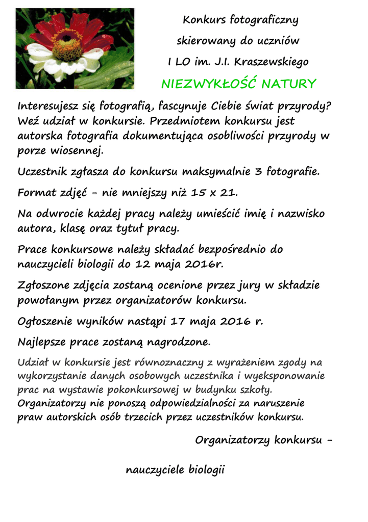 Konkurs fotograficzny skierowany do uczniów I LO im. J.I. Kraszewskiego NIEZWYKŁOŚĆ NATURY Interesujesz się fotografią, fascynuje Ciebie świat przyrody? Weź udział w konkursie. Przedmiotem konkursu jest autorska fotografia dokumentująca osobliwości przyrody w porze wiosennej. Uczestnik zgłasza do konkursu maksymalnie 3 fotografie. Format zdjęć - nie mniejszy niż 15 x 21. Na odwrocie każdej pracy należy umieścić imię i nazwisko autora, klasę oraz tytuł pracy. Prace konkursowe należy składać bezpośrednio do nauczycieli biologii do 12 maja 2016r. Zgłoszone zdjęcia zostaną ocenione przez jury w składzie powołanym przez organizatorów konkursu. Ogłoszenie wyników nastąpi 17 maja 2016 r. Najlepsze prace zostaną nagrodzone. Udział w konkursie jest równoznaczny z wyrażeniem zgody na wykorzystanie danych osobowych uczestnika i wyeksponowanie prac na wystawie pokonkursowej w budynku szkoły. Organizatorzy nie ponoszą odpowiedzialności za naruszenie praw autorskich osób trzecich przez uczestników konkursu. Organizatorzy konkursu nauczyciele biologii
