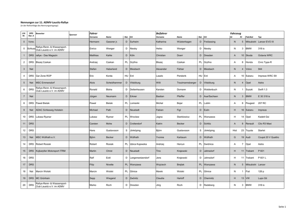 Nennungen zur 11. ADMV-Lausitz-Rallye (in der Reihenfolge des Nennungseingangs) Lfd. Nr. DRS Nat. A 0 Vorw. 0 Bewerber Rallye-Renn- & WassersportSchluss Club Lausitz e.V. im ADMV Sponsor Fahrer Beifahrer Vorname Name Nat. Ort Hermann Gassner jr. D Enrico Wenger Fahrzeug Vorname Name Nat. Ort Gr Kl Fabrikat Typ Surheim Katharina Wüstenhagen D Freilassing N 5 Mitsubishi Lancer EVO IX D Niesky Heiko Wenger D Niesky N 3 BMW Köln Christian Doerr D Dresden A 10 Skoda Octavia WRC 318 is 1 DRS rallye - Das Magazin Matthias Kahle D 2 DRS Blazej Czekan Andrzej Czekan PL Gryfino Blazej Czekan PL Gryfino A 8 Honda Civic Type-R 3 Nat Stefan Haberland D Alexander Färber D N 4 Volvo 944 4 DRS Gar Zone ROP Eric Korda Laszlo Penderik A 10 Subaru Impreza WRC S9 5 Nat Alois Scheidhammer D Vilsbiburg Willi Trautmannsberger D Vilsbiburg N 4 Opel Astra 6 Rallye-Renn- & WassersportDRS Club Lausitz e.V. im ADMV Ronald Blaha D Dettenhausen Karsten Domann D Waldenbuch N 1 Suzuki Swift 1.3 7 Nat Jürgen Neumann D Erkner Bastian Pfeiffer D Aue/Sachsen N 3 BMW E 30 318 is 8 DRS Pawel Bielak Pawel Bielak PL Lomianki Michal Bojar PL Lublin A 8 Peugeot 207 RC 9 Nat Michael Path D Fabian Figl D Eutin H 16 Subaru Impreza 10 DRS Lukasz Ryznar Lukasz Ryznar PL Wroclaw Jagna Stankiewicz PL Warszawa H 14 Opel Kadett Gsi 11 DRS Carsten Mohe D Crottendorf Katrin Becker D Schlitz A 8 Clio R3 Maxi 12 DRS Hans Gustavsson S Jönköping Björn Gustavsson S Jönköping 13 Nat Björn Becker D Wülfrath Yvonne Karbaum D Wülfrath 14 DRS Robert Rosiak Robert Rosiak PL Izbica Kujawska Andrzej Hercun 15 DRS Kojkarpfen Motorsport ITRM Martin Christ D Neustadt Tino 16 DRS Ralf Eckl D Langenwetzendorf 17 DRS Filip Nivette 18 Nat Marcin 19 DRS MC Grünhain 20 DRS MSC Emmersdorf ADAC Schleswig Holstein MSC Wülfrath e.V. Marcin Wolski Rallye-Renn- & WassersportClub Lausitz e.V. im ADMV Miesbach HU Erd Neustadt Miesbach HU Erd Hist Renault 23 Toyota Starlet G 19 Audi Coupé 20 V Quattro PL Swidnica A 7 Opel Astra Krajewski D Jahnsdorf H 11 Trabant P 601 Jens Krajewski D Jahnsdorf H 11 Trabant P 601 L PL Warszawa Wojciech Brejlak PL Warszawa N 5 Mitsubishi Lancer Wolski PL Glinice Marek Wolski PL Glinice N 1 Fiat Sepp Wiegand D Zwönitz Claudia Harloff D Chemnitz H 13 VW Lupo Gti Marko Roch D Dresden Jörg Roch D Radeberg N 3 318 is BMW 126 p Seite 1 Nennungen zur 11. ADMV-Lausitz-Rallye (in der Reihenfolge des Nennungseingangs) Lfd. Nr. DRS Nat. A Bewerber Sponsor Fahrer Beifahrer Fahrzeug Vorname Name Nat. Ort Vorname Name Nat. Ort Gr Kl Fabrikat Typ 21 DRS TT di Andrea Lupo Jiri Tosovsky CZ Katusice Josef Král CZ Liberec N 4 Mitsubishi Lancer Evo IX 22 DRS TT di Andrea Lupo Jaroslav Mikulenka CZ Olomouc Vladimir Dolínek CZ Olomouc N 4 Mitsubishi Lancer Evo VIII 23 Nat Ireniusz Pleskot PL Warszawa N.N. A 8 Opel Astra Gsi 24 DRS Renault Clio Ragnotti Ireniusz Pleskot Mark Muschiol D Chemnitz Karsten Stimpel D Chemnitz N 3 Sandro Buder D Halbendorf/Spree Enrico Frommer D Boxberg/O.L./ Tauer H 11 Trabant 601 Jan Halala Stepan Dalibor A 8 Ford Focus ST Thomas Grimm D Chemnitz Daniel Ehrhardt D Bernsbach H 11 Trabant P 601 ZR Timo Weigert D Rückersdorf Jasmin Tarim D 90542 N 3 E 30 318 is Klemke D Oderberg H 11 Trabant P 601 ITRM 5 TT 8N 25 Nat Rallye-Renn- & WassersportClub Lausitz e.V. im ADMV 26 Nat Auto Halala 27 DRS Chemnitzer AMC e.V. 28 DRS MC Lauf e.V. im ADAC 29 DRS Eckhard Eichhorst D Brunow Michael 30 DRS Team Mentomedia Eric Karlsson D Miltenberg N.N. 31 DRS Team Mentomedia Eric Johansson S Vrena Martin 32 DRS Team Mentomedia Oscar Johansson S Vrena N.N. 33 DRS Pierre Römer D Claußnitz René Borrmann D 34 Nat Lazar Kan D Berlin Falkmar Platz 35 Nat Robby Fechner D Berlin Mario 36 DRS MC Grünhain Bernd Knüpfer D Rückersdorf-Reust 37 DRS Speedfactory Tobias Edelmann D 38 DRS Markus Puschmann 39 DRS rallye - Das Magazin Albert 40 DRS Marcin Abramowski Marcin MC Seelow e.V. im ADAC ADAC Team Nordbayern e.V. CZ Hradek n. Nisou CZ Liberec F-2005 Andersson S Götene BMW Audi A 10 Mitsubishi Evo VI N 4 Claußnitz H 11 Trabant 601 ITRM D Wittenberg N 3 Ford Fiesta ST Schunke D Mülsen N 2 Mitsibishi Colt 16 V Alexander Hirsch D Tannenberg N 3 Opel Astra OPC Grünhain Sven Uhlrich D Breitenbrunn H 12 Nissan Micra D Hartenstein Marcel Heuer D Hartenstein H 12 Nissan Micra von Thurn und Taxis D Regensburg Sandra Bufe D Frauenwald N 5 Mitsubishi Lancer Evo IX Abramowski PL Dywity Daniel Siatkowski PL Olsztyn N 4 Mitsubishi Lancer Evo IX Volvo 940 Seite 2