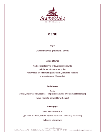 MENU Zupa Zupacebulowazgrzankamiiserem Daniegłówne Warkoczdrobiowyzgrilla,pieczeńzszynki, polędwicawieprzowazgrilla. Podawanezziemniakamigotowanymi,kluskamiśląskimi orazsurówkami(3rodzaje). Dodatkowo Ciasta (sernik,makowiec,murzynek–wypiekiwłasnenaswojskichskładnikach) Kawa,herbata,kompot(wdzbanku) Zimnapłyta Deskawędlinswojskich (golonka,kiełbasa,rolada,szynkawędzona–zwłasnejwędzarni) Galaretkiwieprzowe RestauracjaStaropolska KuźnicaPiaskowa71·42-510WojkowiceKościelne·tel.:(32)6743725·[email protected] Sałatkaśledziowawolejuzogórkiemkiszonymicebulką Sałatki(jarzynowa,grecka,ryżowaztuńczykiem) Ogórekkiszony,grzybki,śliwkawoccie(wdzbankach) Owoce Pieczywo(wypiekwłasnynazakwasie) Smaleczeskwarkami(dzbanek) Wceniezestawu Napoje(wodaniegazowanazcytryną,sok100%Cappy,Coca-Cola) Pokrycianakrzesłabankietowe Obsługakelnerska Bezpłatnyparkingstrzeżonydlagości Możliwośćprzeprowadzeniesesjizdjęciowejnaterenielokalu Obsługaczystościsanitariatów Cenaniezawiera Napojówalkoholowych Tortu(cenauzależnionaodwagiorazdekoracji) Cenazestawu:119zł/os.1) 1)Cenanarok2016 RestauracjaStaropolska KuźnicaPiaskowa71·42-510WojkowiceKościelne·tel.:(32)6743725·[email protected]