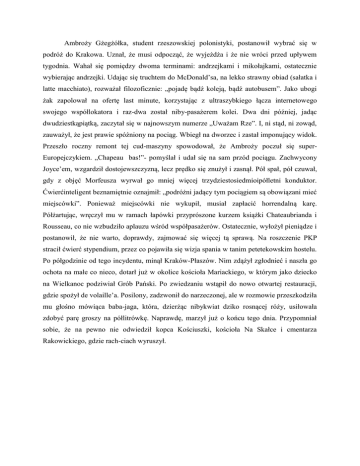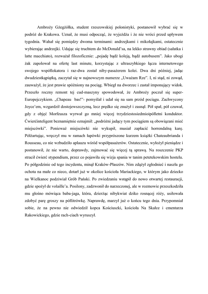 Ambroży Gżegżółka, student rzeszowskiej polonistyki, postanowił wybrać się w podróż do Krakowa. Uznał, że musi odpocząć, że wyjeżdża i że nie wróci przed upływem tygodnia. Wahał się pomiędzy dwoma terminami: andrzejkami i mikołajkami, ostatecznie wybierając andrzejki. Udając się truchtem do McDonald’sa, na lekko strawny obiad (sałatka i latte macchiato), rozważał filozoficznie: „pojadę bądź koleją, bądź autobusem”. Jako ubogi żak zapolował na ofertę last minute, korzystając z ultraszybkiego łącza internetowego swojego współlokatora i raz-dwa został niby-pasażerem kolei. Dwa dni później, jadąc dwudziestkąpiątką, zaczytał się w najnowszym numerze „Uważam Rze”. I, ni stąd, ni zowąd, zauważył, że jest prawie spóźniony na pociąg. Wbiegł na dworzec i zastał imponujący widok. Przeszło roczny remont tej cud-maszyny spowodował, że Ambroży poczuł się superEuropejczykiem. „Chapeau bas!”- pomyślał i udał się na sam przód pociągu. Zachwycony Joyce’em, wzgardził dostojewszczyzną, lecz prędko się znużył i zasnął. Pół spał, pół czuwał, gdy z objęć Morfeusza wyrwał go mniej więcej trzydziestosiedmioipółletni konduktor. Ćwierćinteligent beznamiętnie oznajmił: „podróżni jadący tym pociągiem są obowiązani mieć miejscówki”. Ponieważ miejscówki nie wykupił, musiał zapłacić horrendalną karę. Półżartując, wręczył mu w ramach łapówki przyprószone kurzem książki Chateaubrianda i Rousseau, co nie wzbudziło aplauzu wśród współpasażerów. Ostatecznie, wyłożył pieniądze i postanowił, że nie warto, doprawdy, zajmować się więcej tą sprawą. Na roszczenie PKP stracił ćwierć stypendium, przez co pojawiła się wizja spania w tanim petetekowskim hostelu. Po półgodzinie od tego incydentu, minął Kraków-Płaszów. Nim zdążył zgłodnieć i naszła go ochota na małe co nieco, dotarł już w okolice kościoła Mariackiego, w którym jako dziecko na Wielkanoc podziwiał Grób Pański. Po zwiedzaniu wstąpił do nowo otwartej restauracji, gdzie spożył de volaille’a. Posilony, zadzwonił do narzeczonej, ale w rozmowie przeszkodziła mu głośno mówiąca baba-jaga, która, dzierżąc nibykwiat dziko rosnącej róży, usiłowała zdobyć parę groszy na półlitrówkę. Naprawdę, marzył już o końcu tego dnia. Przypomniał sobie, że na pewno nie odwiedził kopca Kościuszki, kościoła Na Skałce i cmentarza Rakowickiego, gdzie rach-ciach wyruszył.