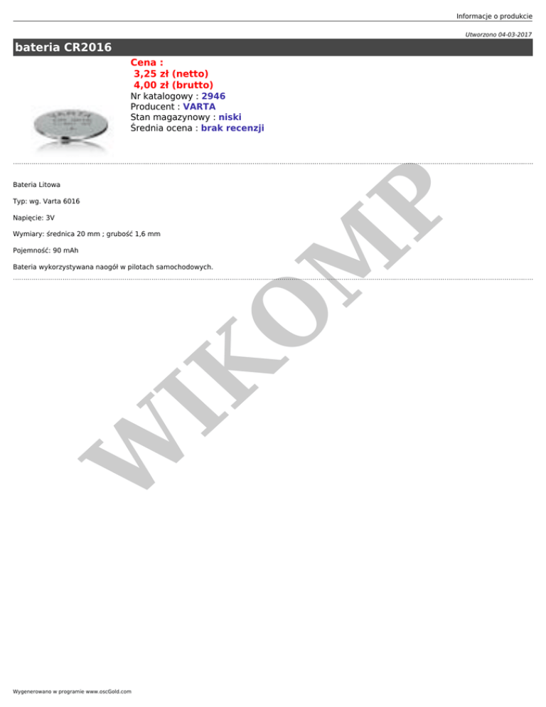 Informacje o produkcie Utworzono 04-03-2017 bateria CR2016 Cena : 3,25 zł (netto) 4,00 zł (brutto) Nr katalogowy : 2946 Producent : VARTA Stan magazynowy : niski Średnia ocena : brak recenzji Bateria Litowa P Typ: wg. Varta 6016 Napięcie: 3V O M Wymiary: średnica 20 mm ; grubość 1,6 mm Pojemność: 90 mAh W IK Bateria wykorzystywana naogół w pilotach samochodowych. Wygenerowano w programie www.oscGold.com