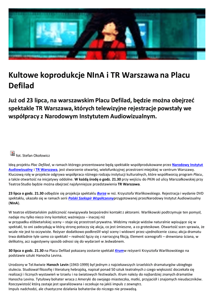 Kultowe koprodukcje NInA i TR Warszawa na Placu Defilad Już od 23 lipca, na warszawskim Placu Defilad, będzie można obejrzeć spektakle TR Warszawa, których telewizyjne rejestracje powstały we współpracy z Narodowym Instytutem Audiowizualnym. fot. Stefan Okołowicz Ideą projektu Plac Defilad, w ramach którego prezentowane będą spektakle współprodukowane przez Narodowy Instytut Audiowizualny i TR Warszawa, jest stworzenie otwartej, wielofunkcyjnej przestrzeni miejskiej w centrum Warszawy. Kluczową rolę w projekcie odgrywa współpraca różnego rodzaju instytucji kulturalnych, które współtworzą program Placu, a także otwartość na inicjatywy oddolne. W każdą środę o godz. 21.30 przy wejściu do PKiN od ulicy Marszałkowskiej przy Teatrze Studio będzie można obejrzeć najsłynniejsze przedstawienia TR Warszawa. 23 lipca o godz. 21.30 odbędzie się projekcja spektaklu Burza w reż. Krzysztofa Warlikowskiego. Rejestracja i wydanie DVD spektaklu, ukazało się w ramach serii Polski Szekspir Współczesnyprzygotowanej przezNarodowy Instytut Audiowizualny (NInA). W teatrze elżbietańskim publiczność nawiązywała bezpośredni kontakt z aktorami. Warlikowski podtrzymuje ten pomysł, nadaje mu tylko nieco inny kontekst; ważniejsza – inaczej niż w przypadku elżbietańskiej sceny – staje się przestrzeń prywatna. Widzimy reakcje widzów naturalnie wpisujące się w spektakl, to oni zadecydują w którą stronę potoczy się akcja, co jest śmieszne, a co groteskowe. Otwartość scen sprawia, że wcale nie jest to oczywiste. Reżyser dodatkowo podkreślił więź sceny i widowni przez ujednolicenie czasu; akcja dramatu trwa dokładnie tyle samo co spektakl – realność łączy się z narracyjną fikcją. Element scenografii – drewniana ściana, w delikatny, acz sugestywny sposób odnosi się do wydarzeń w Jedwabnem. 30 lipca o godz. 21.30 na Placu Defilad pokazany zostanie spektakl Krumw reżyserii Krzysztofa Warlikowskiego na podstawie sztuki Hanocha Levina. Urodzony w Tel Awiwie Hanoch Levin (1943-1999) był jednym z najciekawszych izraelskich dramaturgów ubiegłego stulecia. Studiował filozofię i literaturę hebrajską, napisał ponad 50 sztuk teatralnych z czego większość doczekała się realizacji i licznych wystawień w Izraelu i na światowych festiwalach. Krum należy do najbardziej znanych dramatów Hanocha Levina. Tytułowy bohater wraca z Ameryki do swojego miasteczka, matki, przyjaciół i znajomych nieudaczników. Rzeczywistość którą zastaje jest sparaliżowana i oczekuje na jakiś impuls z zewnątrz. Impuls nadchodzi, ale chaotyczne działania bohaterów do niczego nie prowadzą. 6 sierpnia o godz. 21.30 odbędzie się pokaz spektaklu 2007: Macbeth w reżyserii Grzegorza Jarzyny. Jest to mroczna historia o władzy i ludzkich namiętnościach. Teatralna premiera spektaklu TR Warszawa z udziałem m.in. Cezarego Kosińskiego, Aleksandry Koniecznej, Danuty Stenki i Tomasza Tyndyka odbyła się w maju 2005 roku. Reżyser przepisał klasyczne dzieło Williama Szekspira na współczesność i osadził akcję na Bliskim Wschodzie, czerpiąc inspiracje i ozdabiając warstwę narracyjną licznymi aluzjami do kina klasy A: Czasu Apokalipsy Francisa Forda Coppoli, 2001: Odysei kosmicznej Stanleya Kubricka czy Helikoptera w ogniu Ridleya Scotta. Filmowy naturalizm i dosłowność, które w spektaklu były chwytem ryzykownym, świetnie się sprawdziły w wersji telewizyjnej zrealizowanej przez Narodowy Instytut Audiowizualny. Powstało efektowne widowisko na pograniczu teatru, filmu i telewizji, realistycznie filmowane, ale zanurzone w niepokojącej aurze szaleństwa, które ogarnia Makbeta i jego świat. 2007: Macbeth to jeden z trzech spektakli, które zostały zarejestrowane w serii Polski Szekspir Współczesny. W jej ramach Narodowy Instytut Audiowizualny wydał również płytę H. – współczesną interpretację Hamleta w reżyserii Jana Klaty. Wszystkich, którzy nie będą mogli uczestniczyć w pokazach na Placu Defilad, Narodowy Instytut Audiowizualny zaprasza do portalu NINATEKA.pl – multimedialnej biblioteki zawierającej obecnie ponad 3500 materiałów audiowizualnych dotyczących szeroko pojętej kultury, wśród których można znaleźć kilkanaście ważnych i uznanych spektakli teatralnych ostatnich lat. Narodowy Instytut Audiowizualny jest partnerem pokazów, które odbędą się w ramach projektu Plac Defilad. Data publikacji: 21 / 07 / 2014