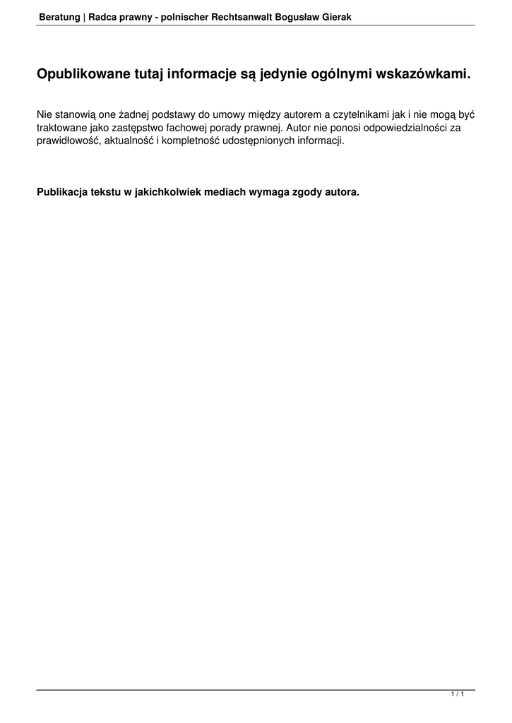 Beratung | Radca prawny - polnischer Rechtsanwalt Bogusław Gierak Opublikowane tutaj informacje są jedynie ogólnymi wskazówkami. Nie stanowią one żadnej podstawy do umowy między autorem a czytelnikami jak i nie mogą być traktowane jako zastępstwo fachowej porady prawnej. Autor nie ponosi odpowiedzialności za prawidłowość, aktualność i kompletność udostępnionych informacji. Publikacja tekstu w jakichkolwiek mediach wymaga zgody autora. 1/1