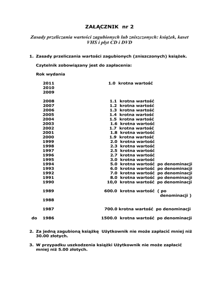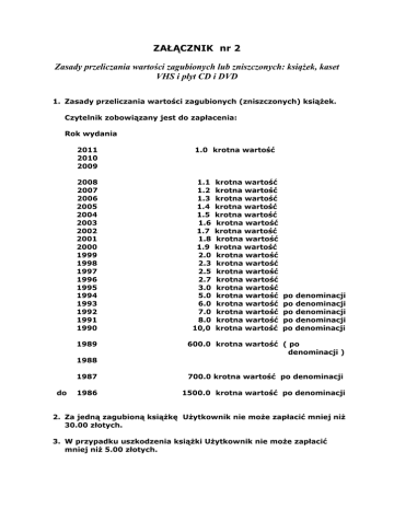 ZAŁĄCZNIK nr 2 Zasady przeliczania wartości zagubionych lub zniszczonych: książek, kaset VHS i płyt CD i DVD 1. Zasady przeliczania wartości zagubionych (zniszczonych) książek. Czytelnik zobowiązany jest do zapłacenia: Rok wydania 2011 2010 2009 2008 2007 2006 2005 2004 2003 2002 2001 2000 1999 1998 1997 1996 1995 1994 1993 1992 1991 1990 1989 1.0 krotna wartość 1.1 1.2 1.3 1.4 1.5 1.6 1.7 1.8 1.9 2.0 2.3 2.5 2.7 3.0 5.0 6.0 7.0 8.0 10,0 krotna wartość krotna wartość krotna wartość krotna wartość krotna wartość krotna wartość krotna wartość krotna wartość krotna wartość krotna wartość krotna wartość krotna wartość krotna wartość krotna wartość krotna wartość krotna wartość krotna wartość krotna wartość krotna wartość po denominacji po denominacji po denominacji po denominacji po denominacji 600.0 krotna wartość ( po denominacji ) 1988 do 1987 700.0 krotna wartość po denominacji 1986 1500.0 krotna wartość po denominacji 2. Za jedną zagubioną książkę Użytkownik nie może zapłacić mniej niż 30.00 złotych. 3. W przypadku uszkodzenia książki Użytkownik nie może zapłacić mniej niż 5.00 złotych. W przypadku książki wyjątkowo cennej (np. dzieła klasyków pedagogiki i psychologii, części dzieł wielotomowych, jedyny egzemplarz) obowiązuje wycena antykwaryczna. 4. Nie przyjmujemy zwrotów uszkodzonych przez Użytkownika kaset VHS, płyt CD i DVD. Użytkownik płaci za uszkodzony egzemplarz nie mniej niż 30 złotych.