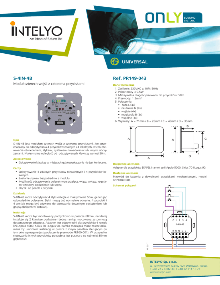 UNIVERSAL S-4IN-4B Ref. PR149-043 Moduł czterech wejść z czterema przyciskami Dane techniczne 1.Zasilanie: 230VAC ± 10% 50Hz 2.Pobór mocy < 0.5W 3.Maksymalna długość przewodu do przycisków: 50m 4.Przewody: 1.5mm2 5.Połączenia: • faza L (4x) • neutralne N (4x) • wejście (4x) • magistrala B (2x) • wspólne (1x) 6.Wymiary: A = 71mm / B = 28mm / C = 48mm / D = 35mm B Opis A C A S-4IN-4B jest modułem czterech wejść z czterema przyciskami. Jest przeznaczony do odczytywania 4 przycisków zdalnych i 4 lokalnych, w celu sterowania oświetleniem, stykami, systemem nawadniania lub innymi obciążeniami. Maksymalna odległość od odczytywanych klawiszy wynosi 50m. • Odczytywanie klawiszy w miejscach gdzie przełączanie nie jest konieczne. Cechy • Odczytywanie 4 zdalnych przycisków niezależnych i 4 przycisków lokalnych. • Zasilanie styków bezpośrednio z modułu • Możliwość odczytywania poleceń typu przełącz, włącz, wyłącz, regulator czasowy, opóźnienie lub scena • Złączki na panele i przyciski D A Zastosowanie Dołączone akcesoria Adapter dla przycisków EFAPEL i ramek serii Apolo 5000, Sirius 70 i Logus 90. Dostępne akcesoria Przewód do łączenia z dowolnymi przyciskami mechanicznymi, model nr PR100-001. Schemat połączeń Działanie S-4IN-4B może odczytywać 4 styki odległe o maksymalnie 50m, generując odpowiednie polecenie. Styki muszą być normalnie otwarte. 4 przyciski i 4 wejścia mogą być używane do sterowania dowolnym obciążeniem lub grupą obciążeń w instalacji. Instalacja S-4IN-4B może być montowany podtynkowo w puszcze 60mm, na której instaluje się 2 klawisze podwójne i jedną ramkę, mocowaną za pomocą dostarczonego adaptera. Adapter jest odpowiedni dla przycisków i ramek linii Apolo 5000, Sirius 70 i Logus 90. Ramka mocująca może zostać odłamana by umożliwić instalację w puszce z innym panelem sterującym (w tym celu wymagane jest podłączenie przewodu PR100-001). W przypadku stosowania innych przycisków potrzebna jest puszka o co najmniej 85mm głębokości C 1 2 3 4 S-4IN-4B B N N L L L N B INTELYO Sp. z o.o. ul. Zelwerowicza 4/4; 02-928 Warszawa, Polska T +48 22 213 82 30, F +48 22 211 18 72 www.intelyo.com