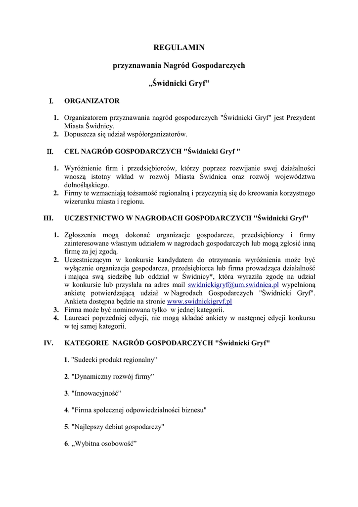 REGULAMIN przyznawania Nagród Gospodarczych „Świdnicki Gryf” I. ORGANIZATOR 1. Organizatorem przyznawania nagród gospodarczych "Świdnicki Gryf" jest Prezydent Miasta Świdnicy. 2. Dopuszcza się udział współorganizatorów. II. CEL NAGRÓD GOSPODARCZYCH "Świdnicki Gryf " 1. Wyróżnienie firm i przedsiębiorców, którzy poprzez rozwijanie swej działalności wnoszą istotny wkład w rozwój Miasta Świdnica oraz rozwój województwa dolnośląskiego. 2. Firmy te wzmacniają tożsamość regionalną i przyczynią się do kreowania korzystnego wizerunku miasta i regionu. III. UCZESTNICTWO W NAGRODACH GOSPODARCZYCH "Świdnicki Gryf" 1. Zgłoszenia mogą dokonać organizacje gospodarcze, przedsiębiorcy i firmy zainteresowane własnym udziałem w nagrodach gospodarczych lub mogą zgłosić inną firmę za jej zgodą. 2. Uczestniczącym w konkursie kandydatem do otrzymania wyróżnienia może być wyłącznie organizacja gospodarcza, przedsiębiorca lub firma prowadząca działalność i mająca swą siedzibę lub oddział w Świdnicy*, która wyraziła zgodę na udział w konkursie lub przysłała na adres mail [email protected] wypełnioną ankietę potwierdzającą udział w Nagrodach Gospodarczych "Świdnicki Gryf". Ankieta dostępna będzie na stronie www.swidnickigryf.pl 3. Firma może być nominowana tylko w jednej kategorii. 4. Laureaci poprzedniej edycji, nie mogą składać ankiety w następnej edycji konkursu w tej samej kategorii. IV. KATEGORIE NAGRÓD GOSPODARCZYCH "Świdnicki Gryf" 1. "Sudecki produkt regionalny" 2. "Dynamiczny rozwój firmy” 3. "Innowacyjność" 4. "Firma społecznej odpowiedzialności biznesu" 5. "Najlepszy debiut gospodarczy" 6. „Wybitna osobowość” 7. “Najlepszy pracodawca” 8. „Najlepsza obsługa klienta” 9.”Najlepsza firma transgraniczna” 10.”Wybitna osobowość pogranicza” V. KRYTERIA OCENY DO NAGRÓD GOSPODARCZYCH "Świdnicki Gryf" Kandydatury do otrzymania Nagród w poszczególnych kategoriach za wyjątkiem kategorii "Najlepszy Pracodawca", ”Najlepsza obsługa klienta”, „Wybitna osobowość” „Najlepsza firma trans graniczna” i „Wybitna osobowość pogranicza” oceniane są na podstawie informacji uzyskanych z ankiet. 1. Sudecki produkt regionalny – niezbędne informacje (dotyczy roku poprzedzającego rok, w którym składane jest zgłoszenie): a) regionalna identyfikacja produktu, b) posiadane certyfikaty, wyróżnienia, c) sposób promowania i dystrybucji, d) dostępność produktu, e) szanse produktu na rynku europejskim. 2. Dynamiczny rozwój firmy -niezbędne informacje (dotyczy roku poprzedzającego rok, w którym składane jest zgłoszenie): a) dynamika zmian w wielkości przychodów ze sprzedaży, b) dynamika wzrostu zatrudnienia, c) kreatywność w zarządzaniu, d) rentowność działalności, e) pozyskane środki z UE i ich wykorzystanie, f) konkurencyjność, image firmy. 3. Innowacyjność -niezbędne informacje (dotyczy roku poprzedzającego rok, w którym składane jest zgłoszenie): a) działania nowatorskie - usprawnianie i ulepszanie procesów produkcyjnych, b) rozwijanie oraz tworzenie nowych produktów lub już istniejących, c) nowoczesność stosowanych technologii, d) wpływ stosowanych technologii na środowisko naturalne, e) jakość produktów lub usług. 4. Firma społecznej odpowiedzialności biznesu – niezbędne informacje (dotyczy roku poprzedzającego rok, w którym składane jest zgłoszenie): a) prowadzenie nowoczesnego biznesu w ramach tradycyjnych, kupieckich reguł, b) prowadzenie biznesu w taki sposób, aby uwzględniać wartości etyczne, obowiązujące zasady prawa, szacunek dla pracowników, społeczeństwa i środowiska przyrodniczego, c) dostarczanie usług i produktów w sposób nie degradujący środowiska przyrodniczego i społecznego, d) inwestowanie w zasoby ludzkie, e) działalność charytatywna na rzecz społeczności lokalnej, f) przełamywanie barier architektonicznych i stereotypów dotyczących niepełnosprawności – obsługi klienta, zatrudnienia, funkcjonalnych zmian architektonicznych g) promowanie miasta i jego mieszkańców, h) dobre relacje z klientami, dostawcami i administracją samorządową. 5. Najlepszy debiut gospodarczy – niezbędne informacje: a) rozpoczęcie działalności gospodarczej maksymalnie na 3 lata kalendarzowe poprzedzające rok kandydowania do Nagrody, b) prowadzenie działalności gospodarczej przez okres przynajmniej 12 miesięcy poprzedzających miesiąc zgłoszenia do Nagrody, c) stosowanie innowacji produktowej, procesowej lub organizacyjnej, d) wysoka ocena klientów/odbiorców. 6. Wybitna osobowość – Członkowie Kapituły Nagród Gospodarczych „Świdnicki Gryf” mają prawo zgłosić kandydatów. Każde zgłoszenie musi zawierać uzasadnienie. Decyzję o przyznaniu Nagrody podejmuje wyłącznie Prezydent Miasta Świdnicy. 7. Nagrody w kategorii “Najlepszy pracodawca” i „Najlepsza obsługa klienta” otrzymują przedsiębiorcy, którzy zdobyli największą ilość głosów. Termin i warunki głosowania będą podane na stronie www.swidnickigryf.pl. 8. Nominacje w kategoriach „Najlepsza firma transgraniczna” i „Wybitna osobowość pogranicza” zgłasza Miasto Trutnov. Decyzję o przyznaniu Nagrody podejmuje Kapituła. VI. KAPITUŁA NAGRÓD GOSPODARCZYCH "Świdnicki Gryf " 1. W skład Kapituły wchodzą: a) Prezydent Miasta Świdnicy, b) II Z-ca Prezydenta Miasta Świdnicy, c) laureaci ubiegłorocznej edycji, d) zaproszone organizacje okołobiznesowe. 2. Kapituła przyznaje Nagrody wyłącznie w kategoriach: a) „Sudecki produkt regionalny”, b) „Dynamiczny rozwój firmy”, c) „Innowacyjność”, d) „Firma społecznej odpowiedzialności biznesu”, e) „Najlepszy debiut gospodarczy”, f) „Najlepsza firma transgraniczna”, g) „Wybitna osobowość pogranicza”. 3. Kapituła bez względu na otrzymane ankiety może nominować inne organizacje gospodarcze, przedsiębiorstwa lub firmy 