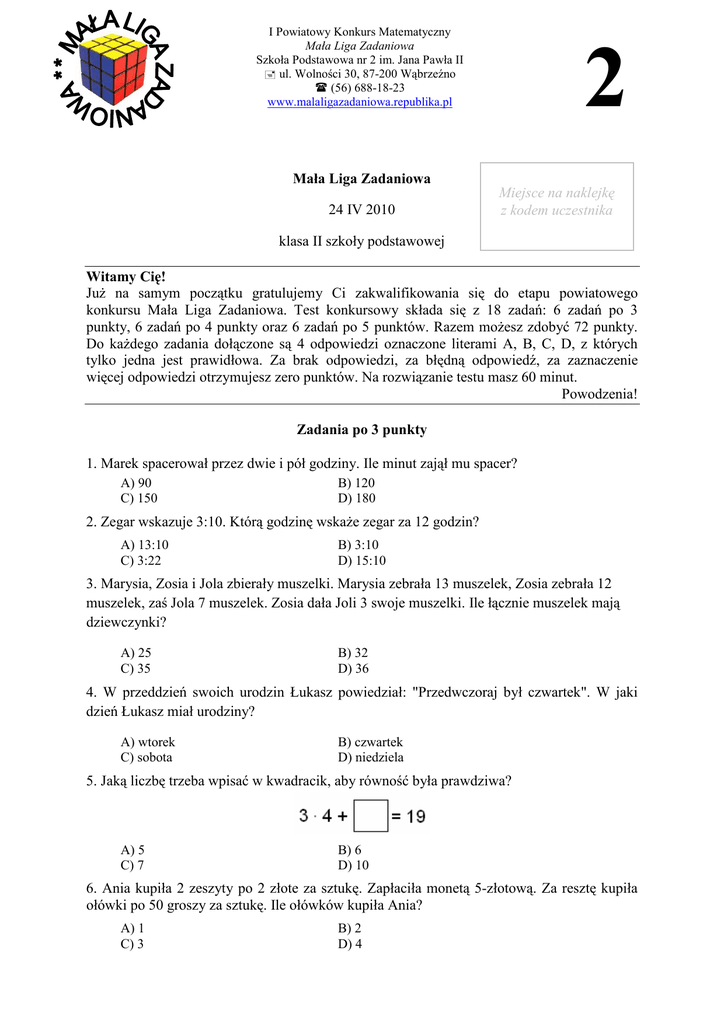 I Powiatowy Konkurs Matematyczny Mała Liga Zadaniowa Szkoła Podstawowa nr 2 im. Jana Pawła II ul. Wolności 30, 87-200 Wąbrzeźno (56) 688-18-23 www.malaligazadaniowa.republika.pl 2 Mała Liga Zadaniowa 24 IV 2010 Miejsce na naklejkę z kodem uczestnika klasa II szkoły podstawowej Witamy Cię! JuŜ na samym początku gratulujemy Ci zakwalifikowania się do etapu powiatowego konkursu Mała Liga Zadaniowa. Test konkursowy składa się z 18 zadań: 6 zadań po 3 punkty, 6 zadań po 4 punkty oraz 6 zadań po 5 punktów. Razem moŜesz zdobyć 72 punkty. Do kaŜdego zadania dołączone są 4 odpowiedzi oznaczone literami A, B, C, D, z których tylko jedna jest prawidłowa. Za brak odpowiedzi, za błędną odpowiedź, za zaznaczenie więcej odpowiedzi otrzymujesz zero punktów. Na rozwiązanie testu masz 60 minut. Powodzenia! Zadania po 3 punkty 1. Marek spacerował przez dwie i pół godziny. Ile minut zajął mu spacer? A) 90 C) 150 B) 120 D) 180 2. Zegar wskazuje 3:10. Którą godzinę wskaŜe zegar za 12 godzin? A) 13:10 C) 3:22 B) 3:10 D) 15:10 3. Marysia, Zosia i Jola zbierały muszelki. Marysia zebrała 13 muszelek, Zosia zebrała 12 muszelek, zaś Jola 7 muszelek. Zosia dała Joli 3 swoje muszelki. Ile łącznie muszelek mają dziewczynki? A) 25 C) 35 B) 32 D) 36 4. W przeddzień swoich urodzin Łukasz powiedział: "Przedwczoraj był czwartek". W jaki dzień Łukasz miał urodziny? A) wtorek C) sobota B) czwartek D) niedziela 5. Jaką liczbę trzeba wpisać w kwadracik, aby równość była prawdziwa? A) 5 C) 7 B) 6 D) 10 6. Ania kupiła 2 zeszyty po 2 złote za sztukę. Zapłaciła monetą 5-złotową. Za resztę kupiła ołówki po 50 groszy za sztukę. Ile ołówków kupiła Ania? A) 1 C) 3 B) 2 D) 4 I Powiatowy Konkurs Matematyczny Mała Liga Zadaniowa Zadania po 4 punkty 7. Na wycieczce uczniowie maszerowali czwórkami. Asia zauwaŜyła, Ŝe jej czwórka jest ósma licząc od początku i ósma licząc od końca kolumny. Ile uczniów spacerowało na wycieczce? A) 52 C) 60 B) 56 D) 64 8. Marek urodził się w 2002 roku, Jego brat Jacek jest od niego młodszy o 6 lat. W którym roku Jacek będzie obchodził 10 urodziny? A) 2010 C) 2016 B) 2012 D) 2018 9. W klasie znajduje się 12 chłopców i 13 dziewcząt. Ile jeszcze dzieci musi wejść do klasy by dało się stworzyć ze wszystkich dzieci grupy 7 osobowe. Ile grup powstanie? A) 3 dzieci, 4 grupy C) 2 dzieci, 5 grup B) 4 dzieci, 4 grupy D) 1 dziecko, 4 grupy 10. Dla kaŜdego z 18 piłkarzy wyjeŜdŜających na mecz przygotowano po 3 koszulki, a dla 3 trenerów po 2 koszulki. Ile koszulek przygotowano? A) 23 C) 50 B) 26 D) 60 11. Budowle na poniŜszym rysunku są tworzone według pewnej zasady. Z ilu kółek będzie zbudowana piąta budowla? A) 14 C) 15 B) 14 D) 16 12. Ile trójkątów znajduje się na poniŜszym rysunku? A) 8 C) 12 B) 10 D) 15 I Powiatowy Konkurs Matematyczny Mała Liga Zadaniowa Zadania po 5 punktów 13. Trzy siostry: Ala, Ela i Ola wyruszyły z domu do szkoły. KaŜda z nich poszła inną drogą (patrz rysunek). Droga, której z dziewczynek jest najdłuŜsza? A) Ali C) Oli B) Eli D) Wszystkie drogi mają tę samą długość 14. Sześcioletni Karol ma o 5 lat starszego brata i 2 razy młodszą od siebie siostrę. Łączny wiek tego rodzeństwa jest połową wieku ich mamy. Ile lat ma mama Karola? A) 30 C) 40 B) 35 D) 42 15. Ile razy uŜyto cyfry 1 wypisując wszystkie liczby od 1 do 30 włącznie? A) 1 C) 13 B) 3 D) 14 16. Stefan ma 18 zapałek. Marek wziął tyle zapałek by zbudować trójkąt, w którym kaŜdy bok ma długość 2 zapałek. Z pozostałych zapałek Stefan zbudował prostokąt. Jeden bok prostokąta wynosi 2 zapałki. Jaka jest długość drugiego boku prostokąta? A) 2 zapałki C) 4 zapałki B) 3 zapałki D) 5 zapałek 17. Ile klocków trzeba zdjąć z budowli (rysunek 1), aby otrzymać budowlę widoczną na rysunku 2? Rysunek 1 A) 10 C) 12 Rysunek 2 B) 11 D) 13 18. Adam zauwaŜył, Ŝe jeŜeli kupi 5 porcji lodów, to zostanie mu 19 złotych, a jeŜeli kupi 8 takich porcji, to zostanie mu 10 złotych. Ile pieniędzy ma Adam? A) 21 zł C) 34 zł B) 29 zł D) 50 zł I Powiatowy Konkurs Matematyczny Mała Liga Zadaniowa Brudnopis