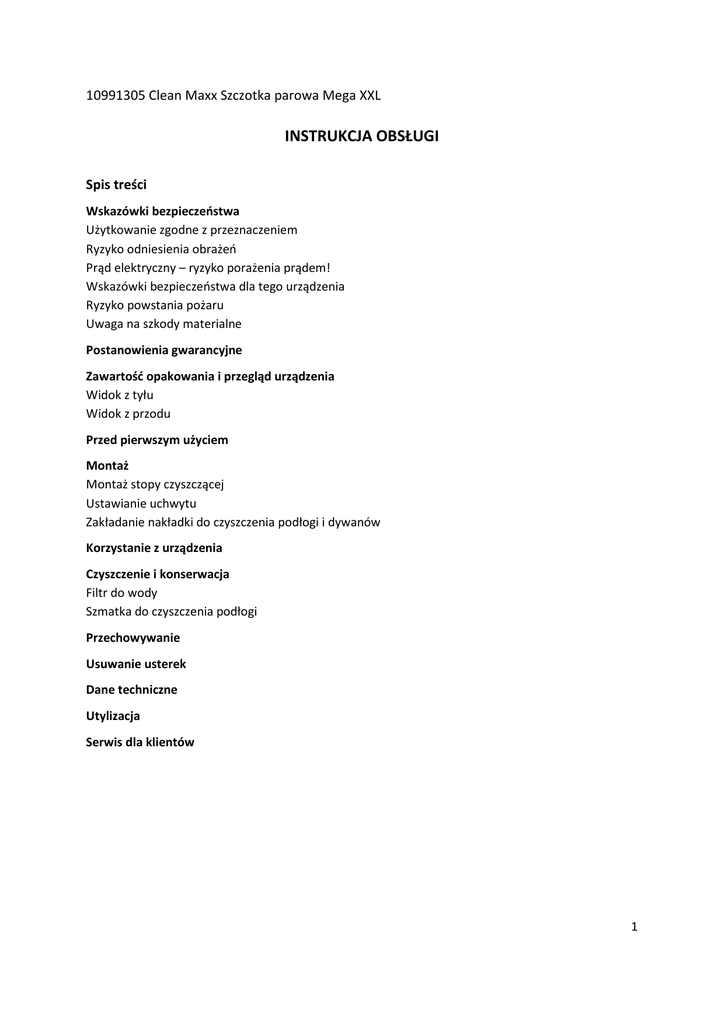 10991305 Clean Maxx Szczotka parowa Mega XXL INSTRUKCJA OBSŁUGI Spis treści Wskazówki bezpieczeństwa Użytkowanie zgodne z przeznaczeniem Ryzyko odniesienia obrażeń Prąd elektryczny – ryzyko porażenia prądem! Wskazówki bezpieczeństwa dla tego urządzenia Ryzyko powstania pożaru Uwaga na szkody materialne Postanowienia gwarancyjne Zawartość opakowania i przegląd urządzenia Widok z tyłu Widok z przodu Przed pierwszym użyciem Montaż Montaż stopy czyszczącej Ustawianie uchwytu Zakładanie nakładki do czyszczenia podłogi i dywanów Korzystanie z urządzenia Czyszczenie i konserwacja Filtr do wody Szmatka do czyszczenia podłogi Przechowywanie Usuwanie usterek Dane techniczne Utylizacja Serwis dla klientów 1 Drodzy Klienci, Cieszymy się, że zdecydowaliście się na zakup urządzenia Clean Maxx Szczotka parowa Mega XXL”. Urządzenie pozwala na utrzymanie higienicznej czystości bez korzystania ze środków chemicznych. Jest proste w i wygodne w użyciu, nadaje się do wszystkich typów podłóg, np. płytki, wykładziny, podłogi twarde, parkiet i laminat. Życzymy wiele radości z korzytania z naszego produktu. Przed pierwszym użyciem urządzenia proszę dokładnie zapoznać się z instrukcją obsługi i zachować ją. Jeśli urządzenie będzie przekazywane kolejnym osobom, należy przekazać je wraz z niniejszą instrukcją. Producent i importer nie ponoszą odpowiedzialności, jeśli zasady zawarte w niniejszej instrukcji nie będą przestrzegane. Oznaczenie symboli w instrukcji Takim symbolem są oznaczone wszystkie wskazówki bezpieczeństwa zawarte w instrukcji. Należy je uważni e przeczytać i dostosować się do nich, aby uniknąć powstania szkód rzeczowych oraz obrażeń u ludzi. Takim symbolem oznaczone są wszystkie rady i zalecenia. Urządzenie podczas pracy wytwarza gorącą parę! Wskazówki bezpieczeństwa Użycie zgodne z przeznaczeniem Urządzenie jest przeznaczone do czyszczenia powierzchni odpornych na działanie wysokich temperatur. Można je wykorzystać do czyszczenia podłóg z laminatu, jeśli będą przy tym przestrzegane następujące wskazówki: 1. Laminat musi być położony fachowo, nie może w nim być żadnych przerw ani zarysowań, w które mogłaby wniknąć wilgoć. 2. Należy zawsze wypróbować działanie urządzenia na niewidocznym fragmencie powierzchni i po jakimś czasie sprawdzić, czy laminat się nie pofalował lub czy nie wniknęła w niego wilgoć. 3. Jeśli na powierzchni nie ma żadnych negatywnych zjawisk, urządzeniem można wtedy wyczyścić całą powierzchnię. Urządzenie nie nadaje się do czyszczenia niezabezpieczonych podłóg drewninych, miękkiego tworzywa sztucznego i mebli z drewna. 2 Urządzenia nie można też stosować do czyszczenia powierzchni szklanych, ponieważ gorąca para może spowodować pęknięcie szkła. Należy zasięgnąć porady specjalisty w kwestii tego, czy dany typ wykładziny może być czyszczony szczotką parową. Urządzenie jest przeznaczone do użytku domowego, nie do działalności zarobkowej. Z urządzenia należy korzystać w sposób opisany w instrukcji. Każdy inny sposób użycia zostanie uznany za niezgodny z zaleceniami. Ryzyko doznania obrażeń • • • • • • Folię z opakowania należy przechowywać z dala od dzieci i zwierząt. Istnieje ryzyko uduszenia. Z urządzenia nie mogą korzystać osoby (w tym dzieci) z ograniczonymi zdolnościami sensorycznymi lub umysłowymi lub te, którym brak doświadczenia lub/i wiedzy, chyba że osoby będą korzystać z urządzenia pod nadzorem osób, które znają zasady korzystania z urządzenia. Należy przypilnować, aby dzieci nie używały rządzenia do zabawy. Wylotu pary nigdy nie należy kierować w stronę ludzi, zwierząt lub roślin ani innych delikatnych przedmiotów. Urządzenie należy przechowywać w miejscu niedostępnym dla dzieci. Kabel należy rozłożyć tak, aby nie stanowił zagrożenia w związku z możliwością potknięcia się o niego. Uwaga! Ryzyko poparzenia! Niewłaściwe korzystanie z urządzenia może doprowadzić do odniesienia obrażeń, poparzeń lub do porażenia prądem. Prąd elektryczny – ryzyko porażenia prądem • • • • • • • • Urządzenia nie wolno nigdy zanurzać w wodzie ani w innych cieczach. Urządzenie nie nadaje się do korzystania z niego na wolnym powietrzu. Urządzenie wolno podłączyć jedynie do gniazdka, które zostało fachowo zainstalowane i które odpowiada wymaganiom technicznym urządzenia (patrz rozdział „Dane techniczne”). Wolno korzystać wyłącznie z wyposażenia, które zostało dołączone do urządzenia lub jest zalecane przez producenta. Jeśli urządzenie przez dłuższy czas nie jest używane, należy wyłączyć wtyczkę z gniazdka. Wtyczkę należy wyjąć z gniazdka także podczas burzy oraz przed czyszczeniem urządzenia. Wyjmując wtyczkę z gniazdka należy pociągać za wtyczkę, nigdy za kabel. Uszkodzony kabel zasilający należy oddać do naprawy do serwisu producenta lub do wyspecjalizowanego warsztatu. Z urządzenia nie wolno nigdy korzystać bez nadzoru. Wskazówki bezpieczeństwa dla tego urządzenia • Dla własnego bezpieczeństwa należy skontrolować urządzenie przed każdym użyciem. Jeśli urządzenie jest uszkodzone nie wolno z niego korzystać do momentu naprawienia go przez fachowca. 3 • • • • Urządzenia nie wolno rozbierać na części ani podejmować prób samodzielnej naprawy. Należy zwrócić się do serwisu (patrz rozdział: „Serwis dla klientów”) lub do innego fachowca. Przed każdym skorzystaniem z urządzenia należy sprawdzić szmatkę do czyszczenia podłogi pod kątem zużycia. Nie wolno jej używać, jeśli wykazuje widoczne oznaki zużycia lub jest uszkodzona. Może dojść do uszkodzenia powierzchni podłogi! Z urządzenia wolno korzystać wyłącznie wtedy, gdy jest całkowicie złożone i nadaje się do użycia. Przed napełniania pojemnika wodą, wymianą szmatki czyszcz