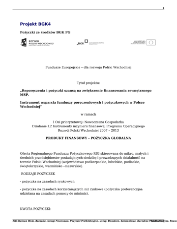 1 Projekt BGK4 Pożyczki ze środków BGK PG Fundusze Europejskie – dla rozwoju Polski Wschodniej Tytuł projektu: „Reporęczenia i pożyczki szansą na zwiększenie finansowania zewnętrznego MSP. Instrument wsparcia funduszy poręczeniowych i pożyczkowych w Polsce Wschodniej” w ramach I Osi priorytetowej: Nowoczesna Gospodarka Działanie I.2 Instrumenty inżynierii finansowej Programu Operacyjnego Rozwój Polski Wschodniej 2007 – 2013 PRODUKT FINANSOWY – POŻYCZKA GLOBALNA Oferta Regionalnego Funduszu Pożyczkowego RIG skierowana do mikro, małych i średnich przedsiębiorstw posiadających siedzibę i prowadzących działalność na terenie Polski Wschodniej (województwo podkarpackie, lubelskie, podlaskie, świętokrzyskie, warmińsko –mazurskie). RODZAJE POŻYCZEK - pożyczka na zasadach rynkowych - pożyczka na zasadach korzystniejszych niż rynkowe (pożyczka preferencyjna udzielana na zasadach pomocy de minimis). KWOTA POŻYCZKI: RIG Stalowa Wola. Rzeszów. Usługi Finansowe, Pożyczki Preferencyjne, -1/4Usługi Doradcze, Szkoleniowe, Doradcze Proinnowacyjne, 04.03.2017 Rozwó 2 Łączna maksymalna wartość jednostkowych pożyczek udzielanych jednemu pożyczkobiorcy wynosi 200 000 zł. PRZEZNACZENIE POŻYCZEK 1. Środki finansowe z udzielonej przez Fundusz pożyczki mogą być wykorzystywane na finansowanie działalności gospodarczej mikro, małego lub średniego przedsiębiorcy, w tym w szczególności na: a) finansowanie inwestycji polegających m.in. na zakupie, budowie lub modernizacji obiektów produkcyjno – usługowo – handlowych, b) tworzenie nowych miejsc pracy, c) wdrażanie nowych rozwiązań technicznych lub technologicznych, d) zakup wyposażenia w maszyny, urządzenia, aparaty w tym także zakup środków transportu bezpośrednio związanych z celem realizowanego przedsięwzięcia, e) oraz inne cele gospodarcze przyczyniające się do rozwoju MŚP, w tym cele obrotowe zgodnie z zapisami pkt 3.2.6-3.2.8 zawartymi w nocie wyjaśniającej w zakresie instrumentów inżynierii finansowej zgodnie z artykułem 44 Rozporządzenia Rady (WE) nr 1083/2006, tj. COCOF 10-0014/05 z dn. 8 lutego 2012r. 2. Jednostkowe Pożyczki nie mogą by przeznaczone wyłącznie na pokrywanie bieżących kosztów prowadzenia działalności gospodarczej. 3. Jednostkowe Pożyczki nie mogą być przeznaczone na cele konsumpcyjne, spłatę innych pożyczek i kredytów zaciągniętych w innych instytucjach finansowych oraz spłatę zobowiązań publiczno – prawnych. Pożyczka na warunkach korzystniejszych niż rynkowe (pożyczka preferencyjna) nie może być przeznaczona na zakup środków transportu drogowego towarów podmiotom prowadzącym działalność gospodarczą w zakresie drogowego transportu. Pożyczka preferencyjna udzielona zostaje na mocy Rozporządzenia Ministra Rozwoju Regionalnego z dnia 13 września 2011r. w sprawie udzielania przez Polską Agencję Rozwoju Przedsiębiorczości pomocy finansowej na rozwój instrumentów inżynierii finansowej w ramach Programu Operacyjnego Rozwój Polski Wschodniej (Dz. U. z 2011 nr 210 poz. 1255), zmienione rozporządzeniem Ministra Infrastruktury i Rozwoju z dnia 16 czerwca 2014r. (Dz. U. z dn. 25 czerwca 2014r. poz. 831). Pożyczka preferencyjna udzielona jest jako pomoc de minimis na warunkach określonych w rozporządzeniu Komisji (UE) nr 1407/2013 z dnia 18 grudnia 2013 r. w sprawie stosowania art. 107 RIG Stalowa Wola. Rzeszów. Usługi Finansowe, Pożyczki Preferencyjne, -2/4Usługi Doradcze, Szkoleniowe, Doradcze Proinnowacyjne, 04.03.2017 Rozwó 3 i 108 Traktatu o funkcjonowaniu Unii Europejskiej do pomocy de minimis. Warunki: • spłata przez okres do 60 miesięcy; • możliwość skorzystania z 6-miesięcznej karencji na spłatę kapitału; • oprocentowanie: • na warunkach korzystniejszych niż rynkowe (pożyczka preferencyjna) – 0% • na warunkach rynkowych – od 2,83% w skali roku (dla rozpoczynających działalność od 5,83% w skali roku – oprocentowanie ustalane jest zgodnie z wytycznymi nt. ustalania stóp referencyjnych); • zabezpieczeniem spłaty pożyczki jest weksel in blanco wraz z deklaracją wekslową. Ponadto zabezpieczenie może mieć formę: hipoteki, zastawu, poręczenia osób fizycznych lub prawnych, poręczenie funduszy poręczeniowych, przelewu (cesji) wierzytelności lub innych form zabezpieczenia przewidzianych przez prawo. Wartość proponowanego zabezpieczenia powinna być dostosowana do wnioskowanej kwoty pożyczki. Szczegółowe warunki dotyczące pożyczek znajdują się w Regulaminie Regionalnego Funduszu Pożyczkowego RIG (link do Regulaminu BGK PG). Dokumenty do pobrania: ● ● ● ● ● Regulamin funduszu BGK Tabela opłat BGK4 Załącznik2 – Metodyka „Zasady oceny przedsięborców” Załącznik 3 – Instrukcja udzielania pożyczek Załącznik 4 – Instrukcja windykacyjna WYKAZ DOKUMENTÓW POTRZEBNYCH DO WNIOSKU O POŻYCZKĘ: ● ● ● ● ● ● ● Wniosek o pożyczkę Oświadczenie o statusie przedsiębiorcy MSP Lista sprawdzająca Upoważnienie do BIG dla przedsiębiorcy Upoważnienie do BIG dla konsumentów (osoba fizyczna prowadząca działalność gospodarczą, współmałżonkowie pożyczkobiorców, poręczyciele, wspólnicy spółki cywilnej) Biznes Plan (dotyczy przedsiębiorców prowadzących działalność do 1 roku) Oswiadczenie poreczyciela DOKUMENTY FINANSOWE – KSIĘGOWOŚĆ UPROSZCZONA: RIG Stalowa Wola. Rzeszów. Usługi Finansowe, Pożyczki Preferencyjne, -3/4Usługi Doradcze, Szkoleniowe, Doradcze Proinnowacyjne, 04.03.2017 Rozwó 4 ● ● Bilans uproszczony Rachunek wyników uproszczony DOKUMENTY FINANSOWE – KSIĘGOWOŚĆ PEŁNA: ● ● Sprawozdanie finansowe – pełna księgowość Przepływy – pełna księgowość Dokumenty niezbędne przy ubieganiu się o pomoc de minimis: ● ● Zestawienie otrzymanej pomocy de minimis Formularz informacji przedstawianych przy ubieganiu się o pomoc de minimis DOKUMENTY POZOSTAŁE: ● ● Spraw