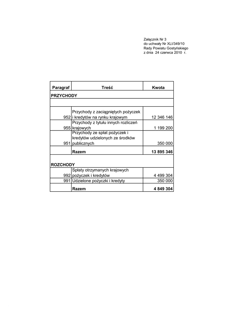 Załącznik Nr 3 do uchwały Nr XLI/349/10 Rady Powiatu Gostyńskiego z dnia 24 czerwca 2010 r. Paragraf Treść Kwota PRZYCHODY Przychody z zaciągniętych pożyczek 952 i kredytów na rynku krajowym Przychody z tytułu innych rozliczeń 955 krajowych Przychody ze spłat pożyczek i kredytów udzielonych ze środków 951 publicznych Razem ROZCHODY Spłaty otrzymanych krajowych 992 pożyczek i kredytów 991 Udzielone pożyczki i kredyty Razem 12 346 146 1 199 200 350 000 13 895 346 4 499 304 350 000 4 849 304