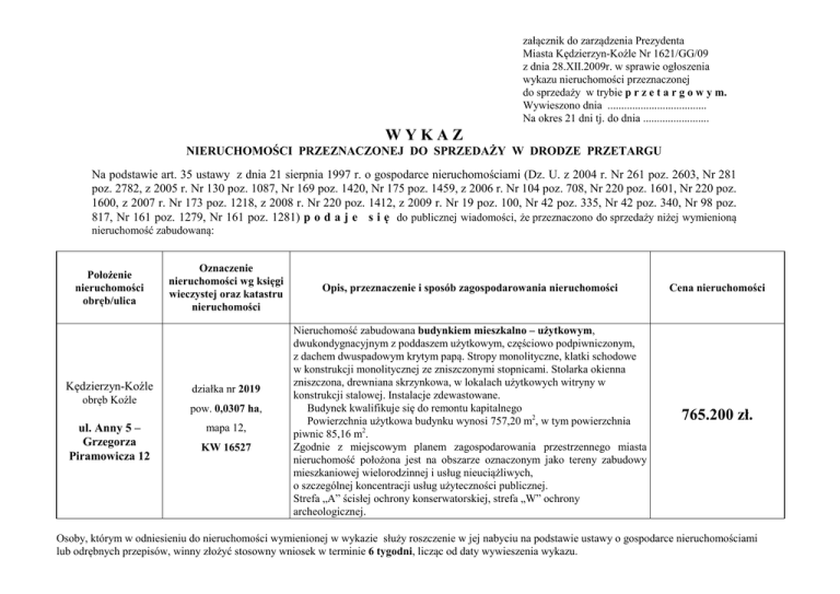 załącznik do zarządzenia Prezydenta Miasta Kędzierzyn-Koźle Nr 1621/GG/09 z dnia 28.XII.2009r. w sprawie ogłoszenia wykazu nieruchomości przeznaczonej do sprzedaży w trybie p r z e t a r g o w y m. Wywieszono dnia .................................... Na okres 21 dni tj. do dnia ........................ WYKAZ NIERUCHOMOŚCI PRZEZNACZONEJ DO SPRZEDAŻY W DRODZE PRZETARGU Na podstawie art. 35 ustawy z dnia 21 sierpnia 1997 r. o gospodarce nieruchomościami (Dz. U. z 2004 r. Nr 261 poz. 2603, Nr 281 poz. 2782, z 2005 r. Nr 130 poz. 1087, Nr 169 poz. 1420, Nr 175 poz. 1459, z 2006 r. Nr 104 poz. 708, Nr 220 poz. 1601, Nr 220 poz. 1600, z 2007 r. Nr 173 poz. 1218, z 2008 r. Nr 220 poz. 1412, z 2009 r. Nr 19 poz. 100, Nr 42 poz. 335, Nr 42 poz. 340, Nr 98 poz. 817, Nr 161 poz. 1279, Nr 161 poz. 1281) p o d a j e s i ę do publicznej wiadomości, że przeznaczono do sprzedaży niżej wymienioną nieruchomość zabudowaną: Położenie nieruchomości obręb/ulica Kędzierzyn-Koźle obręb Koźle ul. Anny 5 – Grzegorza Piramowicza 12 Oznaczenie nieruchomości wg księgi wieczystej oraz katastru nieruchomości działka nr 2019 pow. 0,0307 ha, mapa 12, KW 16527 Opis, przeznaczenie i sposób zagospodarowania nieruchomości Nieruchomość zabudowana budynkiem mieszkalno – użytkowym, dwukondygnacyjnym z poddaszem użytkowym, częściowo podpiwniczonym, z dachem dwuspadowym krytym papą. Stropy monolityczne, klatki schodowe w konstrukcji monolitycznej ze zniszczonymi stopnicami. Stolarka okienna zniszczona, drewniana skrzynkowa, w lokalach użytkowych witryny w konstrukcji stalowej. Instalacje zdewastowane. Budynek kwalifikuje się do remontu kapitalnego Powierzchnia użytkowa budynku wynosi 757,20 m2, w tym powierzchnia piwnic 85,16 m2. Zgodnie z miejscowym planem zagospodarowania przestrzennego miasta nieruchomość położona jest na obszarze oznaczonym jako tereny zabudowy mieszkaniowej wielorodzinnej i usług nieuciążliwych, o szczególnej koncentracji usług użyteczności publicznej. Strefa „A” ścisłej ochrony konserwatorskiej, strefa „W” ochrony archeologicznej. Cena nieruchomości 765.200 zł. Osoby, którym w odniesieniu do nieruchomości wymienionej w wykazie służy roszczenie w jej nabyciu na podstawie ustawy o gospodarce nieruchomościami lub odrębnych przepisów, winny złożyć stosowny wniosek w terminie 6 tygodni, licząc od daty wywieszenia wykazu.