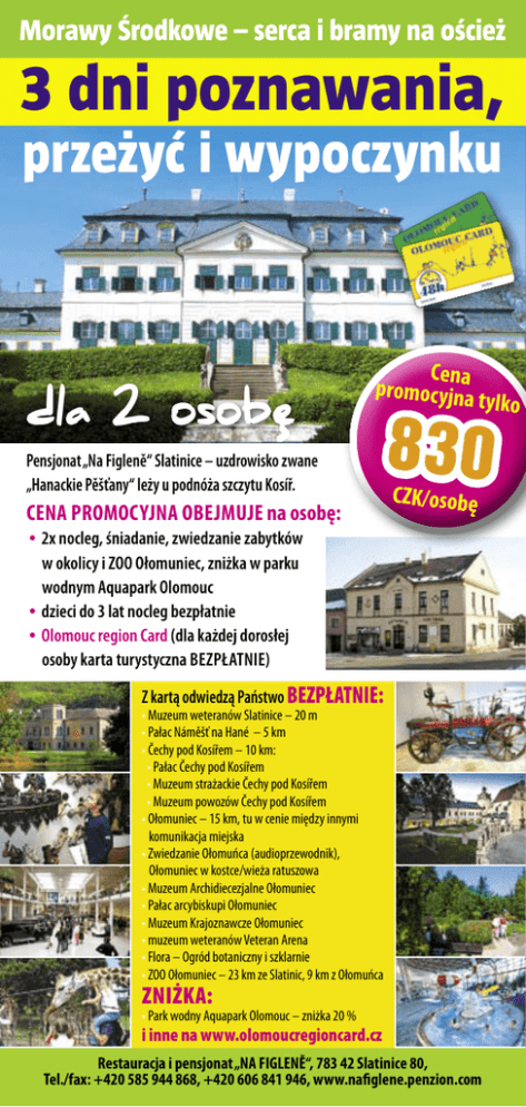 Morawy Środkowe – serca i bramy na oścież 3 dni poznawania, przeżyć i wypoczynku dla 2 osobe Cen promocyjnaa Pensjonat „Na Figleně“ Slatinice – uzdrowisko zwane „Hanackie Pěšťany“ leży u podnóża szczytu Kosíř. Cena promocyjna obejmuje na osobę: tylko 830 CZK/osobę • 2x nocleg, śniadanie, zwiedzanie zabytków w okolicy i ZOO Ołomuniec, zniżka w parku wodnym Aquapark Olomouc • dzieci do 3 lat nocleg bezpłatnie • Olomouc region Card (dla każdej dorosłej osoby karta turystyczna bezpłatnie) Z kartą odwiedzą Państwo BEZPŁATNIE: • Muzeum weteranów Slatinice – 20 m • Pałac Náměšť na Hané – 5 km • Čechy pod Kosířem – 10 km: • Pałac Čechy pod Kosířem • Muzeum strażackie Čechy pod Kosířem • Muzeum powozów Čechy pod Kosířem • Ołomuniec – 15 km, tu w cenie między innymi komunikacja miejska • Zwiedzanie Ołomuńca (audioprzewodnik), Ołomuniec w kostce/wieża ratuszowa • Muzeum Archidiecezjalne Ołomuniec • Pałac arcybiskupi Ołomuniec • Muzeum Krajoznawcze Ołomuniec • muzeum weteranów Veteran Arena • Flora – Ogród botaniczny i szklarnie • ZOO Ołomuniec – 23 km ze Slatinic, 9 km z Ołomuńca Zniżka: • Park wodny Aquapark Olomouc – zniżka 20 % i inne na www.olomoucregioncard.cz Restauracja i pensjonat „NA FIGLENĚ“, 783 42 Slatinice 80, Tel./fax: +420 585 944 868, +420 606 841 946, www.nafiglene.penzion.com Morawy Środkowe – serca i bramy na oścież IMPREZY 2011 PAŁAC NÁMĚŠŤ NA HANÉ • 25. 4. w godz. 9.00–16.00 Zwiedzanie wielkanocne pałacu • 14. 5. w godz. 9.00 – CHATEAU – XI. Rocznik turnieju petanque • 15. 5. w godz. 9.00 Náměšťská koule (Náměšťska kula) – VIII. rocznik zawodów trzyosobowych zespołów w petangue • 20. 5. w godz. 18.00 „Toulky pravěkou Náměští“ (Wędrówka przez prehistoryczną Náměšť) wykład Miroslava Šmída – w ramach imprezy Noce muzealne • 22. 5. w godz. 14.00 wernisaż wystawy fotografii N. Kovaříkovej i M. Kašpara” „Ołomuniec czterema oczyma“ • 22. 5.–30. 6. wystawa fotografii N. Kovaříkovej i M. Kašpara”„Ołomuniec czterema oczyma“ • 5. 6. w godz. 14.00 Dzień dziecka • czerwiec – wystawa Dany Sedlářovej i Hany Munsterovej • 10.–11. 6. Narodowy konkurs trębaczy • 18. 6. w godz. 17.00–22.00 Z bajki do bajki – wieczorne przeglądy bajek • lipiec – wystawa fotografii Mileny Valuškovej • 17. 7. w godz. 13.00–16.00 Popołudnie z Weczerniczkiem – rozrywkowe popołudnie z konkursami dla dzieci w parku • sierpień – wystawa fotografii Eduarda Zacha „Fotografie z Nepalu“ • sierpień – wystawa obrazów Zdeňki Giacintovej „Krajobrazy wewnętrzne i zewnętrzne“ • 11. 8. w godz. 16.00 – wernisaż wystawy Kwiaty dla pani na zamku • 11.–14. 8. w godz. 9.00–17.00 Kwiaty dla pani na zamku – wnętrza pałacu zdobione bukietami, imprezy towarzyszące • 12. 8. w godz. 18.00 Koncert wśród kwiatów w kaplicy pałacowej • 20. 8. w godz. 17.00–22.00 Z bajki do bajki – powtórzenie czerwcowych wieczornych przeglądów bajek • 29. 10. w godz. 16.00–22.00 Tajemniczy zamek – nocne zwiedzanie pałacu i podziemi • 8.–9. a 12.–15. 12. w godz. 8.00–12.00 Czar adwentu – specjalny program dla szkół podstawowych – zwyczaje i tradycje wigilijne, warsztaty dla dzieci Nocne zwiedzanie trzeba rezerwować telefonicznie! Zastrzega się możliwość zmiany programu. Więcej na: tel.: +420 585 952 184, e-mail: [email protected], www.zamek.namestnahane.cz Pom ysł na Wycieczka na rowerze: Trasa po pałacach i parkach Moraw Środkowych wycieczkę! Náměšť na Hané – Slatinice – Čechy pod Kosířem – Laškov (Krakovec) – Náměšť na Hané Długość trasy: 34 km, w przybliżeniu 3/5 przeważnie asfaltowej nawierzchni, prowadzi po mało ruchliwych drogach III. klasy, pozostała część przez lasy i polnymi drogami, trasa średnio trudna. Więcej informacji o turystyce rowerowej na www.ok-tourism.cz