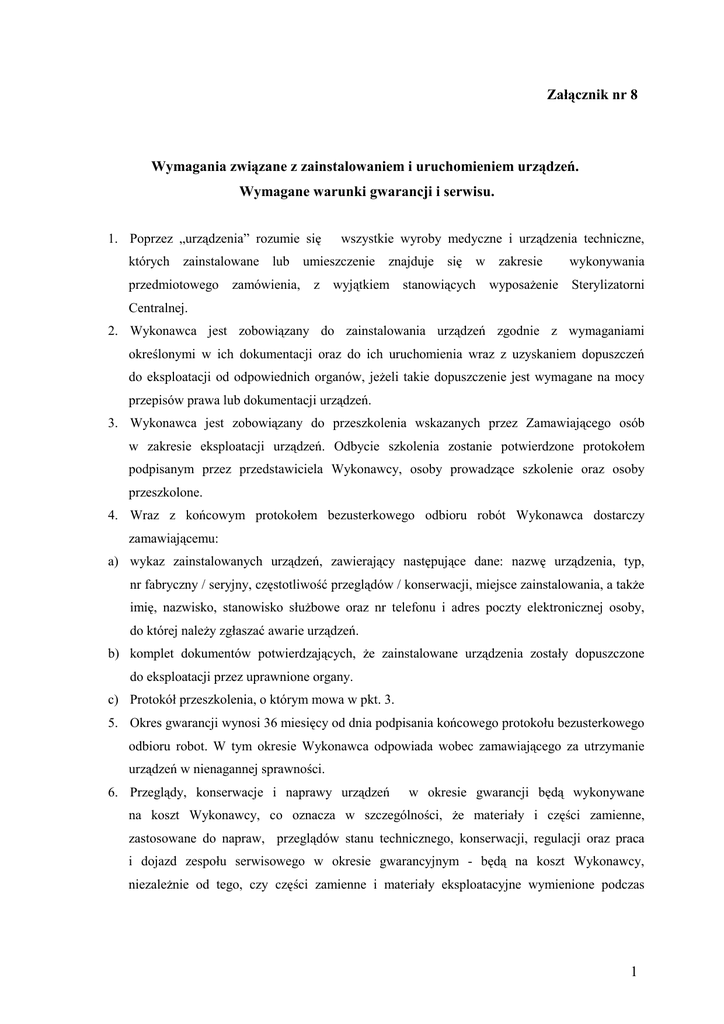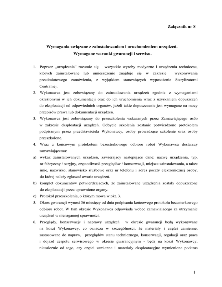 Załącznik nr 8 Wymagania związane z zainstalowaniem i uruchomieniem urządzeń. Wymagane warunki gwarancji i serwisu. 1. Poprzez „urządzenia” rozumie się których zainstalowane lub przedmiotowego zamówienia, wszystkie wyroby medyczne i urządzenia techniczne, umieszczenie znajduje się w zakresie z wyjątkiem stanowiących wykonywania wyposażenie Sterylizatorni Centralnej. 2. Wykonawca jest zobowiązany do zainstalowania urządzeń zgodnie z wymaganiami określonymi w ich dokumentacji oraz do ich uruchomienia wraz z uzyskaniem dopuszczeń do eksploatacji od odpowiednich organów, jeżeli takie dopuszczenie jest wymagane na mocy przepisów prawa lub dokumentacji urządzeń. 3. Wykonawca jest zobowiązany do przeszkolenia wskazanych przez Zamawiającego osób w zakresie eksploatacji urządzeń. Odbycie szkolenia zostanie potwierdzone protokołem podpisanym przez przedstawiciela Wykonawcy, osoby prowadzące szkolenie oraz osoby przeszkolone. 4. Wraz z końcowym protokołem bezusterkowego odbioru robót Wykonawca dostarczy zamawiającemu: a) wykaz zainstalowanych urządzeń, zawierający następujące dane: nazwę urządzenia, typ, nr fabryczny / seryjny, częstotliwość przeglądów / konserwacji, miejsce zainstalowania, a także imię, nazwisko, stanowisko służbowe oraz nr telefonu i adres poczty elektronicznej osoby, do której należy zgłaszać awarie urządzeń. b) komplet dokumentów potwierdzających, że zainstalowane urządzenia zostały dopuszczone do eksploatacji przez uprawnione organy. c) Protokół przeszkolenia, o którym mowa w pkt. 3. 5. Okres gwarancji wynosi 36 miesięcy od dnia podpisania końcowego protokołu bezusterkowego odbioru robot. W tym okresie Wykonawca odpowiada wobec zamawiającego za utrzymanie urządzeń w nienagannej sprawności. 6. Przeglądy, konserwacje i naprawy urządzeń w okresie gwarancji będą wykonywane na koszt Wykonawcy, co oznacza w szczególności, że materiały i części zamienne, zastosowane do napraw, przeglądów stanu technicznego, konserwacji, regulacji oraz praca i dojazd zespołu serwisowego w okresie gwarancyjnym - będą na koszt Wykonawcy, niezależnie od tego, czy części zamienne i materiały eksploatacyjne wymienione podczas 1 napraw / przeglądów / konserwacji / regulacji podlegały tej wymianie na podstawie wymagań określonych w dokumentacji urządzenia, czy z powodu zużycia lub awarii. 7. Zakresy przeglądów / konserwacji / regulacji będą określone w instrukcjach obsługi, dostarczonych wraz z urządzeniami. Terminy, zgodne z określonymi w wykazie, o którym mowa w pkt. 4, będą każdorazowo uzgadniane z upoważnionym przedstawicielem zamawiającego. Ostatni przegląd stanu technicznego w okresie gwarancji, który jest przeglądem obowiązkowym, będzie zrealizowany w terminie (14-7) dni przed zakończeniem okresu gwarancji. 8. Wykonawcą ww. przeglądów i napraw będzie odpowiedni serwis autoryzowany, potwierdzający każdorazowo swoje czynności w dostarczonej wraz z urządzeniami karcie / kartach gwarancyjnych. 9. Gwarancją nie są objęte: uszkodzenia i wady urządzeń będących przedmiotem umowy, wynikłe na skutek: eksploatacji urządzeń przez Zamawiającego niezgodnej z ich przeznaczeniem, niestosowania się przez Zamawiającego do instrukcji obsługi urządzeń, mechanicznego uszkodzenia powstałego z winy Zamawiającego lub osoby trzeciej i wywołanych nimi wad, samowolnych napraw, przeróbek lub zmian konstrukcyjnych (dokonywanych przez Zamawiającego lub inne nieuprawnione osoby) oraz uszkodzenia spowodowane zdarzeniami losowymi, np. pożar, powódź, zalanie. 10. Wymagania dotyczące usuwania awarii: podjęcie czynności przy urządzeniu ma nastąpić nie później, niż w ciągu 24 godzin od zgłoszenia, przy czym zgłoszenia może być telefoniczne i niezwłocznie potwierdzone za pomocą faksu lub przesłane pocztą elektroniczną; wykonanie skutecznej naprawy i przywrócenie możliwości użytkowania urządzenia – nie później, niż w ciągu 72 godzin od zgłoszenia awarii.. 11. Okres gwarancji ulega przedłużeniu o czas, w którym niemożliwe było używanie urządzenia ze względu na jego niesprawność, w szczególności efektem każdej niesprawność dowolnego elementu urządzenia , jest przedłużenie okresu gwarancji dla całego urządzenia. 12. Gwarancja na wymienione części zamienne i / lub podzespoły urządzenia wynosi 24 miesiące od dnia dokonania wymiany. 13. Wykonawca umowy zapewni dostęp do części zamiennych i serwisów autoryzowanych przez co najmniej 10 lat od uruchomienia urządzeń. 2