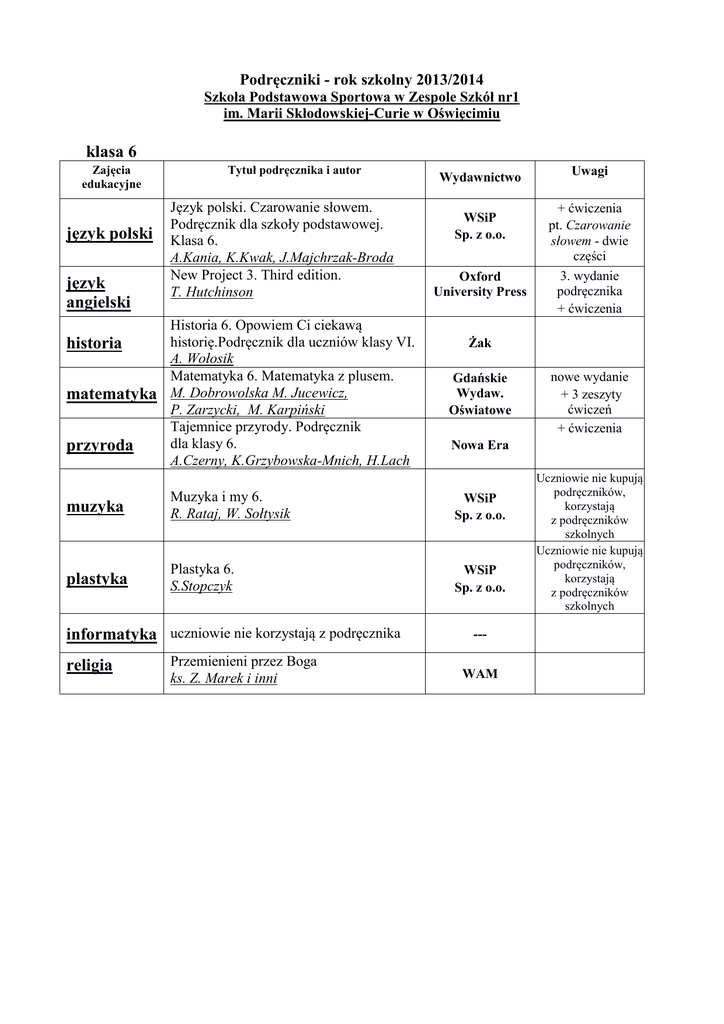 Podręczniki - rok szkolny 2013/2014 Szkoła Podstawowa Sportowa w Zespole Szkół nr1 im. Marii Skłodowskiej-Curie w Oświęcimiu klasa 6 Zajęcia edukacyjne język polski język angielski Tytuł podręcznika i autor Język polski. Czarowanie słowem. Podręcznik dla szkoły podstawowej. Klasa 6. A.Kania, K.Kwak, J.Majchrzak-Broda New Project 3. Third edition. T. Hutchinson Historia 6. Opowiem Ci ciekawą historię.Podręcznik dla uczniów klasy VI. historia A. Wołosik Matematyka 6. Matematyka z plusem. matematyka M. Dobrowolska M. Jucewicz, P. Zarzycki, M. Karpiński Tajemnice przyrody. Podręcznik dla klasy 6. przyroda A.Czerny, K.Grzybowska-Mnich, H.Lach Wydawnictwo WSiP Sp. z o.o. Oxford University Press Gdańskie Wydaw. Oświatowe WSiP Sp. z o.o. plastyka Plastyka 6. S.Stopczyk WSiP Sp. z o.o. Przemienieni przez Boga ks. Z. Marek i inni nowe wydanie + 3 zeszyty ćwiczeń + ćwiczenia Nowa Era Muzyka i my 6. R. Rataj, W. Sołtysik religia + ćwiczenia pt. Czarowanie słowem - dwie części 3. wydanie podręcznika + ćwiczenia Żak muzyka informatyka uczniowie nie korzystają z podręcznika Uwagi --WAM Uczniowie nie kupują podręczników, korzystają z podręczników szkolnych Uczniowie nie kupują podręczników, korzystają z podręczników szkolnych