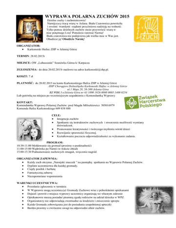 WYPRAWA POLARNA ZUCHÓW 2015 Dzielne zuchy i zuchmistrzowie! Narnijczycy tracą wiarę w Aslana. Biała Czarownica powróciła i swoimi twardymi rządami przyćmiewa nadzieję na wolność. Tylko pomoc dzielnych zuchów może przywrócić wiarę w moc potężnego Lwa! Pomóżcie ratować Narnię! Biała czarownica nie podejrzewa jak wielka moc w Was jest. Obudźcie ją! Obudźcie Narnię! ORGANIZATOR: Karkonoski Hufiec ZHP w Jeleniej Górze TERMIN: 28.02.2015r MIEJSCE: OW „Lubuszanin” Sosnówka Górna k/ Karpacza ZGŁOSZENIA: do dnia 20.02.2015r mailowo na adres [email protected]. KOSZT: 7 zł PŁATNOŚĆ: do 20.02.2015 na konto Karkonoskiego Hufca ZHP w Jeleniej Górze ZHP Chorągiew Dolnośląska Karkonoski Hufiec w Jeleniej Górze ul.1 Maja 28, 58-500 Jelenia Góra BZ WBK I o/Jelenia Góra nr 63 1090 1926 0000 0005 1400 0254 Lub gotówką na miejscu po wcześniejszym uzgodnieniu z Komendantką Wyprawy KONTAKT: Komendantka Wyprawy Polarnej Zuchów: pwd Magda Miliszkiewicz 505016979 Komenda Hufca Karkonoskiego 609 858 888 CELE: Integracja zuchów Spotkanie się instruktorów zuchowych i stworzenie możliwość wymiany doświadczeń. Promowanie kreatywności i twórczego myślenia wśród dzieci Rozwijanie sprawności fizycznej. Kształtowanie poczucia odpowiedzialności za wykonanie zadania. PROGRAM: 10:30-11:00 Meldowanie się gromad (prosimy o punktualność) 11:00-15:00 Wędrówka po Narnii (w trakcie obiad) 15:00-15:30 Podsumowanie zuchowych zmagań, wręczenie nagród. ORGANIZATOR ZAPEWNIA: Każdy zuch otrzyma „Narnijski znaczek ” na pamiątkę spotkania na Wyprawie Polarnej Zuchów. Dyplom uczestnictwa dla każdej gromady. Ciepły posiłek i herbatę Fantastyczną zabawę Niezapomniane wspomnienia WARUNKI UCZESTNICTWA: Przesłanie zgłoszenia w terminie. W Wyprawie mogą uczestniczyć Gromady Zuchowe wraz z pełnoletnimi opiekunami Dojazd i powrót z miejsca wyprawy uczestnicy organizują we własnym zakresie Opiekunowie muszą posiadać pisemną zgodę rodziców na udział dziecka w WPZ Organizatorzy nie odpowiadają ewentualne za kradzieże i zniszczenie sprzętu Każda Gromada zobowiązana jest do posiadania uzupełnionej apteczki Bardzo prosimy o zwrócenie uwagi na odpowiedni ubiór zuchów.