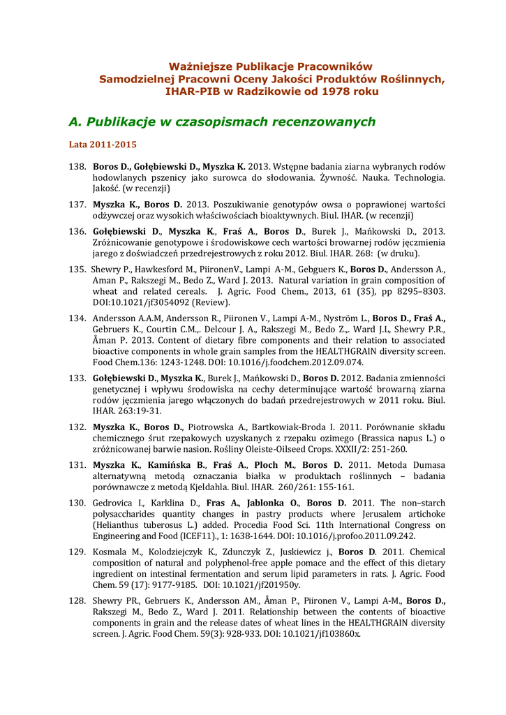 Ważniejsze Publikacje Pracowników Samodzielnej Pracowni Oceny Jakości Produktów Roślinnych, IHAR-PIB w Radzikowie od 1978 roku A. Publikacje w czasopismach recenzowanych Lata 2011-2015 138. Boros D., Gołębiewski D., Myszka K. 2013. Wstępne badania ziarna wybranych rodów hodowlanych pszenicy jako surowca do słodowania. Żywność. Nauka. Technologia. Jakość. (w recenzji) 137. Myszka K., Boros D. 2013. Poszukiwanie genotypów owsa o poprawionej wartości odżywczej oraz wysokich właściwościach bioaktywnych. Biul. IHAR. (w recenzji) 136. Gołębiewski D., Myszka K., Fraś A., Boros D., Burek J., Mańkowski D., 2013. Zróżnicowanie genotypowe i środowiskowe cech wartości browarnej rodów jęczmienia jarego z doświadczeń przedrejestrowych z roku 2012. Biul. IHAR. 268: (w druku). 135. Shewry P., Hawkesford M., PiironenV., Lampi A-M., Gebguers K., Boros D., Andersson A., Aman P., Rakszegi M., Bedo Z., Ward J. 2013. Natural variation in grain composition of wheat and related cereals. J. Agric. Food Chem., 2013, 61 (35), pp 8295–8303. DOI:10.1021/jf3054092 (Review). 134. Andersson A.A.M, Andersson R., Piironen V., Lampi A-M., Nyström L., Boros D., Fraś A., Gebruers K., Courtin C.M.,. Delcour J. A., Rakszegi M., Bedo Z.,. Ward J.L, Shewry P.R., Åman P. 2013. Content of dietary fibre components and their relation to associated bioactive components in whole grain samples from the HEALTHGRAIN diversity screen. Food Chem.136: 1243-1248. DOI: 10.1016/j.foodchem.2012.09.074. 133. Gołębiewski D., Myszka K., Burek J., Mańkowski D., Boros D. 2012. Badania zmienności genetycznej i wpływu środowiska na cechy determinujące wartość browarną ziarna rodów jęczmienia jarego włączonych do badań przedrejestrowych w 2011 roku. Biul. IHAR. 263:19-31. 132. Myszka K., Boros D., Piotrowska A., Bartkowiak-Broda I. 2011. Porównanie składu chemicznego śrut rzepakowych uzyskanych z rzepaku ozimego (Brassica napus L.) o zróżnicowanej barwie nasion. Rośliny Oleiste-Oilseed Crops. XXXII/2: 251-260. 131. Myszka K., Kamińska B., Fraś A., Ploch M., Boros D. 2011. Metoda Dumasa alternatywną metodą oznaczania białka w produktach roślinnych – badania porównawcze z metodą Kjeldahla. Biul. IHAR. 260/261: 155-161. 130. Gedrovica I., Karklina D., Fras A., Jablonka O., Boros D. 2011. The non–starch polysaccharides quantity changes in pastry products where Jerusalem artichoke (Helianthus tuberosus L.) added. Procedia Food Sci. 11th International Congress on Engineering and Food (ICEF11)., 1: 1638-1644. DOI: 10.1016/j.profoo.2011.09.242. 129. Kosmala M., Kolodziejczyk K., Zdunczyk Z., Juskiewicz j., Boros D. 2011. Chemical composition of natural and polyphenol-free apple pomace and the effect of this dietary ingredient on intestinal fermentation and serum lipid parameters in rats. J. Agric. Food Chem. 59 (17): 9177-9185. DOI: 10.1021/jf201950y. 128. Shewry PR., Gebruers K., Andersson AM., Åman P., Piironen V., Lampi A-M., Boros D., Rakszegi M., Bedo Z., Ward J. 2011. Relationship between the contents of bioactive components in grain and the release dates of wheat lines in the HEALTHGRAIN diversity screen. J. Agric. Food Chem. 59(3): 928-933. DOI: 10.1021/jf103860x. 127. Quaraishi U.M., Murat F., Abrouk M., Pont C., Confolent C., Oury F.X., Ward J., Boros D., Gebruers K., Delcour J., Courtin C.M, Bedo Z., Saulnier L., Guillon F., Balzergue S., Shewry P.R., Feuillet C., Charmet G., Salse J. 2011. Combined meta-genomics analyses unravel candidate genes for the grain dietary fiber content in bread wheat (Triticum aestivum L Functional & Integrative Genomics. 11: 71-83. DOI 10.1007/s10142-010-0183-2. Lata 2006-2010 126. Boros D., Ploch M., Gruszecka D. 2010. Possibility of utilization of two Aegilops sp. to enhance nutritive value of triticale. J. Anim. Feed Sci. 19: 628-637. 125. Shewry PR., Piironen V., Lampi A-M., Edelmann M., Kariluoto S., Nurmi T., FernandezOrozco R., Andersson AM., Åman P., Fraś A., Boros D., Gebruers K., Dornez E., Courtin CM., Delcour JA., Ravel C., Charmet G., Rakszegi M., Bedo Z., Ward J. 2010. Effects of genotype and environment on the content and composition of phytochemicals and dietary fiber components in rye in the HEALTHGRAIN diversity screen. J. Agric. Food Chem. 17: 93729383. DOI: 10.1021/jf100053d. 124. Gebruers K., Dornez E, Bedő Z., Rakszegi M., Fraś A., Boros D., Courtin CM., Delcour JA. 2010. Environment and genotype effects on the content of dietary fiber and its components in wheat in the HEALTHGRAIN diversity screen. J. Agric. Food Chem. 58: 9353-9361. DOI: 10.1021/jf100447g. 123. Shewry PR., Piironen V., Lampi A-M., Edelmann M., Kariluoto S., Nurmi T., FernandezOrozco R., Ravel C., Charmet G., Andersson AM., Åman P., Boros D., Gebruers K., Dornez E., Courtin CM., Delcour JA., Rakszegi M., Bedo Z., Ward J. 2010. The HEALTHGRAIN wheat diversity screen: effects of genotype and environment on phytochemicals and dietary fiber components. J. Agric. Food Chem. 17: 9291-9298. DOI: 10.1021/jf100039b. 122. Cyran M.R. 2010. Structural characterization of feruloylated arabinoxylans and xylans released from water-unextractable cell walls of rye outer layers upon treatment with lichenase and cellulose. Carbohydrate Research. 345: 899-907. 121. Dynkowska W., Boros D. 2009. Czynniki warunkujące przydatność ziarna różnych zbóż do produkcji energii odnawialnej - przegląd literatury. Biul. IHAR. 251: 67-81. 120. Shewry R., Li Li, Piironen V., Lampi A-M., Nystrom L., Li Li, Rakszegi M., Fraś A., Boros D., Gebruers K., Courtin C.M., Delcour J.A., Andersson A.A.M, Dimberg L., Bedo Z., Ward J.L. 2008. Phytochemical and Fibre Components in Oat Varieties in the HEALTHGRAIN diversity screen. J. Agric. Food Chem. 56: 9777-9784. 119. Andersson A.A.M., Lampi A-M., Nyström L., Piironen V., Li Li., Ward J., Gebruers K., Courtin C.M., Delcour J.A., Boros D., Fraś A., Dynkowska W., Rakszegi M., Bedo Z., Shewry P.R., Åman P. 2008. Phytochemical and Fibre Compo