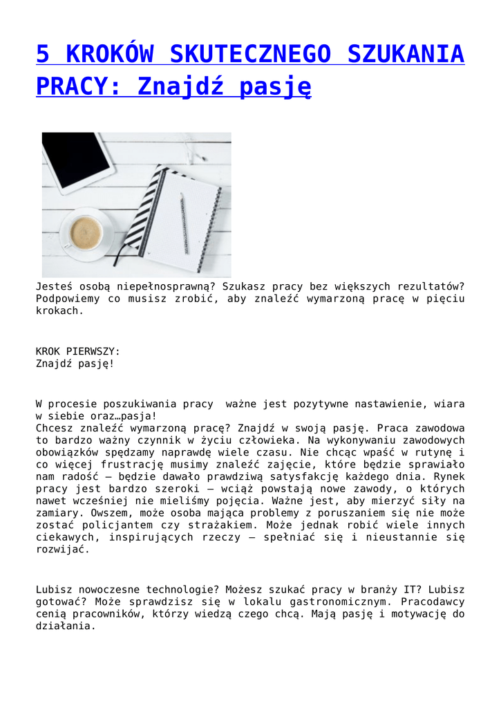 5 KROKÓW SKUTECZNEGO SZUKANIA PRACY: Znajdź pasję Jesteś osobą niepełnosprawną? Szukasz pracy bez większych rezultatów? Podpowiemy co musisz zrobić, aby znaleźć wymarzoną pracę w pięciu krokach. KROK PIERWSZY: Znajdź pasję! W procesie poszukiwania pracy ważne jest pozytywne nastawienie, wiara w siebie oraz…pasja! Chcesz znaleźć wymarzoną pracę? Znajdź w swoją pasję. Praca zawodowa to bardzo ważny czynnik w życiu człowieka. Na wykonywaniu zawodowych obowiązków spędzamy naprawdę wiele czasu. Nie chcąc wpaść w rutynę i co więcej frustrację musimy znaleźć zajęcie, które będzie sprawiało nam radość – będzie dawało prawdziwą satysfakcję każdego dnia. Rynek pracy jest bardzo szeroki – wciąż powstają nowe zawody, o których nawet wcześniej nie mieliśmy pojęcia. Ważne jest, aby mierzyć siły na zamiary. Owszem, może osoba mająca problemy z poruszaniem się nie może zostać policjantem czy strażakiem. Może jednak robić wiele innych ciekawych, inspirujących rzeczy – spełniać się i nieustannie się rozwijać. Lubisz nowoczesne technologie? Możesz szukać pracy w branży IT? Lubisz gotować? Może sprawdzisz się w lokalu gastronomicznym. Pracodawcy cenią pracowników, którzy wiedzą czego chcą. Mają pasję i motywację do działania. Zakład pracy chronionej charakterystyka - Jeszcze jakiś czas temu osoby niepełnosprawne mogły pracować tylko w specjalnych zakładach pracy chronionej. Dzisiaj sytuacja ta uległa diametralnej zmianie – otwarty rynek pracy jest bardzo otwarty na zatrudnianie osób z orzeczeniem o niepełnosprawności. Czym się charakteryzują zakłady pracy chronionej? Status zakładu pracy chronionej wydaje wojewoda. Zasady funkcjonowania zakładów pracy chronionej określa ustawa o rehabilitacji zawodowej i społecznej oraz zatrudnianiu osób niepełnosprawnych z dnia 27 sierpnia 1997 r. Przedsiębiorca, który stara się o status zakładu pracy chronionej musi spełnić następujące wymogi: 1. Musi działać na rynku minimum 12 miesięcy 2. Musi zatrudniać nie mniej niż 25 pracowników w przeliczeniu pełne etaty 3. Powinien przez okres co najmniej 6 miesięcy osiągać odpowiednie wskaźniki zatrudnienia osób niepełnosprawnych: co najmniej 50 procent – w tym co najmniej 20 procent ogółu zatrudnionych stanowią osoby zaliczone do znacznego lub umiarkowanego stopnia niepełnosprawności albo co najmniej 30 procent osób niewidomych lub psychicznie chorych, albo osób upośledzonych umysłowo zaliczonych do znacznego lub umiarkowanego stopnia niepełnosprawności obiekty i pomieszczenia użytkowane przez zakład powinny odpowiadać przepisom i zasadom bhp, powinny też uwzględniać potrzeby osób niepełnosprawnych w zakresie przystosowania stanowisk pracy, pomieszczeń higienicznosanitarnych i ciągów komunikacyjnych oraz spełniać wymagania dostępności do nich (kontroluje i potwierdza Państwowa Inspekcja Pracy) Poza tym pracodawca koniecznie musi zapewnić swoim pracownikom stały dostęp do profesjonalnej opieki medycznej oraz specjalistycznej rehabilitacji. W osobnym artykule zostaną omówione przywileje zakładów pracy chronionej. Zachęcamy osoby niepełnosprawne do szukania zatrudnienia – zarówno w zakładach pracy chronionej, jak na otwartym rynku pracy. WARTO MIEĆ MARZENIA… - wywiad z Ewą Sosnowską Przedstawiamy cykl wywiadów z osobami niepełnosprawnymi, które są inspiracją dla innych. Warto mieć marzenia, spełniać się zawodowo, realizować swoje pasje. Choroba nie powinna być przeszkodą w samorealizacji.Na “pierwszy ogień” przedstawiamy wywiad z Ewą Sosnowską – mieszkanką Gdańska. Pod koniec roku światło dzienne ujrzała powieść tej autorki”Czekoladowe rendez-vous". Zachęcamy do lektury wywiadu! (wywiad miał miejsce przed premierą książki!) PF: Jak zaczęła się Twoja przygoda z pisaniem? Nie umiem opowiadać o sobie, lepiej idzie mi tworzenie historii bazujących na własnych przeżyciach i zasłyszanych rozmowach. Mimo wszystko spróbuję… Byłam najmłodszym dzieckiem moich rodziców. Moje rodzeństwo, starsze ode mnie o ponad dziesięć lat, nie umiało znaleźć ze mną wspólnego języka. To, plus moja choroba (padaczka), z którą żyję od urodzenia, spowodowało, że stworzyłam sobie swój własny świat w wyobraźni. Dodatkowego „kopa” do tworzenia dał mi film „Niekończąca się opowieść”… obiecałam sobie wtedy, że nigdy nie przestanę marzyć. Obietnicy, jak dotąd, dotrzymuję… Pisałam, a właściwie tworzyłam „od zawsze”, pamiętam siebie jako malutką dziewczynkę, która wymyślała sobie bajki na dobranoc. Mamrotałam to na tyle głośno, że nawet domownicy protestowali… W późniejszych latach, wierszami i opowiadaniami, poprawiałam sobie oceny w szkole, jednak większość moich ówczesnych dzieł trafiała do tzw. szuflady. Dopiero kilka lat temu, podpuszczona przez znajomych, postanowiłam te moje bazgroły uporządkować, ujednolicić bohaterów i nadać poszczególnym opowiadaniom jakąś logiczną ciągłość. Okazało się, że wychodzi mi książka.Po analizie wszystkich za i przeciw, postanowiłam rozejrzeć się za jakimś wydawnictwem. Ku mojemu zaskoczeniu, pozytywną odpowiedź dostałam już od pierwszego wydawnictwa.Zaczęłam zbierać fundusze na tzw. wkład autorski i już niewiele mi brakuje do zebrania całej, wymaganej kwoty.W zbieraniu pomagają mi nie tylko osoby, które znam osobiście. Duże wsparcie dostaję od osób zupełnie mi nie znanych, poznanych przez Internet. Wszystkim wspierającym mnie serdecznie dziękuję. ☺ PF: Napisałaś książkę. Premiera już niebawem. Czy możesz w skrócie przedstawić fabułę? Skąd czerpałaś inspiracje? Trudno to powiedzieć. Jest to istna mieszanka historii wyciągniętych z szuflady, moich snów i rozmów zarówno moich jak i zasłyszanych przypadkowo. Narratorką i jednocześnie główną bohaterką jest Maj