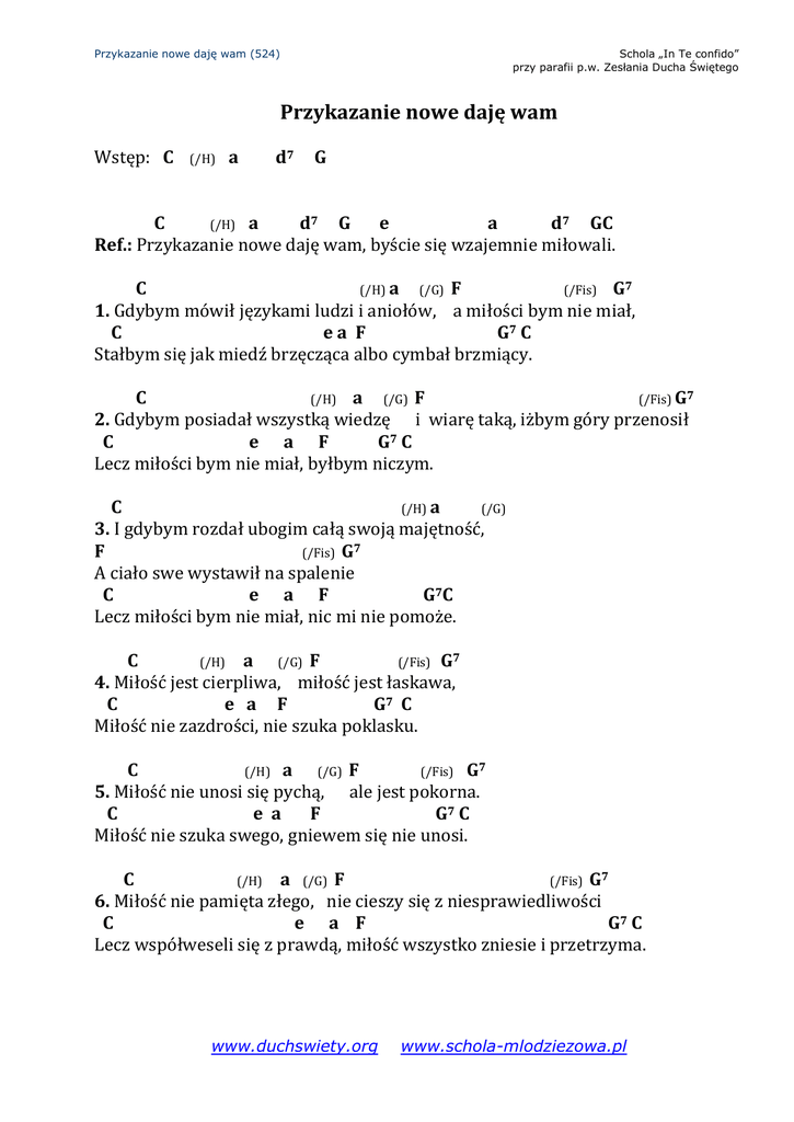 Przykazanie nowe daję wam (524) Schola „In Te confido” przy parafii p.w. Zesłania Ducha Świętego Przykazanie nowe daję wam Wstęp: C (/H) a d7 G C (/H) a d7 G e a d7 GC Ref.: Przykazanie nowe daję wam, byście się wzajemnie miłowali. C (/H) a (/G) F (/Fis) G7 1. Gdybym mówił językami ludzi i aniołów, a miłości bym nie miał, C ea F G7 C Stałbym się jak miedź brzęcząca albo cymbał brzmiący. C (/H) a (/G) F (/Fis) G7 2. Gdybym posiadał wszystką wiedzę i wiarę taką, iżbym góry przenosił C e a F G7 C Lecz miłości bym nie miał, byłbym niczym. C (/H) a (/G) 3. I gdybym rozdał ubogim całą swoją majętność, F (/Fis) G7 A ciało swe wystawił na spalenie C e a F G7C Lecz miłości bym nie miał, nic mi nie pomoże. C (/H) a (/G) F (/Fis) G7 4. Miłość jest cierpliwa, miłość jest łaskawa, C e a F G7 C Miłość nie zazdrości, nie szuka poklasku. C (/H) a (/G) F (/Fis) G7 5. Miłość nie unosi się pychą, ale jest pokorna. C e a F G7 C Miłość nie szuka swego, gniewem się nie unosi. C (/H) a (/G) F (/Fis) G7 6. Miłość nie pamięta złego, nie cieszy się z niesprawiedliwości C e a F G7 C Lecz współweseli się z prawdą, miłość wszystko zniesie i przetrzyma. www.duchswiety.org www.schola-mlodziezowa.pl Przykazanie nowe daję wam (524) Schola „In Te confido” przy parafii p.w. Zesłania Ducha Świętego Przykazanie nowe daję wam Wstęp: D (/Cis) h e7 A D (/Cis) h e7 A fis h e7 AD Ref.: Przykazanie nowe daję wam, byście się wzajemnie miłowali. D (/Cis) h (/A) G (/Gis) A7 1. Gdybym mówił językami ludzi i aniołów, a miłości bym nie miał, D fis h G A7D Stałbym się jak miedź brzęcząca albo cymbał brzmiący. D (/Cis) h (/A) G (/Gis) A7 2. Gdybym posiadał wszystką wiedzę i wiarę taką, iżbym góry przenosił D fis h G A7 D Lecz miłości bym nie miał, byłbym niczym. D (/Cis) h (/A) 3. I gdybym rozdał ubogim całą swoją majętność, G (/Gis) A7 A ciało swe wystawił na spalenie D fis h G A7D Lecz miłości bym nie miał, nic mi nie pomoże. D (/Cis) h (/A) G (/Gis) A7 4. Miłość jest cierpliwa, miłość jest łaskawa, D fis h G A7 D Miłość nie zazdrości, nie szuka poklasku. D (/Cis) h (/A) G (/Gis) A7 5. Miłość nie unosi się pychą, ale jest pokorna. D fis h G A7D Miłość nie szuka swego, gniewem się nie unosi. D (/Cis) h (/A) G (/Gis) A7 6. Miłość nie pamięta złego, nie cieszy się z niesprawiedliwości D fis h G A7 D Lecz współweseli się z prawdą, miłość wszystko zniesie i przetrzyma. www.duchswiety.org www.schola-mlodziezowa.pl
