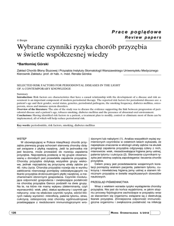 Prace poglądowe Review papers © Borgis Wybrane czynniki ryzyka chorób przyzębia w świetle współczesnej wiedzy *Bartłomiej Górski Zakład Chorób Błony Śluzowej i Przyzębia Instytutu Stomatologii Warszawskiego Uniwersytetu Medycznego Kierownik Zakładu: prof. dr hab. n. med. Renata Górska Selected risk factors for periodontal diseases in the light of a contemporary knowledge Summary Introduction: Risk factors are characteristics that have a casual relationship with the development of a disease and risk assessment is an important component of modern periodontal therapy. The reported risk factors for periodontal diseases are: a patient’s age and their gender, social status, genetics, periodontal pathogens, the smoking frequency, diabetes mellitus, osteoporosis, stress and immune system disorders. Overview of the literature: The aim of the study was to discuss the evidence supporting the link between progression of periodontal disease and a patient’s age, tobacco smoking, diabetes mellitus and the presence of abnormal oral environment. Conclusions: Having identified risk factors in a patient, a treatment plan to modify, control or eliminate most of them can be implemented, all of which will help reduce periodontal risk. Key words: periodontitis, risk factors, smoking, diabetes mellitus Wstęp W obowiązującej w Polsce klasyfikacji chorób przyzębia pierwszą grupę schorzeń stanowią choroby dziąseł związane z płytką nazębną. Jeśli ta jednostka nie jest leczona, może prowadzić do rozwoju zapalenia przyzębia. Najczęstszą postacią w tej grupie obserwowaną u dorosłych jest przewlekłe zapalenie przyzębia. Choroby przyzębia dotykają wszystkie grupy wiekowe, jednak najczęściej są przyczyną utraty zębów po 40. roku życia. Choroba przyzębia rozwija się w wyniku zakłócenia równowagi pomiędzy oddziaływującymi na tkanki przyzębia drobnoustrojami płytki nazębnej, a mechanizmami obronnymi gospodarza. Czynniki modulujące odporność gospodarza i zwiększające podatność na chorobę przyzębia Genco podzielił na dwie grupy. Na te, na które nie mamy wpływu (determinanty, czyli wyznaczniki): wiek, płeć, status społeczny i czynnik genetyczny; oraz na właściwe czynniki ryzyka, wśród których należy wyróżnić: mikroflorę, palenie tytoniu, stres, cukrzycę, osteoporozę oraz choroby ogólnoustrojowe przebiegające z niedoborami immunologicznymi wro- 126 dzonymi lub nabytymi (1). Analiza wszystkich wyżej wymienionych czynników w ostatnich latach wykazała, że największe znaczenie w etiologii utraty zębów na skutek progresji zapalenia przyzębia odgrywają cztery z nich, mianowicie: wiek, niezadowalająca higiena jamy ustnej, palenie tytoniu i cukrzyca (2). Sterowanie czynnikami ryzyka jest istotną częścią zapobiegania i leczenia chorób przyzębia. Celem pracy jest przedstawienie wzajemnych korelacji pomiędzy wiekiem pacjenta, paleniem tytoniu, cukrzycą i niewłaściwą higieną jamy ustnej a stanem klinicznym przyzębia w świetle współczesnych dowodów naukowych. Przegląd piśmiennictwa Wraz z wiekiem wzrasta ryzyko wystąpienia choroby przyzębia. Nie jest do końca wyjaśnione, w jakim stopniu procesy fizjologiczne zachodzące w przyzębiu wraz ze starzeniem się organizmu związane są z destrukcją tkanek przyzębia. Zmniejszona odporność immunologiczna organizmu i zwiększona podatność na infekcję N OWA S TOMATOLOGIA 3/2012 Wybrane czynniki ryzyka chorób przyzębia w świetle współczesnej wiedzy wraz z akumulacją płytki nazębnej mogą nasilać procesy destrukcyjne (3). W zależności od szerokości geograficznej obserwuje się pewne zróżnicowanie występowania chorób przyzębia, biorąc pod uwagę całą populację ludzką ocenia się tę częstotliwość na od 20 do 50% (4). Z obserwacji prowadzonych w Stanach Zjednoczonych w latach 1999-2004 wynika, że zapalenie przyzębia występuje u 20% populacji dorosłych pacjentów, a częstotliwość występowania tej choroby w stadium zaawansowanym (CPITN 4) wynosi od 3 do 17% (5). Wyniki te potwierdzają przeprowadzone w ostatnim czasie (2010-2011) badania epidemiologiczne na terenie 6 miast wojewódzkich w ośrodkach akademickich w Polsce (Białystok, Kielce, Lublin, Szczecin, Warszawa, Wrocław), które objęły 1238 losowo wybranych dorosłych Polaków w wieku 35-44 lata. W badanej grupie zaobserwowano bardzo niski odsetek osób zdrowych (1,7%) oraz bardzo wysoki odsetek osób z zaawansowaną chorobą przyzębia wymagających leczenia specjalistycznego (17,5%) (6). Badania populacji powyżej 70. roku życia wykazują, że przewlekłe średnio zaawansowane zapalenie przyzębia dotyczy 86%, a wśród wymienionych 86% więcej niż jedna czwarta pacjentów straciła wszystkie zęby z powodu progresji choroby przyzębia. Po 35. roku życia schorzenia przyzębia są najczęstszą przyczyną ekstrakcji zębów (7). Palenie tytoniu jest najczęstszym czynnikiem ryzyka występowania chorób przyzębia. Brothwell podaje, że może być to najbardziej istotny czynnik etiologiczny aż u 40% pacjentów z periodontitis (8). Palacze stanowią 31% pacjentów z brakami ilościowymi uzębienia (2). W ciągu ostatnich lat wiele badań wykazało dodatnią korelację pomiędzy liczbą wypalanych papierosów, a stopniem zaawansowania choroby przyzębia (9). Higiena jamy ustnej palaczy jest gorsza w porównaniu do osób nie używających tytoniu, a odkładanie się złogów nazębnych jest bardziej nasilone. Może być to związane z zaburzeniami w wydzielaniu śliny, które nasilają się pod wpływem składników dymu tytoniowego. Zachowania prozdrowotne palaczy (częstotliwość mycia zębów, używanie dodatkowych akcesoriów do higieny jamy ustnej) są również niezadowalające w porównaniu z grupą kontrolną (10-12). Na poziomie klinicznym, palenie tytoniu hamuje odpowiedź zapalną dziąsła na obecność płytki nazębnej, co powoduje zmniejszenie krwawienia (13, 14).