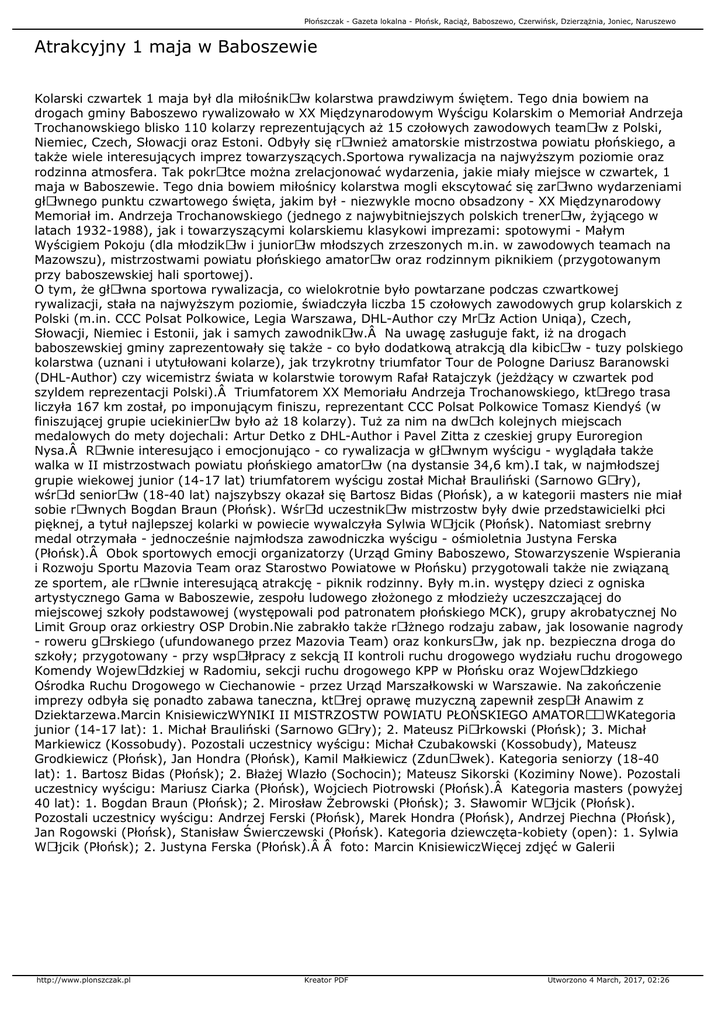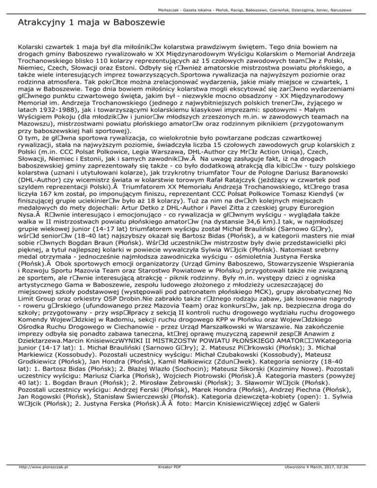 Płońszczak - Gazeta lokalna - Płońsk, Raciąż, Baboszewo, Czerwińsk, Dzierzążnia, Joniec, Naruszewo Atrakcyjny 1 maja w Baboszewie Kolarski czwartek 1 maja był dla miłośnikÃłw kolarstwa prawdziwym świętem. Tego dnia bowiem na drogach gminy Baboszewo rywalizowało w XX Międzynarodowym Wyścigu Kolarskim o Memoriał Andrzeja Trochanowskiego blisko 110 kolarzy reprezentujących aż 15 czołowych zawodowych teamÃłw z Polski, Niemiec, Czech, Słowacji oraz Estoni. Odbyły się rÃłwnież amatorskie mistrzostwa powiatu płońskiego, a także wiele interesujących imprez towarzyszących.Sportowa rywalizacja na najwyższym poziomie oraz rodzinna atmosfera. Tak pokrÃłtce można zrelacjonować wydarzenia, jakie miały miejsce w czwartek, 1 maja w Baboszewie. Tego dnia bowiem miłośnicy kolarstwa mogli ekscytować się zarÃłwno wydarzeniami głÃłwnego punktu czwartowego święta, jakim był - niezwykle mocno obsadzony - XX Międzynarodowy Memoriał im. Andrzeja Trochanowskiego (jednego z najwybitniejszych polskich trenerÃłw, żyjącego w latach 1932-1988), jak i towarzyszącymi kolarskiemu klasykowi imprezami: spotowymi - Małym Wyścigiem Pokoju (dla młodzikÃłw i juniorÃłw młodszych zrzeszonych m.in. w zawodowych teamach na Mazowszu), mistrzostwami powiatu płońskiego amatorÃłw oraz rodzinnym piknikiem (przygotowanym przy baboszewskiej hali sportowej). O tym, że głÃłwna sportowa rywalizacja, co wielokrotnie było powtarzane podczas czwartkowej rywalizacji, stała na najwyższym poziomie, świadczyła liczba 15 czołowych zawodowych grup kolarskich z Polski (m.in. CCC Polsat Polkowice, Legia Warszawa, DHL-Author czy MrÃłz Action Uniqa), Czech, Słowacji, Niemiec i Estonii, jak i samych zawodnikÃłw. Na uwagę zasługuje fakt, iż na drogach baboszewskiej gminy zaprezentowały się także - co było dodatkową atrakcją dla kibicÃłw - tuzy polskiego kolarstwa (uznani i utytułowani kolarze), jak trzykrotny triumfator Tour de Pologne Dariusz Baranowski (DHL-Author) czy wicemistrz świata w kolarstwie torowym Rafał Ratajczyk (jeżdżący w czwartek pod szyldem reprezentacji Polski). Triumfatorem XX Memoriału Andrzeja Trochanowskiego, ktÃłrego trasa liczyła 167 km został, po imponującym finiszu, reprezentant CCC Polsat Polkowice Tomasz Kiendyś (w finiszującej grupie uciekinierÃłw było aż 18 kolarzy). Tuż za nim na dwÃłch kolejnych miejscach medalowych do mety dojechali: Artur Detko z DHL-Author i Pavel Zitta z czeskiej grupy Euroregion Nysa. RÃłwnie interesująco i emocjonująco - co rywalizacja w głÃłwnym wyścigu - wyglądała także walka w II mistrzostwach powiatu płońskiego amatorÃłw (na dystansie 34,6 km).I tak, w najmłodszej grupie wiekowej junior (14-17 lat) triumfatorem wyścigu został Michał Brauliński (Sarnowo GÃłry), wśrÃłd seniorÃłw (18-40 lat) najszybszy okazał się Bartosz Bidas (Płońsk), a w kategorii masters nie miał sobie rÃłwnych Bogdan Braun (Płońsk). WśrÃłd uczestnikÃłw mistrzostw były dwie przedstawicielki płci pięknej, a tytuł najlepszej kolarki w powiecie wywalczyła Sylwia WÃłjcik (Płońsk). Natomiast srebrny medal otrzymała - jednocześnie najmłodsza zawodniczka wyścigu - ośmioletnia Justyna Ferska (Płońsk). Obok sportowych emocji organizatorzy (Urząd Gminy Baboszewo, Stowarzyszenie Wspierania i Rozwoju Sportu Mazovia Team oraz Starostwo Powiatowe w Płońsku) przygotowali także nie związaną ze sportem, ale rÃłwnie interesującą atrakcję - piknik rodzinny. Były m.in. występy dzieci z ogniska artystycznego Gama w Baboszewie, zespołu ludowego złożonego z młodzieży uczeszczającej do miejscowej szkoły podstawowej (występowali pod patronatem płońskiego MCK), grupy akrobatycznej No Limit Group oraz orkiestry OSP Drobin.Nie zabrakło także rÃłżnego rodzaju zabaw, jak losowanie nagrody - roweru gÃłrskiego (ufundowanego przez Mazovia Team) oraz konkursÃłw, jak np. bezpieczna droga do szkoły; przygotowany - przy wspÃłłpracy z sekcją II kontroli ruchu drogowego wydziału ruchu drogowego Komendy WojewÃłdzkiej w Radomiu, sekcji ruchu drogowego KPP w Płońsku oraz WojewÃłdzkiego Ośrodka Ruchu Drogowego w Ciechanowie - przez Urząd Marszałkowski w Warszawie. Na zakończenie imprezy odbyła się ponadto zabawa taneczna, ktÃłrej oprawę muzyczną zapewnił zespÃłł Anawim z Dziektarzewa.Marcin KnisiewiczWYNIKI II MISTRZOSTW POWIATU PŁOŃSKIEGO AMATORÓWKategoria junior (14-17 lat): 1. Michał Brauliński (Sarnowo GÃłry); 2. Mateusz PiÃłrkowski (Płońsk); 3. Michał Markiewicz (Kossobudy). Pozostali uczestnicy wyścigu: Michał Czubakowski (Kossobudy), Mateusz Grodkiewicz (Płońsk), Jan Hondra (Płońsk), Kamil Małkiewicz (ZdunÃłwek). Kategoria seniorzy (18-40 lat): 1. Bartosz Bidas (Płońsk); 2. Błażej Wlazło (Sochocin); Mateusz Sikorski (Koziminy Nowe). Pozostali uczestnicy wyścigu: Mariusz Ciarka (Płońsk), Wojciech Piotrowski (Płońsk). Kategoria masters (powyżej 40 lat): 1. Bogdan Braun (Płońsk); 2. Mirosław Żebrowski (Płońsk); 3. Sławomir WÃłjcik (Płońsk). Pozostali uczestnicy wyścigu: Andrzej Ferski (Płońsk), Marek Hondra (Płońsk), Andrzej Piechna (Płońsk), Jan Rogowski (Płońsk), Stanisław Świerczewski (Płońsk). Kategoria dziewczęta-kobiety (open): 1. Sylwia WÃłjcik (Płońsk); 2. Justyna Ferska (Płońsk).  foto: Marcin KnisiewiczWięcej zdjęć w Galerii http://www.plonszczak.pl Kreator PDF Utworzono 4 March, 2017, 02:26