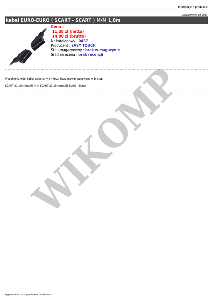 Informacje o produkcie Utworzono 04-03-2017 kabel EURO-EURO ( SCART - SCART ) M/M 1,8m Cena : 11,38 zł (netto) 14,00 zł (brutto) Nr katalogowy : 0437 Producent : EASY TOUCH Stan magazynowy : brak w magazynie Średnia ocena : brak recenzji W IK O M SCART 21-pin (męski) <-> SCART 21-pin (męski) EURO - EURO P Wysokiej jakości kabel wykonany z miedzi beztlenowej, pakowany w blister. Wygenerowano w programie www.oscGold.com