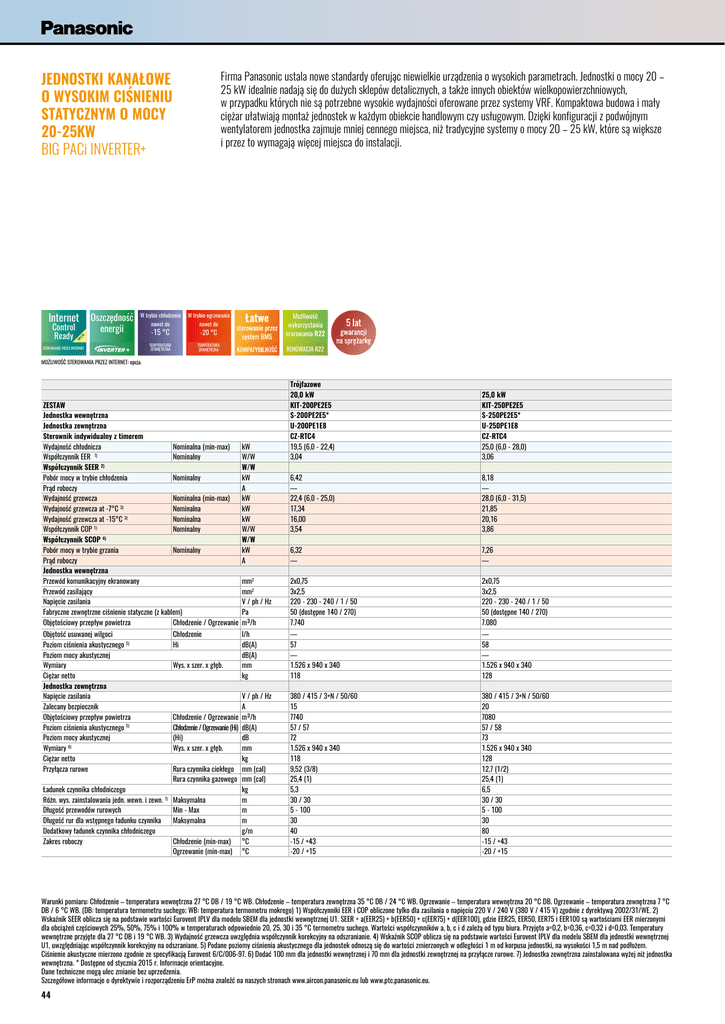 JEDNOSTKI KANAŁOWE O WYSOKIM CIŚNIENIU STATYCZNYM O MOCY 20-25KW BIG PACi INVERTER+ Internet Oszczędność energii W trybie chłodzenia W trybie ogrzewania nawet do nawet do -20 °C Możliwość wykorzystania orurowania R22 TEMPERATURA ZEWNĘTRZNA TEMPERATURA ZEWNĘTRZNA RENOWACJA R22 OP CJ A Control Ready Firma Panasonic ustala nowe standardy oferując niewielkie urządzenia o wysokich parametrach. Jednostki o mocy 20 – 25 kW idealnie nadają się do dużych sklepów detalicznych, a także innych obiektów wielkopowierzchniowych, w przypadku których nie są potrzebne wysokie wydajności oferowane przez systemy VRF. Kompaktowa budowa i mały ciężar ułatwiają montaż jednostek w każdym obiekcie handlowym czy usługowym. Dzięki konfiguracji z podwójnym wentylatorem jednostka zajmuje mniej cennego miejsca, niż tradycyjne systemy o mocy 20 – 25 kW, które są większe i przez to wymagają więcej miejsca do instalacji. STEROWANIE PRZEZ INTERNET -15 °C MOŻLIWOŚĆ STEROWANIA PRZEZ INTERNET: opcja. ZESTAW Jednostka wewnętrzna Jednostka zewnętrzna Sterownik indywidualny z timerem Wydajność chłodnicza Nominalna (min-max) Współczynnik EER 1) Nominalny Współczynnik SEER 2) Pobór mocy w trybie chłodzenia Nominalny Prąd roboczy Wydajność grzewcza Nominalna (min-max) Wydajność grzewcza at -7°C 3) Nominalna 3) Wydajność grzewcza at -15°C Nominalna 1) Współczynnik COP Nominalny Współczynnik SCOP 4) Pobór mocy w trybie grzania Nominalny Prąd roboczy Jednostka wewnętrzna Przewód komunikacyjny ekranowany Przewód zasilający Napięcie zasilania Fabryczne zewnętrzne ciśnienie statyczne (z kablem) Objętościowy przepływ powietrza Chłodzenie / Ogrzewanie Objętość usuwanej wilgoci Poziom ciśnienia akustycznego 5) Poziom mocy akustycznej Wymiary Ciężar netto Jednostka zewnętrzna Napięcie zasilania Zalecany bezpiecznik Objętościowy przepływ powietrza Poziom ciśnienia akustycznego 5) Poziom mocy akustycznej Wymiary 6) Ciężar netto Przyłącza rurowe Ładunek czynnika chłodniczego Różn. wys. zainstalowania jedn. wewn. i zewn. 7) Długość przewodów rurowych Długość rur dla wstępnego ładunku czynnika Dodatkowy ładunek czynnika chłodniczego Zakres roboczy Chłodzenie Hi Wys. x szer. x głęb. kW W/W W/W kW A kW kW kW W/W W/W kW A Trójfazowe 20,0 kW KIT-200PE2E5 S-200PE2E5* U-200PE1E8 CZ-RTC4 19,5 (6,0 - 22,4) 3,04 25,0 kW KIT-250PE2E5 S-250PE2E5* U-250PE1E8 CZ-RTC4 25,0 (6,0 - 28,0) 3,06 6,42 — 22,4 (6,0 - 25,0) 17,34 16,00 3,54 8,18 — 28,0 (6,0 - 31,5) 21,85 20,16 3,86 6,32 — 7,26 — mm2 mm2 V / ph / Hz Pa m³/h 2x0,75 3x2,5 220 - 230 - 240 / 1 / 50 50 (dostępne 140 / 270) 7.740 2x0,75 3x2,5 220 - 230 - 240 / 1 / 50 50 (dostępne 140 / 270) 7.080 l/h dB(A) dB(A) mm kg — 57 — 1.526 x 940 x 340 118 — 58 — 1.526 x 940 x 340 128 380 / 415 / 3+N / 50/60 15 7740 57 / 57 72 1.526 x 940 x 340 118 9,52 (3/8) 25,4 (1) 5,3 30 / 30 5 - 100 30 40 -15 / +43 -20 / +15 380 / 415 / 3+N / 50/60 20 7080 57 / 58 73 1.526 x 940 x 340 128 12,7 (1/2) 25,4 (1) 6,5 30 / 30 5 - 100 30 80 -15 / +43 -20 / +15 V / ph / Hz A Chłodzenie / Ogrzewanie m³/h Chłodzenie / Ogrzewanie (Hi) dB(A) (Hi) dB Wys. x szer. x głęb. mm kg Rura czynnika ciekłego mm (cal) Rura czynnika gazowego mm (cal) kg Maksymalna m Min - Max m Maksymalna m g/m Chłodzenie (min-max) °C Ogrzewanie (min-max) °C Warunki pomiaru: Chłodzenie – temperatura wewnętrzna 27 °C DB / 19 °C WB. Chłodzenie – temperatura zewnętrzna 35 °C DB / 24 °C WB. Ogrzewanie – temperatura wewnętrzna 20 °C DB. Ogrzewanie – temperatura zewnętrzna 7 °C DB / 6 °C WB. (DB: temperatura termometru suchego; WB: temperatura termometru mokrego) 1) Współczynniki EER i COP obliczone tylko dla zasilania o napięciu 220 V / 240 V (380 V / 415 V) zgodnie z dyrektywą 2002/31/WE. 2) Wskaźnik SEER oblicza się na podstawie wartości Eurovent IPLV dla modelu SBEM dla jednostki wewnętrznej U1. SEER = a(EER25) + b(EER50) + c(EER75) + d(EER100), gdzie EER25, EER50, EER75 i EER100 są wartościami EER mierzonymi dla obciążeń częściowych 25%, 50%, 75% i 100% w temperaturach odpowiednio 20, 25, 30 i 35 °C termometru suchego. Wartości współczynników a, b, c i d zależą od typu biura. Przyjęto a=0,2, b=0,36, c=0,32 i d=0,03. Temperatury wewnętrzne przyjęte dla 27 °C DB i 19 °C WB. 3) Wydajność grzewcza uwzględnia współczynnik korekcyjny na odszranianie. 4) Wskaźnik SCOP oblicza się na podstawie wartości Eurovent IPLV dla modelu SBEM dla jednostki wewnętrznej U1, uwzględniając współczynnik korekcyjny na odszraniane. 5) Podane poziomy ciśnienia akustycznego dla jednostek odnoszą się do wartości zmierzonych w odległości 1 m od korpusu jednostki, na wysokości 1,5 m nad podłożem. Ciśnienie akustyczne mierzono zgodnie ze specyfikacją Eurovent 6/C/006-97. 6) Dodać 100 mm dla jednostki wewnętrznej i 70 mm dla jednostki zewnętrznej na przyłącze rurowe. 7) Jednostka zewnętrzna zainstalowana wyżej niż jednostka wewnętrzna. * Dostępne od stycznia 2015 r. Informacje orientacyjne. Dane techniczne mogą ulec zmianie bez uprzedzenia. Szczegółowe informacje o dyrektywie i rozporządzeniu ErP można znaleźć na naszych stronach www.aircon.panasonic.eu lub www.ptc.panasonic.eu. 44 NOWOŚĆ WYSOKA OŚĆ WYDAJN A Z W E GRZ C C ° PRZY -7 Sterownik opcjonalny Sterownik indywidualny przewodowy CZ-RTC5 __ ROZWIĄZANIA KOMERCYJNE NOWOŚĆ Sterownik opcjonalny Sterownik indywidualny z timerem CZ-RTC4 Sterownik opcjonalny Sterownik indywidualny bezprzewodowy CZ-RWSK2 + CZ-RWSC3 Sterownik opcjonalny Uproszczony sterownik indywidualny CZ-RE2C2 Kompatybilne ze wszystkimi technologiami komunikacyjnymi firmy Panasonic.Szczegółowe informacje w rozdziale „Systemy sterowania”. Charakterystyka techniczna · Układ inwerterowy o wysokiej sprawności · Chłodzenie nawet przy niskich temperaturach zewnętrznych (do -15 °C) · Maksymalna długość łączącego przewodu rurowego 100