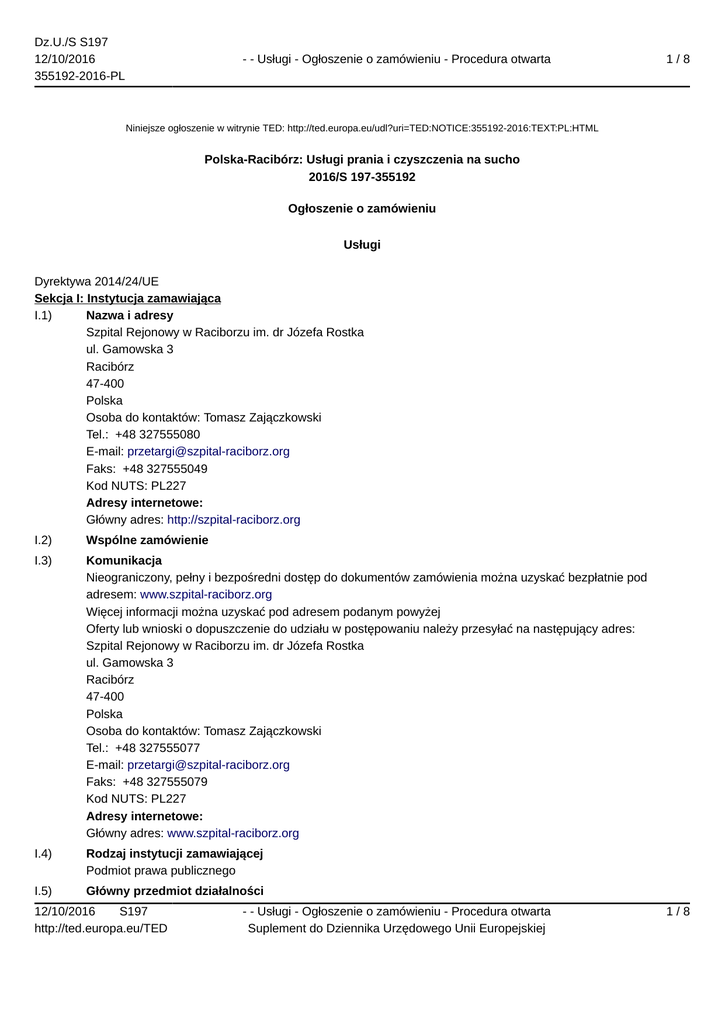 Dz.U./S S197 12/10/2016 355192-2016-PL - - Usługi - Ogłoszenie o zamówieniu - Procedura otwarta 1/8 Niniejsze ogłoszenie w witrynie TED: http://ted.europa.eu/udl?uri=TED:NOTICE:355192-2016:TEXT:PL:HTML Polska-Racibórz: Usługi prania i czyszczenia na sucho 2016/S 197-355192 Ogłoszenie o zamówieniu Usługi Dyrektywa 2014/24/UE Sekcja I: Instytucja zamawiająca I.1) Nazwa i adresy Szpital Rejonowy w Raciborzu im. dr Józefa Rostka ul. Gamowska 3 Racibórz 47-400 Polska Osoba do kontaktów: Tomasz Zajączkowski Tel.: +48 327555080 E-mail: [email protected] Faks: +48 327555049 Kod NUTS: PL227 Adresy internetowe: Główny adres: http://szpital-raciborz.org I.2) Wspólne zamówienie I.3) Komunikacja Nieograniczony, pełny i bezpośredni dostęp do dokumentów zamówienia można uzyskać bezpłatnie pod adresem: www.szpital-raciborz.org Więcej informacji można uzyskać pod adresem podanym powyżej Oferty lub wnioski o dopuszczenie do udziału w postępowaniu należy przesyłać na następujący adres: Szpital Rejonowy w Raciborzu im. dr Józefa Rostka ul. Gamowska 3 Racibórz 47-400 Polska Osoba do kontaktów: Tomasz Zajączkowski Tel.: +48 327555077 E-mail: [email protected] Faks: +48 327555079 Kod NUTS: PL227 Adresy internetowe: Główny adres: www.szpital-raciborz.org I.4) Rodzaj instytucji zamawiającej Podmiot prawa publicznego I.5) Główny przedmiot działalności 12/10/2016 S197 http://ted.europa.eu/TED - - Usługi - Ogłoszenie o zamówieniu - Procedura otwarta Suplement do Dziennika Urzędowego Unii Europejskiej 1/8 Dz.U./S S197 12/10/2016 355192-2016-PL - - Usługi - Ogłoszenie o zamówieniu - Procedura otwarta 2/8 Zdrowie Sekcja II: Przedmiot II.1) Wielkość lub zakres zamówienia II.1.1) Nazwa: Świadczenie w okresie 36 miesięcy usługi pralniczej dla Szpitala Rejonowego w Raciborzu. Numer referencyjny: 10/2016 II.1.2) Główny kod CPV 98310000 II.1.3) Rodzaj zamówienia Usługi II.1.4) Krótki opis: 1. Przedmiotem zamówienia jest świadczenie usług w zakresie prania bielizny szpitalnej, różnego rodzaju z oddziałów Szpitala w Raciborzu przy ul. Gamowskiej 3 w tym z oddziału obserwacyjno-zakaźnego. 2. Usługa wykonywana będzie w pralni oraz przy użyciu urządzeń i środków wykonawcy, przy czym pralnia musi posiadać zezwolenie właściwego organu sanitarno-epidemiologicznego. 3. Przedmiot zamówienia obejmuje pranie bielizny szpitalnej wraz z transportem. Usługa pralnicza wykonywana będzie na bieliźnie należącej do zamawiającego, w zakresie: a) pranie bielizny szpitalnej w ilości średnio 12 500 kg/m-c w tym: pościeli szpitalnej, bielizny fasonowej (barierowej bielizny chirurgicznej, odzieży ochronnej i roboczej), bielizny szpitalnej, kocy, materacy, zasłon parawanowych, ręczników, obrusów, ścierek, poduszek, kołder, mopów, b) dezynfekcja, prasowanie, maglowanie, usztywnianie, sortowanie, drobne reperacje, c) czyszczenie asortymentu nie nadającego się do prania wodnego. II.1.5) Szacunkowa całkowita wartość II.1.6) Informacje o częściach To zamówienie podzielone jest na części: nie II.2) Opis II.2.1) Nazwa: II.2.2) Dodatkowy kod lub kody CPV 98311000 II.2.3) Miejsce świadczenia usług Kod NUTS: PL227 Główne miejsce lub lokalizacja realizacji: Siedziba zamawiającego (przekazywanie i odbiór bielizny) oraz siedziba wykonawcy (właściwa usługa pralnicza). II.2.4) Opis zamówienia: 1. Zamówienie obejmuje świadczenie usługi pralniczej dla Szpitala Rejonowego w Raciborzu w tym z oddziału obserwacyjno-zakaźnego. 2. Przedmiotem zamówienia jest świadczenie przez okres 36 miesięcy usługi pralniczej obejmującej: a) pranie bielizny szpitalnej w ilości średnio 12 500 kg/m-c w tym: pościeli szpitalnej, bielizny fasonowej (barierowej bielizny chirurgicznej, odzieży ochronnej i roboczej), bielizny szpitalnej, kocy, materacy, zasłon parawanowych, ręczników, obrusów, ścierek, poduszek, kołder, mopów, b) dezynfekcja, prasowanie, maglowanie, usztywnianie, sortowanie, drobne reperacje, c) czyszczenie asortymentu nie nadającego się do prania wodnego, 12/10/2016 S197 http://ted.europa.eu/TED - - Usługi - Ogłoszenie o zamówieniu - Procedura otwarta Suplement do Dziennika Urzędowego Unii Europejskiej 2/8 Dz.U./S S197 12/10/2016 355192-2016-PL - - Usługi - Ogłoszenie o zamówieniu - Procedura otwarta 3/8 d) transport bielizny szpitalnej. 3. W postępowaniu mogą wziąć udział Wykonawcy: – dysponujący pralnią/pralniami spełniającymi wymogi ustawy z 5.12.2008 o zapobieganiu oraz zwalczaniu zakażeń i chorób zakaźnych u ludzi (tekst. jedn. Dz.U. 2013, poz. 947) oraz spełniający wszystkie wymagania sanitarne w zakresie prania i dezynfekcji bielizny potwierdzające systematyczne przeprowadzanie badań mikrobiologicznych powierzchni płaskich, wózków transportowych, rąk pracowników i skuteczności dezynfekcji komorowej i posiada aktualny dokument (zaświadczenie, opinia, decyzja, postanowienie) wydany przez Państwowego Powiatowego Inspektora Sanitarnego, — świadczący usługi pralnicze zgodne z wymaganiami Państwowego Zakładu Higieny oraz Państwowej Inspekcji Sanitarnej lub z wymaganiami uprawnionego podmiotu mającego siedzibę w innym państwie członkowskim Europejskiego Obszaru Gospodarczego, — świadczący usługi pralnicze przy użyciu środków piorąco-dezynfekcyjnych (dezynfekcja o spectrum działania bakteriobójczym, prątkobójczym, wirusobójczym, grzybobójczym, spory) posiadających niezbędne certyfikaty, atesty i wpisy do rejestrów dopuszczających ich stosowanie w zakładach opieki zdrowotnej, a w przypadku środków do prania bielizny noworodkowej, niemowlęcej i dziecięcej przy użyciu środków pozytywnie zaopiniowanych przez Instytut Matki i Dziecka lub Centrum Zdrowia Dziecka lub przez uprawniony podmiot mający siedzibę w innym państwie członkowskim Europejskiego Obszaru Gospodarczego, — spełniający poniższe wymogi techniczno-sprzętowe, tj.: a) pomieszczenia pralni będą