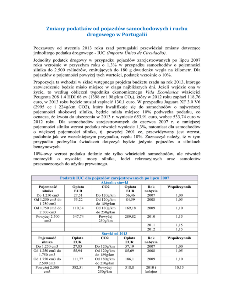 Zmiany podatków od pojazdów samochodowych i ruchu drogowego w Portugalii Począwszy od stycznia 2013 roku rząd portugalski przewidział zmiany dotyczące jednolitego podatku drogowego - IUC (Imposto Único de Circulação). Jednolity podatek drogowy w przypadku pojazdów zarejestrowanych po lipcu 2007 roku wzrośnie w przyszłym roku o 1,3% w przypadku samochodów o pojemności silnika do 2.500 cylindrów, emitujących do 180 g dwutlenku węgla na kilometr. Dla pojazdów o pojemności powyżej tych wartości, podatek wzrośnie o 10%. Propozycja ta wchodzi w skład wstępnego projektu budżetu rządu na rok 2013, którego zatwierdzenie będzie miało miejsce w ciągu najbliższych dni. Jeżeli wejdzie ona w życie, to według obliczeń tygodnika ekonomicznego Vida Económica właściciel Peugeota 208 1.4 HDI 68 cv (1398 cc i 98g/km CO2), który w 2012 roku zapłaci 118,76 euro, w 2013 roku będzie musiał zapłacić 130,1 euro. W przypadku Jaguara XF 3.0 V6 (2995 cc i 224g/km CO2), który kwalifikuje się do samochodów o najwyższej pojemności skokowej silnika, będzie miała miejsce 10% podwyżka podatku, co oznacza, że kwota do uiszczenia w 2013 r. wyniesie 653,91 euro, wobec 533,74 euro w 2012 roku. Dla samochodów zarejestrowanych do czerwca 2007 r. o mniejszej pojemności silnika wzrost podatku również wyniesie 1,3%, natomiast dla samochodów o większej pojemności silnika, tj. powyżej 2601 cc, przewidywany jest wzrost, podobnie jak we wcześniejszym przypadku, rzędu 10%. Zaznaczyć należy, iż w tym przypadku podwyżka świadczeń dotyczyć będzie jedynie pojazdów o silnikach benzynowych. 10%-owy wzrost podatku dotknie nie tylko właścicieli samochodów, ale również motocykli o wysokiej mocy silnika, łodzi rekreacyjnych oraz samolotów przeznaczonych do użytku prywatnego. Podatek IUC dla pojazdów zarejestrowanych po lipcu 2007 Pojemność silnika Do 1.250 cm3 Od 1.250 cm3 do 1.750 cm3 Od 1.750 cm3 do 2.500 cm3 Powyżej 2.500 cm3 Pojemność silnika Do 1.250 cm3 Od 1.250 cm3 do 1.750 cm3 Od 1.750 cm3 do 2.500 cm3 Powyżej 2.500 cm3 Opłata EUR 27,51 55,22 110,34 347,74 Opłata EUR 27,83 55,94 111,77 382,51 Aktualne stawki CO2 Opłata EUR Do 120g/km 56,46 Od 120g/km 84,59 do 189g/km Od 180g/km 169,18 do 250g/km Powyżej 289,82 250g/km Stawki od 2013 CO2 Opłata EUR Do 120g/km 57,19 Od 120g/km 85,69 do 189g/km Od 180g/km 186,1 do 250g/km Powyżej 318,8 250g/km Rok nabycia 2007 2008 Współczynnik 2009 1,10 2010 1,15 2011 2012 1,15 1,15 Rok nabycia 2007 2008 Współczynnik 2009 1,10 2010 i kolejne 10,15 1,00 1,05 1,00 1,05 2 IUC dla pojazdów zarejestrowanych do czerwca 2007 Na benzynę, pojemność silnika Do 1.000 Od 1.001 do 1.300 Od 1.301 do 1.750 Od 1.751 do 2.600 Powyżej 2.601 do 3.500 Powyżej 3.500 Na benzynę, pojemność silnika Do 1.000 Od 1.001 do 1.300 Od 1.301 do 1.750 Od 1.751 do 2.600 Powyżej 2.601 do 3.500 Powyżej 3.500 Inne (olej napędowy, itp), pojemność silnika Do 1.500 Od 1.501 do 2.000 Od 2.001 do 3.000 Powyżej 3.000 Inne (olej napędowy, itp), pojemność silnika Do 1.500 Od 1.501 do 2.000 Od 2.001 do 3.000 Powyżej 3.000 Aktualne stawki Napędzane elektrycznie Po 1995 Od 1990 do 1995 Od 1981 do 1989 Całkowite napięcie Do 100 Powyżej 100 17,25 € 34,61€ 10,87 € 19,45 € 7,63 € 10,87 € - 54,06 € 30,22 € 15,16 € - 137,17 € 72,35 € 31,26 € - 229,39 € 124,92 € 63,61€ 408,69 € Stawki od 2013 Napędzane elektrycznie Po 1995 209,94 € 96,46 € Od 1990 do 1995 Od 1981 do 1989 - Do 100 Powyżej 100 17,25 € 35,06€ 11,01 € 19,70 € 7,73 € 11,01 € - 54,76 € 30,61 € 15,36 € - 138,95 € 73,29 € 31,67 € - - 252,33 € 137,41 € 69,97 € - - 449,56 € 230,93 € 106,11 € Przy oczekiwanym wzroście IUC e przyszłym roku, dla kupujących jest to obecnie najlepszy czas na nabycie nowego samochodu, jako że ci, którzy kupią nowy pojazd do końca tego roku mogą korzystać z promocji, stosowanych przez producentów samochodów. Od stycznia do września br. zostało sprzedanych 86.803 pojazdów w Portugalii, co oznacza spadek w wysokości 42,1% w porównaniu do analogicznego okresu roku ubiegłego. Portugalskie Stowarzyszenie Samochodowe (ACAP - Associação Automóvel de Portugal) wymaga od rządu ponownego wprowadzenia Planu Zachęt Finansowych dla Pojazdów Wycofanych z Eksploatacji w celu zahamowania gwałtownych spadków sprzedaży. Jak do tej pory rząd nie rozważał możliwości włączenia tego instrumentu do projektu budżetu na rok 2013. Obserwowany ciągły spadek sprzedaży na rynku odbija się w dramatyczny sposób na kondycji firm handlowych z branży motoryzacyjnej. Jak podkreśla stowarzyszenie 3 ACAP w Hiszpanii przy spadku mniejszym niż w Portugalii ww. plan zachęt finansowych został wznowiony w dniu 1 października. Renault, BMW, Mercedes-Benz, Audi, Skoda, Volkswagen, Opel i Peugeot to tylko niektóre z marek, które przyznają się do repozycjonowania cen w celu dostosowania ich do spadku konsumpcji prywatnej. Mimo, że marże zysku są „zniwelowane do maksimum”, większość marek przejęła rolę państwa stosując zachęty finansowe dla demontażu samochodów wycofanych z eksploatacji. , Producenci i sprzedawcy samochodów markowych są zdania, że obecnie klienci są wręcz zobowiązani do racjonalnego potraktowania ewentualnej decyzji o zakupie samochodu i mało kto podejmuje się ryzyka wzięcia kredytu na samochód, nawet gdy marki „premium”, jak BMW, Mercedes, Porsche, Audi, Jaguar i Land Rover, przedstawiają klientom coraz to atrakcyjniejsze propozycje.. Rząd planuje ponadto dwie główne zmiany w ramach podatku od pojazdów - ISV (Imposto Sobre Veiculos). Ma zostać uchylona, stosowana dotychczas w przypadku pojazdów kempingowych, 15%-owa redukcja podatku ISV. Zwolnione natomiast z opłat tego podatku będą lekkie pojazdy dostawcze, czterokołowe, z wbudowaną kabiną w karoserii i o wadze brutto do 3500 kg. Proponowany na rok 2013 budżet państwa w