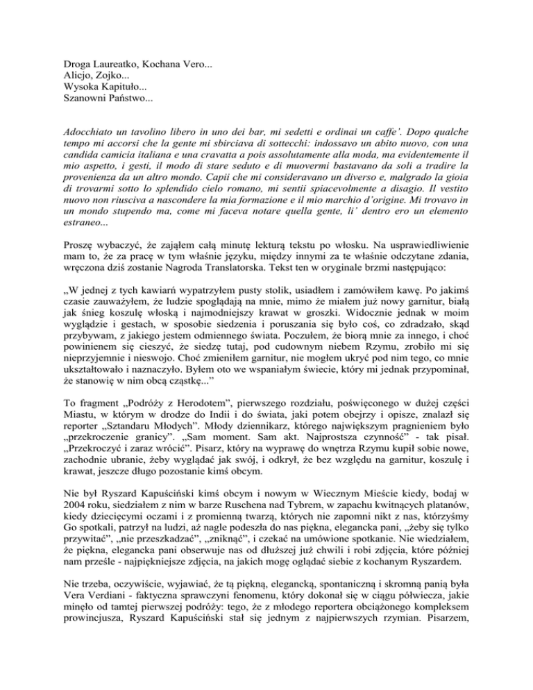 Droga Laureatko, Kochana Vero... Alicjo, Zojko... Wysoka Kapituło... Szanowni Państwo... Adocchiato un tavolino libero in uno dei bar, mi sedetti e ordinai un caffe’. Dopo qualche tempo mi accorsi che la gente mi sbirciava di sottecchi: indossavo un abito nuovo, con una candida camicia italiana e una cravatta a pois assolutamente alla moda, ma evidentemente il mio aspetto, i gesti, il modo di stare seduto e di muovermi bastavano da soli a tradire la provenienza da un altro mondo. Capii che mi consideravano un diverso e, malgrado la gioia di trovarmi sotto lo splendido cielo romano, mi sentii spiacevolmente a disagio. Il vestito nuovo non riusciva a nascondere la mia formazione e il mio marchio d’origine. Mi trovavo in un mondo stupendo ma, come mi faceva notare quella gente, li’ dentro ero un elemento estraneo... Proszę wybaczyć, że zająłem całą minutę lekturą tekstu po włosku. Na usprawiedliwienie mam to, że za pracę w tym właśnie języku, między innymi za te właśnie odczytane zdania, wręczona dziś zostanie Nagroda Translatorska. Tekst ten w oryginale brzmi następująco: „W jednej z tych kawiarń wypatrzyłem pusty stolik, usiadłem i zamówiłem kawę. Po jakimś czasie zauważyłem, że ludzie spoglądają na mnie, mimo że miałem już nowy garnitur, białą jak śnieg koszulę włoską i najmodniejszy krawat w groszki. Widocznie jednak w moim wyglądzie i gestach, w sposobie siedzenia i poruszania się było coś, co zdradzało, skąd przybywam, z jakiego jestem odmiennego świata. Poczułem, że biorą mnie za innego, i choć powinienem się cieszyć, że siedzę tutaj, pod cudownym niebem Rzymu, zrobiło mi się nieprzyjemnie i nieswojo. Choć zmieniłem garnitur, nie mogłem ukryć pod nim tego, co mnie ukształtowało i naznaczyło. Byłem oto we wspaniałym świecie, który mi jednak przypominał, że stanowię w nim obcą cząstkę...” To fragment „Podróży z Herodotem”, pierwszego rozdziału, poświęconego w dużej części Miastu, w którym w drodze do Indii i do świata, jaki potem obejrzy i opisze, znalazł się reporter „Sztandaru Młodych”. Młody dziennikarz, którego największym pragnieniem było „przekroczenie granicy”. „Sam moment. Sam akt. Najprostsza czynność” - tak pisał. „Przekroczyć i zaraz wrócić”. Pisarz, który na wyprawę do wnętrza Rzymu kupił sobie nowe, zachodnie ubranie, żeby wyglądać jak swój, i odkrył, że bez względu na garnitur, koszulę i krawat, jeszcze długo pozostanie kimś obcym. Nie był Ryszard Kapuściński kimś obcym i nowym w Wiecznym Mieście kiedy, bodaj w 2004 roku, siedziałem z nim w barze Ruschena nad Tybrem, w zapachu kwitnących platanów, kiedy dziecięcymi oczami i z promienną twarzą, których nie zapomni nikt z nas, którzyśmy Go spotkali, patrzył na ludzi, aż nagle podeszła do nas piękna, elegancka pani, „żeby się tylko przywitać”, „nie przeszkadzać”, „zniknąć”, i czekać na umówione spotkanie. Nie wiedziałem, że piękna, elegancka pani obserwuje nas od dłuższej już chwili i robi zdjęcia, które później nam prześle - najpiękniejsze zdjęcia, na jakich mogę oglądać siebie z kochanym Ryszardem. Nie trzeba, oczywiście, wyjawiać, że tą piękną, elegancką, spontaniczną i skromną panią była Vera Verdiani - faktyczna sprawczyni fenomenu, który dokonał się w ciągu półwiecza, jakie minęło od tamtej pierwszej podróży: tego, że z młodego reportera obciążonego kompleksem prowincjusza, Ryszard Kapuściński stał się jednym z najpierwszych rzymian. Pisarzem, którego Rzym wybrał na ojca chrzestnego Biblioteki Europejskiej - europejskiego instytutu kultury, miejsca spotkań ludzi, którzy w Jego właśnie myśli i w Jego stosunku do świata znaleźli wyraz własnej tożsamości. Sylwetkę intelektualną, etyczną i ludzką, którą rzymianie chcieliby pokazać światu jako znak europejskiej wartości rozmowy, bliskości, ciekawości. Kimś rozpoznawanym, do kogo na ulicy podchodziła młodzież, żeby podziękować i zapewnić, że to od niego uczy się postawy wobec innych, zwłaszcza wobec Afryki, stosunek do której jest dla młodych Włochów sprawdzianem człowieczeństwa, moralnych powołań i napięć. Vera Verdiani, jak obliczyłem, przetłumaczyła około 70 książek czy dużych tekstów. Mówię wyłącznie o utworach tłumaczonych z polskiego. Bo dużo przetłumaczyła też z francuskiego. Tych polskich książek było może nawet i 80, zależnie od tego, czy każdy dramat liczy się jako książkę, czy potrzeba do tego dopiero kilku dramatów zebranych. 70 więc, może 80 książek. Wśród nich - 15 Ryszarda Kapuścińskiego. Capii che mi consideravano un diverso e, malgrado la gioia di trovarmi sotto lo splendido cielo romano, mi sentii spiacevolmente a disagio. Il vestito nuovo non riusciva a nascondere la mia formazione e il mio marchio d’origine... „Choć zmieniłem garnitur, nie mogłem ukryć pod nim tego, co mnie ukształtowało i naznaczyło. Byłem oto we wspaniałym świecie, który mi jednak przypominał, że stanowię w nim obcą cząstkę...” Jaka strategia stoi za wyborami translatorskimi Very Verdiani? Zróbmy krok wstecz, do niewyobrażalnych dziś czasów, kiedy strategie były domeną wojskowych, a podstawą warsztatu tłumacza była miłość. Miłość do autora i jego książki. Miłość albo przyjaźń: to właściwie to samo. Ten krok do tyłu pozwoli nam na adekwatną dla pracy dzisiejszej Laureatki rezygnacji z pojęcia strategii na rzecz takich kategorii, jak „pokora” czy „postawa”. Jak w przytoczonej scenie ze stolikiem, gdzie to nie strategia, lecz przyjaźń, i jego oczywista konsekwencja - szacunek - kazała Verze zachować dystans do Ryszarda zajętego rozmową, ujawnić się w stosownej chwili na krótko, tylko po to, żeby powiedzieć „jestem”, a także po to, by nie doprowadzić do sytuacji, w której to on by ją zauważył, i może odniós