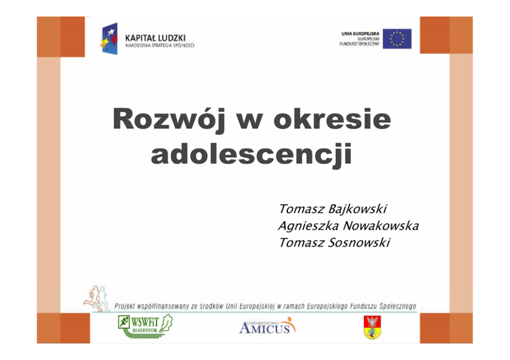 Tomasz Bajkowski Agnieszka Nowakowska Tomasz Sosnowski Inaczej zwana dorastaniem, to okres przejściowy między dzieciństwem i dorosłością. To okres wzmożonego rozwoju fizycznego, psychicznego (kształtowanie się osobowości i tożsamości), psychoseksualnego, społecznego. Początek tego stadium zwiastują zmiany zachodzące w ciele: dojrzewanie fizyczne i płciowe (obecnie ok. 10-11 r.ż.) Natomiast koniec tego stadium wyznacza gotowość do zmiany w zakresie rozwoju społecznego, a więc podejmowania dorosłych ról społecznych. POKWITANIE ( dojrzewanie, ok. 10 r.ż r.ż.) Pod wpł wpływem hormonó hormonów : Zmiany w wyglądzie i budowie ciała Budzi się seksualność Rozwój pierwszorzędnych i drugorzędnych cech płciowych CEL osiągnięcie gotowości do dawania nowego życia oraz ukształtowanie dojrzałej sylwetki Ciał Ciało nastolatka rozwija się się własnym rytmem, rytmem, co powoduje: Nieproporcjonalność, wydarzenia „niepunktualne” Napięcia emocjonalne, tzw. „okres burzy i naporu” (kumulacja zmian biologicznych z ich konsekwencjami społecznymi i psychologicznymi) Konflikty z rodzicami (przez hormony, estradiol u dziewcząt, testosteron u chłopców) Nieakceptowanie siebie, gdyż znane do tej pory ciało zmienia się i młody człowiek „traci w nim oparcie” – ciało zaczyna ono żyć własnym rytmem. Zmieniające się ciało nastolatka powoduje, że otoczenie zaczyna go traktować inaczej, a on sam zaczyna myśleć o sobie jak o osobie dorosłej. Wzrost poziomu hormonów wpływa na przebieg procesu emocjonalnego oraz na zachowania: U dziewczą dziewcząt wysoki poziom estradiolu podwyższa poziom agresji werbalnej, U chł chłopcó opców wysoki poziom testosteronu odpowiada za agresję instrumentalną, drażliwość i niecierpliwość. Obserwujemy obecnie tzw. trend sekularny, czyli przyspieszenie procesu dojrzewania płciowego i m.in. występowania u dziewcząt pierwszej miesiączki. Średni wiek pierwszej miesiączki zmieniał się na przestrzeni ostatnich 150 lat. W roku 1840 w zachodnich krajach uprzemysłowionych wynosił 17 lat – od tego czasu systematycznie się obniżał (z prędkością ok. 4 miesięcy na 10 lat). Proces ten uwarunkowany jest znacznymi zmianami trybu życia i dietą, w szczególności zwiększonym spożyciem produktó produktów bogatych w biał białko. ko W okresie adolescencji chłopcy stają się silniejsi, dzięki przyrostowi masy mięś mięśniowej ęśniowej, niowej dziewczęta natomiast nabierają tkanki tł tłuszczowej i zyskują, dzięki rozwojowi piersi, kobiecy wygląd. Uwarunkowania kulturowe i propagowane w mediach w danym społeczeństwie wizerunki kobiet i mężczyzn mają duży wpł wpływ na samoocenę samoocenę młodzieży w tym okresie. Zmiany w ciele, których adolescent nie rozumie lub nie akceptuje, zwłaszcza jeśli nie są zgodne z kulturowym wyobrażeniu o pięknym wyglądzie (np. chorobliwie szczupła sylwetka kobiet), mogą przyczyniać się do negatywnego wizerunku wł własnego ciał ciała. Nauczyciel wychowania fizycznego powinien ze szczególną uwagą i wrażliwością dostosowywać dostosowywać ćwiczenia i aktywności sportowe do możliwości uczniów: - Ze zrozumieniem akceptować akceptować zmiany zachodzące w ciele nastolatków, a także uczyć akceptacji tych zmian przez samych nastolatków; - Dobierać ćwiczenia tak, by uczniowie np. z nadwagą mogli z satysfakcją uczestniczyć w zajęciach. Taka postawa nie zniechę zniechęci tej grupy uczniów do aktywności sportowej w przyszłości, a może przyczynić się do pozytywnych zmian w ciele (np. spadek wagi, wzrost masy mięśniowej) i w poziomie samooceny. FUNKCJONOWANIE EMOCJONALNE (10(10-16/17 r.ż r.ż.) Labilność emocjonalna, wahania nastroju Nadmiernie silne reakcje emocjonalne (gdy rzeczywistość nie przystaje do wyobrażeń czy ideałów), zwłaszcza do osób znaczących, takich jak rodzice Buntowanie się przeciwko zastanym zasadom, aktualnej sytuacji Egocentryzm afektywny Negacja Uleganie naciskom ze strony grupy rówieśniczej Konflikty z rodzicami FUNKCJONOWANIE POZNAWCZE Myślenie refleksyjne – przewidywanie konsekwencji działań Myślenie z zastosowaniem operacji formalnych (od 11-12 r.ż.) – tj. już nie tylko logiczne, ale także hipotetyczno – dedukcyjne Początkowo egocentryzm poznawczy (widzenie świata tylko z własnej perspektywy), następnie zdolność do decentracji Zaniżone lub zawyżone poczucie własnej wartości Idealizowanie, np. miłości Intelektualny egocentryzm – przekonanie że to świat ma się podporządkować systemom, a nie systemy rzeczywistości CEL przygotowanie nastolatka do funkcjonowania w świecie ludzi dorosłych, podejmowania różnych ról, ze znajomością i rozumieniem zasad życia społecznego, organizacji państwa i różnych instytucji. W stadium adolescencji osobami tzw. znaczącymi w życiu człowieka stają się rówieś wieśnicy. nicy Przypomnijmy, że w poprzednim stadium wczesnoszkolnym (późnego dzieciństwa) byli to rodzice oraz nauczyciel. W związku z tym, bardzo ważne dla nastolatka jest budowanie swojej pozycji w grupie: grupie jest to kluczowe dla kształtowania samooceny, tożsamości i osobowości nastolatka. OBSZAR ZMIAN w rozwoju społecznym I. GRUPA RÓWIEŚNICZA – przynależność do niej może wzmocnić tożsamość nastolatka poczucie bezpieczeństwa, podzielanie zainteresowań, poglądów – potrzebne, gdy nastolatek nie akceptuje zmian w nim samym zachodzących całkowite identyfikowanie się z grupą, przejmowanie jej poglądów grupa przybliża dorastającemu reguły funkcjonowania społecznego oraz poszerza jakościowo i ilościowo jego interakcje społeczne pomaga oddalić się od rodziców, usamodzielnić. Kategorie grup rówieśniczych 1/ Klika - początek dorastania - 4-6 osób tej samej płci, silnie ze sobą związanych. Duża spójność i poziom intymności 2/ Paczka – łączące się kliki, przedstawiciele obu p