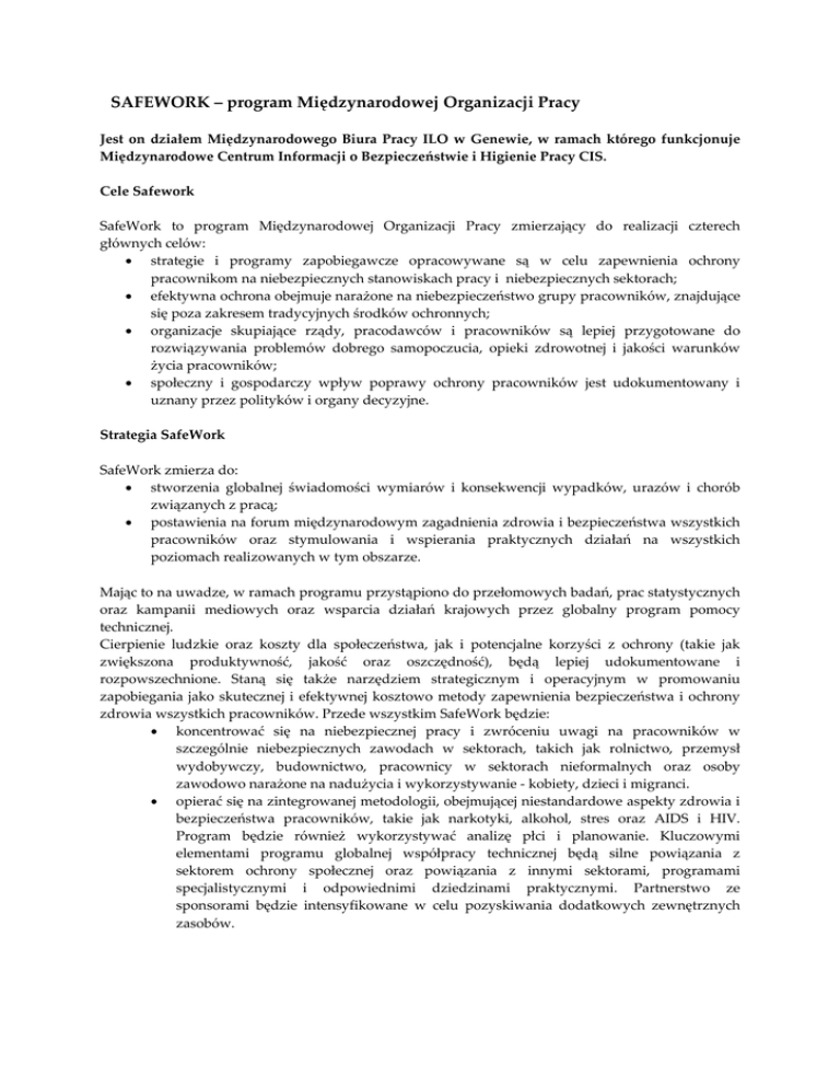 SAFEWORK – program Międzynarodowej Organizacji Pracy Jest on działem Międzynarodowego Biura Pracy ILO w Genewie, w ramach którego funkcjonuje Międzynarodowe Centrum Informacji o Bezpieczeństwie i Higienie Pracy CIS. Cele Safework SafeWork to program Międzynarodowej Organizacji Pracy zmierzający do realizacji czterech głównych celów: • strategie i programy zapobiegawcze opracowywane są w celu zapewnienia ochrony pracownikom na niebezpiecznych stanowiskach pracy i niebezpiecznych sektorach; • efektywna ochrona obejmuje narażone na niebezpieczeństwo grupy pracowników, znajdujące się poza zakresem tradycyjnych środków ochronnych; • organizacje skupiające rządy, pracodawców i pracowników są lepiej przygotowane do rozwiązywania problemów dobrego samopoczucia, opieki zdrowotnej i jakości warunków życia pracowników; • społeczny i gospodarczy wpływ poprawy ochrony pracowników jest udokumentowany i uznany przez polityków i organy decyzyjne. Strategia SafeWork SafeWork zmierza do: • stworzenia globalnej świadomości wymiarów i konsekwencji wypadków, urazów i chorób związanych z pracą; • postawienia na forum międzynarodowym zagadnienia zdrowia i bezpieczeństwa wszystkich pracowników oraz stymulowania i wspierania praktycznych działań na wszystkich poziomach realizowanych w tym obszarze. Mając to na uwadze, w ramach programu przystąpiono do przełomowych badań, prac statystycznych oraz kampanii mediowych oraz wsparcia działań krajowych przez globalny program pomocy technicznej. Cierpienie ludzkie oraz koszty dla społeczeństwa, jak i potencjalne korzyści z ochrony (takie jak zwiększona produktywność, jakość oraz oszczędność), będą lepiej udokumentowane i rozpowszechnione. Staną się także narzędziem strategicznym i operacyjnym w promowaniu zapobiegania jako skutecznej i efektywnej kosztowo metody zapewnienia bezpieczeństwa i ochrony zdrowia wszystkich pracowników. Przede wszystkim SafeWork będzie: • koncentrować się na niebezpiecznej pracy i zwróceniu uwagi na pracowników w szczególnie niebezpiecznych zawodach w sektorach, takich jak rolnictwo, przemysł wydobywczy, budownictwo, pracownicy w sektorach nieformalnych oraz osoby zawodowo narażone na nadużycia i wykorzystywanie ‐ kobiety, dzieci i migranci. • opierać się na zintegrowanej metodologii, obejmującej niestandardowe aspekty zdrowia i bezpieczeństwa pracowników, takie jak narkotyki, alkohol, stres oraz AIDS i HIV. Program będzie również wykorzystywać analizę płci i planowanie. Kluczowymi elementami programu globalnej współpracy technicznej będą silne powiązania z sektorem ochrony społecznej oraz powiązania z innymi sektorami, programami specjalistycznymi i odpowiednimi dziedzinami praktycznymi. Partnerstwo ze sponsorami będzie intensyfikowane w celu pozyskiwania dodatkowych zewnętrznych zasobów. Dla każdego z czterech celów, szczegółowe strategie są omówione poniżej i obejmują zdobywanie poparcia, budowanie podstaw wiedzy, budowanie potencjału poszczególnych członków oraz wsparcie bezpośrednich działań. Należy udowodnić, że ochrona popłaca. Zapobieganie wypadkom, poprawienie warunków pracy oraz egzekwowanie standardów są często postrzegane jako zbędne koszty dla przedsiębiorstwa. Niewiele się mówi o kosztach niezapobiegania wypadkom lub kosztach złych warunków pracy ani korzyściach z poprawienia produktywności i konkurencyjności. Lepsze informacje oraz narzędzia analityczne mogą zwiększyć chęć firm i rządów do inwestowania w zapobieganie. Powyższa strategia będzie miała dwa cele: poszerzenie wiedzy poprzez dążenie do uzyskania kompleksowych, wiarygodnych i trwałych danych oraz rozpoczęcie nowych badań w dziedzinie ekonomiki ochrony pracy. Program będzie stymulować rozwój kultury bezpieczeństwa na całym świecie, przez co udowodni, że strategie i programy zapobiegania zapewniają korzyści wszystkim członkom ILO. Ochrona pracowników w niebezpiecznych warunkach Priorytet należy przyznać pracownikom w najbardziej niebezpiecznych zawodach i sektorach takich jak przemysł wydobywczy, budownictwo lub rolnictwo, bądź w których stosunki w pracy lub warunki pracy stwarzają szczególne ryzyko (takie jak bardzo długie godziny pracy, narażenie na niebezpieczne chemikalia, praca w odosobnieniu oraz praca migrantów itd.). ILO będzie korzystać z dotychczasowych doświadczeń w zakresie budowy standardów, kodeksów praktyki i technicznych wskazówek w procesie wykorzystywania globalnych źródeł informacji i opracowywania środków praktycznego działania. Kraje członkowskie będzie się zachęcać do ustalenia celów i dążeń w obszarze ochrony pracowników zatrudnionych w niebezpiecznych warunkach. Szczególną uwagę będzie się zwracać na wzmocnienie potencjału inspektoratów pracy w zakresie doradztwa i egzekwowania regulacji. Rozszerzenie ochrony Znacząca większość pracowników, których warunki pracy wymagają poprawy, jest wyłączona z zakresu istniejących legislacji i innych środków ochronnych. Obowiązujące strategie i programy należy poddać weryfikacji w celu rozszerzenia ich podmiotowego zakresu. Będzie się to odbywać równolegle z działaniami wzmocnienia potencjału inspektoratów pracy w kwestii opracowywania strategii i programów zapobiegania oraz promowania ochrony najbardziej narażonych na niebezpieczeństwo pracowników, szczególnie płci żeńskiej. Partnerstwo i sieci współpracy będą rozszerzane, aby objąć zasięgiem ministerstwo zdrowia, przemysłu, lokalne władze rządowe, jak i lokalne wspólnoty. Nacisk zostanie położony na osiąganie wymiernych celów poprzez praktyczne działania i wymianę informacji o najlepszych praktykach. Promocja zdrowia i dobrego samopoczucia pracowników Strategia promowania zdrowia i dobrego samopoczucia pracowników będzie wiązała się ze stworzeniem banku danych na temat strategii, program