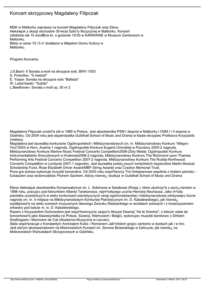 Koncert skrzypcowy Magdaleny Filipczak MDK w Malborku zaprasza na koncert Magdaleny Filipczak oraz Eleny Aleksiejuk z okazji obchodów 35-lecia Szko³y Muzycznej w Malborku. Koncert odbêdzie siê 15 wrze¶nia br. o godzinie 19:00 w KARWANIE w Muzeum Zamkowym w Malborku. Bilety w cenie 10 i 5 z³ dostêpne w Miejskim Domu Kultury w Malborku. Program Koncertu: J.S.Bach- II Sonata a-moll na skrzypce solo, BWV 1003 S. Prokofiev- "5 melodii" E. Ysaye- Sonata na skrzypce solo "Ballada" W. Lutos³awski- "Subito" L.Beethoven- Sonata c-moll op. 30 nr 2 Magdalena Filipczak urodzi³a siê w 1985 w Polsce. Jest absolwentka PSM I stopnia w Malborku i OSM I i II stopnia w Gdañsku. Od 2004 roku jest stypendystka Guildhall School of Music and Drama w klasie skrzypiec Profesora Krzysztofa ¦mietany. Magdalena jest laureatka konkursów Ogólnopolskich i Miêdzynarodowych (m. in. Miêdzynarodowy Konkurs "AllegroVivo"2003 w Horn, Austria-1 nagroda, Ogólnopolski Konkurs Eugenii Uminskiej w Poznaniu 2005-2 nagroda, Miêdzynarodowy Konkurs Marlow Music Festival Concerto Competition2006-Zloty Medal, Ogólnopolski Konkurs Instrumentalistów Smyczkowych w Krakowie2006-2 nagroda, Miêdzynarodowy Konkurs The Richmond upon Thames Performing Arts Festival Concerto Competition 2007-2 nagroda, Miêdzynarodowy Konkurs The Ruislip-Northwood Concerto Competition w Londynie 2007-1 nagroda). Jest laureatka presti¿owych londyñskich stypendiów Martin Musical Scholarship Fund, Rose Elizabeth Driver Award/MBF String Awards oraz Craxton Memorial Trust. Poza gra solowa wykonuje muzykê kameralna. Od 2003 roku wspó³tworzy Trio fortepianowe wspólnie z bratem pianist± £ukaszem oraz wiolonczelist± Piotrem Gachem, którzy równie¿ studiuj± w Guildhall School of Music and Drama Elena Aleksiejuk absolwentka Konserwatorium im. L. Sobinowa w Saratowie (Rosja ), które ukoñczy³a z wyró¿nieniem w 1988 roku, pracuj±c pod kierunkiem Alberta Tarakanowa, najm³odszego ucznia Henryka Neuhausa. Jako m³oda pianistka uczestniczy³a w wielu konkursach pianistycznych rangi ogólnoradzieckiej i miêdzynarodowej zdobywaj±c liczne nagrody (m. in. II miejsce na Miêdzynarodowym Konkursie Pianistycznym im. D. Kabalewskiego), jak równie¿ wystêpowa³a na wielu scenach muzycznych dawnego Zwi±zku Radzieckiego w recitalach solowych i z towarzyszeniem orkiestry pod batut± m. in. D. Kabalewskiego. Razem z Krzysztofem D±browskim jest wspó³twórczyni± zespo³u Muzyki Dawnej "Ad te Domine", z którym wiele lat koncertowa³a jako klawesynistka (w Polsce, Szwecji, Niemczech i Belgii). wykonuj±c muzykê barokow± z Dirkiem Snellingsem i Marnixem de Cat (Akademia Muzyczna w Leuven) Stale wspó³pracuje z Konstantym Andrzejem Kulk± i Romanem Jab³oñskim graj±c zarówno w duetach jak i w trio. Jest sta³ym akompaniatorem na Mistrzowskich Kursach im. Zenona Brzewskiego w £añcucie, jak równie¿ na Mistrzowskich Warsztatach Skrzypcowych w Gdañsku. http://www.malbork.pl/um/ - Malbork, Urz±d Miasta Page created by www.kraszewski.pl Generated: 4 March, 2017, 04:27