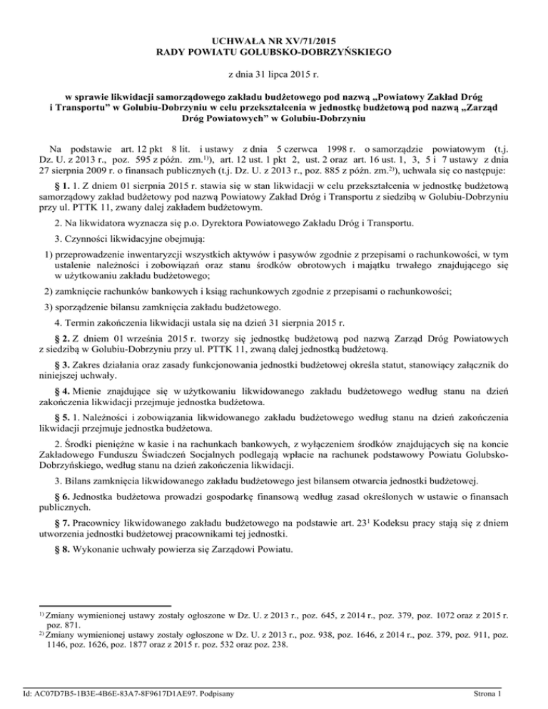 UCHWAŁA NR XV/71/2015 RADY POWIATU GOLUBSKO-DOBRZYŃSKIEGO z dnia 31 lipca 2015 r. w sprawie likwidacji samorządowego zakładu budżetowego pod nazwą „Powiatowy Zakład Dróg i Transportu” w Golubiu-Dobrzyniu w celu przekształcenia w jednostkę budżetową pod nazwą „Zarząd Dróg Powiatowych” w Golubiu-Dobrzyniu Na podstawie art. 12 pkt 8 lit. i ustawy z dnia 5 czerwca 1998 r. o samorządzie powiatowym (t.j. Dz. U. z 2013 r., poz. 595 z późn. zm.1)), art. 12 ust. 1 pkt 2, ust. 2 oraz art. 16 ust. 1, 3, 5 i 7 ustawy z dnia 27 sierpnia 2009 r. o finansach publicznych (t.j. Dz. U. z 2013 r., poz. 885 z późn. zm.2)), uchwala się co następuje: § 1. 1. Z dniem 01 sierpnia 2015 r. stawia się w stan likwidacji w celu przekształcenia w jednostkę budżetową samorządowy zakład budżetowy pod nazwą Powiatowy Zakład Dróg i Transportu z siedzibą w Golubiu-Dobrzyniu przy ul. PTTK 11, zwany dalej zakładem budżetowym. 2. Na likwidatora wyznacza się p.o. Dyrektora Powiatowego Zakładu Dróg i Transportu. 3. Czynności likwidacyjne obejmują: 1) przeprowadzenie inwentaryzcji wszystkich aktywów i pasywów zgodnie z przepisami o rachunkowości, w tym ustalenie należności i zobowiązań oraz stanu środków obrotowych i majątku trwałego znajdującego się w użytkowaniu zakładu budżetowego; 2) zamknięcie rachunków bankowych i ksiąg rachunkowych zgodnie z przepisami o rachunkowości; 3) sporządzenie bilansu zamknięcia zakładu budżetowego. 4. Termin zakończenia likwidacji ustala się na dzień 31 sierpnia 2015 r. § 2. Z dniem 01 września 2015 r. tworzy się jednostkę budżetową pod nazwą Zarząd Dróg Powiatowych z siedzibą w Golubiu-Dobrzyniu przy ul. PTTK 11, zwaną dalej jednostką budżetową. § 3. Zakres działania oraz zasady funkcjonowania jednostki budżetowej określa statut, stanowiący załącznik do niniejszej uchwały. § 4. Mienie znajdujące się w użytkowaniu likwidowanego zakładu budżetowego według stanu na dzień zakończenia likwidacji przejmuje jednostka budżetowa. § 5. 1. Należności i zobowiązania likwidowanego zakładu budżetowego według stanu na dzień zakończenia likwidacji przejmuje jednostka budżetowa. 2. Środki pieniężne w kasie i na rachunkach bankowych, z wyłączeniem środków znajdujących się na koncie Zakładowego Funduszu Świadczeń Socjalnych podlegają wpłacie na rachunek podstawowy Powiatu GolubskoDobrzyńskiego, według stanu na dzień zakończenia likwidacji. 3. Bilans zamknięcia likwidowanego zakładu budżetowego jest bilansem otwarcia jednostki budżetowej. § 6. Jednostka budżetowa prowadzi gospodarkę finansową według zasad określonych w ustawie o finansach publicznych. § 7. Pracownicy likwidowanego zakładu budżetowego na podstawie art. 231 Kodeksu pracy stają się z dniem utworzenia jednostki budżetowej pracownikami tej jednostki. § 8. Wykonanie uchwały powierza się Zarządowi Powiatu. 1) Zmiany wymienionej ustawy zostały ogłoszone w Dz. U. z 2013 r., poz. 645, z 2014 r., poz. 379, poz. 1072 oraz z 2015 r. poz. 871. 2) Zmiany wymienionej ustawy zostały ogłoszone w Dz. U. z 2013 r., poz. 938, poz. 1646, z 2014 r., poz. 379, poz. 911, poz. 1146, poz. 1626, poz. 1877 oraz z 2015 r. poz. 532 oraz poz. 238. Id: AC07D7B5-1B3E-4B6E-83A7-8F9617D1AE97. Podpisany Strona 1 § 9. Uchyla się uchwałę Nr IX/49/07 Rady Powiatu Golubsko-Dobrzyńskiego z dnia 16 maja 2007 r. w sprawie utworzenia zakładu budżetowego pod nazwą Zarząd Dróg Powiatowych w Golubiu-Dobrzyniu oraz uchwałę Nr VII/49/11 Rady Powiatu Golubsko-Dobrzyńskiego z dnia 5 kwietnia 2011 r. w sprawie zmiany uchwały w sprawie utworzenia zakładu budżetowego pod nazwą Zarząd Dróg Powiatowych w Golubiu-Dobrzyniu. § 10. Uchwała wchodzi w życie z dniem podjęcia. Przewodnicząca Rady Powiatu Golubsko-Dobrzyńskiego Maria Wiśniewska Id: AC07D7B5-1B3E-4B6E-83A7-8F9617D1AE97. Podpisany Strona 2 Załącznik do Uchwały Nr XV/71/2015 Rady Powiatu Golubsko-Dobrzyńskiego z dnia 31 lipca 2015 r. STATUT ZARZĄDU DRÓG POWIATOWYCH W GOLUBIU-DOBRZYNIU Rozdział 1. POSTANOWIENIA OGÓLNE § 1. Zarząd Dróg Powiatowych w Golubiu-Dobrzyniu, zwany dalej „Zarządem Dróg”, działa na podstawie: 1. uchwały Nr XV/71/2015 Rady Powiatu Golubsko-Dobrzyńskiego z dnia 31 lipca 2015 r. w sprawie likwidacji samorządowego zakładu budżetowego pod nazwą „Powiatowy Zakład Dróg i Transportu” w GolubiuDobrzyniu w celu przekształcenia w jednostkę budżetową pod nazwą „Zarząd Dróg Powiatowych” w GolubiuDobrzyniu. 2. ustawy z dnia 21 marca 1985 r. o drogach publicznych (tj. Dz.U. z 2015 r., poz. 460 z późn. zm.); 3. ustawy dnia 5 czerwca 1998 r. o samorządzie powiatowym (tj. Dz.U. z 2013 r., poz. 595 z późn. zm.); 4. ustawy z dnia 27 sierpnia 2009 r. o finansach publicznych (t.j. Dz. U. z 2013 r., poz. 885 z późn. zm.); 5. regulaminu organizacyjnego Zarządu Dróg Powiatowych w Golubiu-Dobrzyniu; 6. niniejszego Statutu. § 2. 1. Zarząd Dróg jest jednostką organizacyjną Powiatu Golubsko-Dobrzyńskiego nieposiadającą osobowości prawnej, działającą w formie jednostki budżetowej w rozumieniu ustawy o finansach publicznych. 2. Obszarem działania Zarządu Dróg jest teren Powiatu Golubsko-Dobrzyńskiego. 3. Siedzibą Zarządu Dróg jest miasto Golub-Dobrzyń. 4. Zarząd Dróg wykonuje obowiązki zarządcy dróg powiatowych zgodnie z ustawą o drogach publicznych. 5. Nadzór nad działalnością Zarządu Dróg sprawuje Zarząd Powiatu Golubsko-Dobrzyńskiego. Rozdział 2. PRZEDMIOT DZIAŁALNOŚCI § 3. 1. Zarząd Dróg realizuje zadania związane z budową, modernizacją, utrzymaniem i ochroną dróg powiatowych w granicach Powiatu Golubsko-Dobrzyńskiego. 2. Do zadań Zarządu Dróg w szczególności należy: 1) opracowywanie projektów planów rozwoju sieci drogowej oraz bieżące informowanie o tych planach organów właściwych do sporządzania miejscowych planów zagospodarowania przestrzennego; 2) opraco
