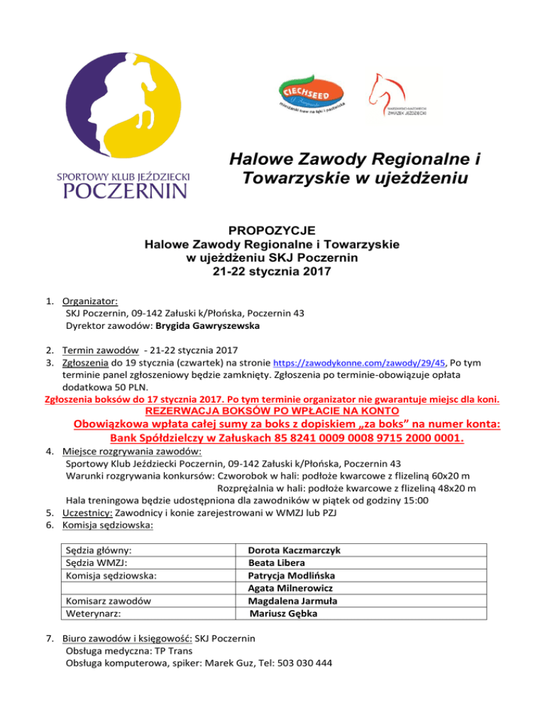 Halowe Zawody Regionalne i Towarzyskie w ujeżdżeniu PROPOZYCJE Halowe Zawody Regionalne i Towarzyskie w ujeżdżeniu SKJ Poczernin 21-22 stycznia 2017 1. Organizator: SKJ Poczernin, 09-142 Załuski k/Płońska, Poczernin 43 Dyrektor zawodów: Brygida Gawryszewska 2. Termin zawodów - 21-22 stycznia 2017 3. Zgłoszenia do 19 stycznia (czwartek) na stronie https://zawodykonne.com/zawody/29/45, Po tym terminie panel zgłoszeniowy będzie zamknięty. Zgłoszenia po terminie-obowiązuje opłata dodatkowa 50 PLN. Zgłoszenia boksów do 17 stycznia 2017. Po tym terminie organizator nie gwarantuje miejsc dla koni. REZERWACJA BOKSÓW PO WPŁACIE NA KONTO Obowiązkowa wpłata całej sumy za boks z dopiskiem „za boks” na numer konta: Bank Spółdzielczy w Załuskach 85 8241 0009 0008 9715 2000 0001. 4. Miejsce rozgrywania zawodów: Sportowy Klub Jeździecki Poczernin, 09-142 Załuski k/Płońska, Poczernin 43 Warunki rozgrywania konkursów: Czworobok w hali: podłoże kwarcowe z flizeliną 60x20 m Rozprężalnia w hali: podłoże kwarcowe z flizeliną 48x20 m Hala treningowa będzie udostępniona dla zawodników w piątek od godziny 15:00 5. Uczestnicy: Zawodnicy i konie zarejestrowani w WMZJ lub PZJ 6. Komisja sędziowska: Sędzia główny: Sędzia WMZJ: Komisja sędziowska: Komisarz zawodów Weterynarz: Dorota Kaczmarczyk Beata Libera Patrycja Modlińska Agata Milnerowicz Magdalena Jarmuła Mariusz Gębka 7. Biuro zawodów i księgowość: SKJ Poczernin Obsługa medyczna: TP Trans Obsługa komputerowa, spiker: Marek Guz, Tel: 503 030 444 8. Program zawodów (orientacyjna godzina rozpoczęcia zostanie podana po zamknięciu listy zgłoszeń i będzie uzależniona od ilości zgłoszonych koni): Sobota, 20 stycznia 2017 Konkurs nr 1, Klasa L, program L2 Konkurs nr 1 Kuce, Klasa L, program L2 Konkurs nr 1 Towarzyskie Klasa L, program L2 Konkurs nr 2, Klasa P, program P2 Konkurs nr 2 Kuce, Klasa P, program P2 Konkurs nr 2 Towarzyskie Klasa P, program P2 Konkurs nr 3, Konkurs nr 4, Konkurs nr 5, Konkurs nr 6, Konkurs nr 7, Konkurs nr 8, Klasa D, program D2 Klasa N, program N2 Kuce Klasa N, program N4 Klasa C, program C1 Klasa CC, program CC4 Klasa CS, program CS1 Niedziela, 21 stycznia 2017 Konkurs nr 9, Klasa L, program L3 Konkurs nr 9 Kuce, Klasa L, program L3 Konkurs nr 9 Towarzyskie Klasa L, program L3 Konkurs nr 10, Klasa P, program P3 Konkurs nr 10 Kuce, Klasa P, program P3 Konkurs nr 10 Towarzyskie Klasa P, program P3 Konkurs nr 11, Konkurs nr 12, Konkurs nr 13, Konkurs nr 14, Konkurs nr 15, Konkurs nr 16, Klasa D, program D3 Klasa N, program N3 Kuce Klasa N, program N5 Klasa C, program C2 Klasa CC, program CC5 Klasa CS, program CS2 Na życzenia zawodnik może wystartować w dowolnym programie i KÜR w danej klasie po uprzednim zgłoszeniu telefonicznym: Tel: 503 030 444. Przejazd będzie traktowany jako dodatkowy i nie przewiduje się w nim nagród i pucharów. Wszystkie konkursy będą rozgrywane na czworoboku 60x20m. Wszystkie zgłoszone kuce będą ujęte w oddzielnej klasyfikacji. Obowiązują programy edycja 2015 Wstępne godziny rozpoczęcia poszczególnych konkursów oraz wstępne listy startowe opublikowane będą w piątek po 14:00 na stronie https://zawodykonne.com/zawody/29/45, Zostaną również rozesłane drogą mailową do wszystkich, którzy przysłali zgłoszenia. 9. Zawody rozgrywane zgodnie z Przepisami i Regulaminem PZJ. Zawodników i konie obowiązuje dokumentacja wg regulaminów i przepisów PZJ. Konkursy „open” (towarzyskie) rozgrywaną są zgodnie z Uchwałą PZJ z dnia 20.12.2013 oraz z równą dbałością o konie, zawodników i rywalizację sportową jak konkursy ZR. Osoby bez licencji (niezarejestrowane), w konkursach „open” (towarzyskich), obowiązują: aktualne badania lekarskie, ubezpieczenie NNW oraz w przypadku osób niepełnoletnich zgoda rodziców lub opiekunów prawnych. 10. W przypadku koni w konkursach „open” (towarzyskie) – wymagany jest minimum paszport urzędowy z aktualnymi szczepieniami. 11. Nie przewiduje się odprawy technicznej. Zawodnicy zobowiązani są do przedstawienia dokumentów i wniesienia opłat na min. 1 godzinę przed rozpoczęciem danego konkursu. 12. Opłaty: Wpisowe Jeden dzień - 120 PLN Dwa dni - 200 PLN Startowe Konkursy L, P, D - 20 PLN za jeden start N - 30 PLN za jeden start C, CC1, CS - 40 PLN za jeden start REZERWACJA BOKSÓW PO WPŁACIE NA KONTO Obowiązkowa wpłata całej sumy za boks z dopiskiem „za boks” na numer konta: Bank Spółdzielczy w Załuskach 85 8241 0009 0008 9715 2000 0001 Boksy: Boksy cena - stajnia murowana - 250 PLN za cale zawody - stajnia namiotowa – 200 PLN za cale zawody 1 dzień cena - 100 PLN Ilość boksów ograniczona. Proszę o terminowe zgłaszanie zapotrzebowania na boksy wraz z uwagami. Pytania w sprawie boksów – Eugeniusz Koczorski, tel: 601 397 770, Zmiany na listach startowych dopuszczalne są w przypadkach zgodnych z Przepisami PZJ oraz w innych przypadkach najpóźniej na godzinę przed rozpoczęciem danego konkursu. Pozostałe zmiany – opłata manipulacyjna 30 PLN Zgłoszenia po terminie – opłata 50 PLN 13. Nagrody: W wszystkich konkursach w sobotę - floot’s i puchary oraz startowe. W niedzielę floot’s i puchary, startowe oraz nagrody rzeczowe. Organizator zastrzega sobie prawo ograniczenia liczby wypłacanych nagród: do 4 przejazdów – płatne 1. miejsce od 5 do 8 przejazdów – płatne miejsca 1-2. od 9 do 12 przejazdów – płatne miejsce 1-3. od 13 do 16 przejazdów – płatne miejsca 1-4 14. Na terenie zawodów zapewniony będzie catering. Organizator zapewnia parking dla koniowodów. Podłączenie do prądu – 80 PLN/doba. 15. Noclegi: Hotel klubowy SKJ Poczernin – 60 PLN/osoba. Tel. (23) 662 95 59 Hotel „Poświętne” – odległość ok. 6 km. Tel. 236630740; 236624272 Cena pokoi: 1 os. / 82 PLN; 2 os. / 124 PLN;, 3 os/186 PLN, 4 os. / 2018 PLN; 5 os. / 260 PLN ( przystosowany dla niepełnosprawnych) Hotel „Dworek Marzenie” – ok