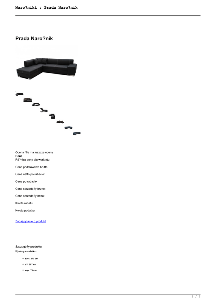 Naro?niki : Prada Naro?nik Prada Naro?nik Ocena Nie ma jeszcze oceny Cena Ró?nica ceny dla wariantu Cena podstawowa brutto: Cena netto po rabacie: Cena po rabacie Cena sprzeda?y brutto: Cena sprzeda?y netto: Kwota rabatu: Kwota podatku: Zadaj pytanie o produkt Szczegó?y produktu Wymiary naro?nika : szer. 270 cm d?. 207 cm wys. 73 cm 1 / 2 Naro?niki : Prada Naro?nik Powierzchnia spania : szer. 130 cm d?. 200 cm Naro?nik + zag?ówki : szer. 270 cm d?. 207 cm wys. 88 cm 2 / 2 Powered by TCPDF (www.tcpdf.org)